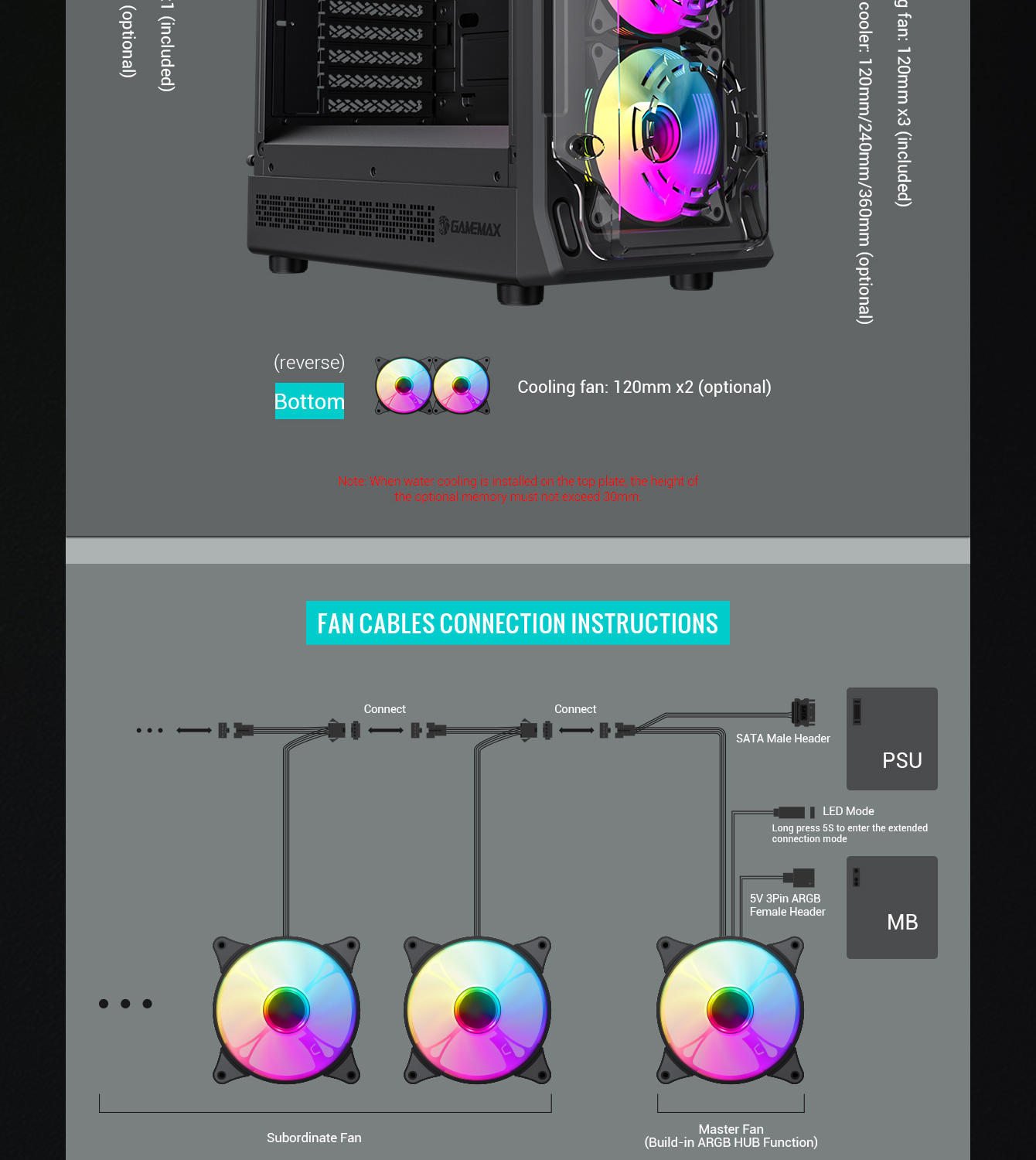 | Water Cooling Support (Radiator Size) | Front | 120mm, 240mm,360mm |