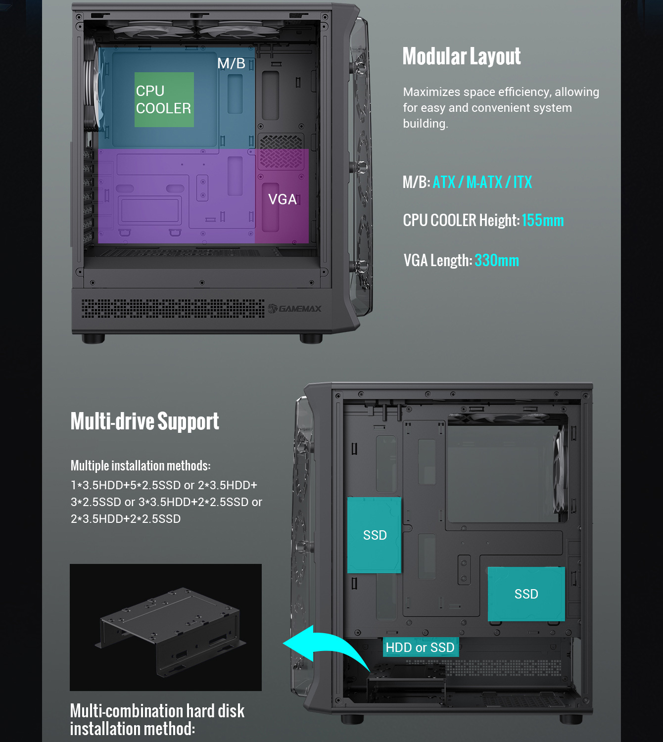 • High Compatibility: Fits ATX, M-ATX, and ITX motherboards, with room for graphics cards up to 330mm and CPU coolers up to 155mm.