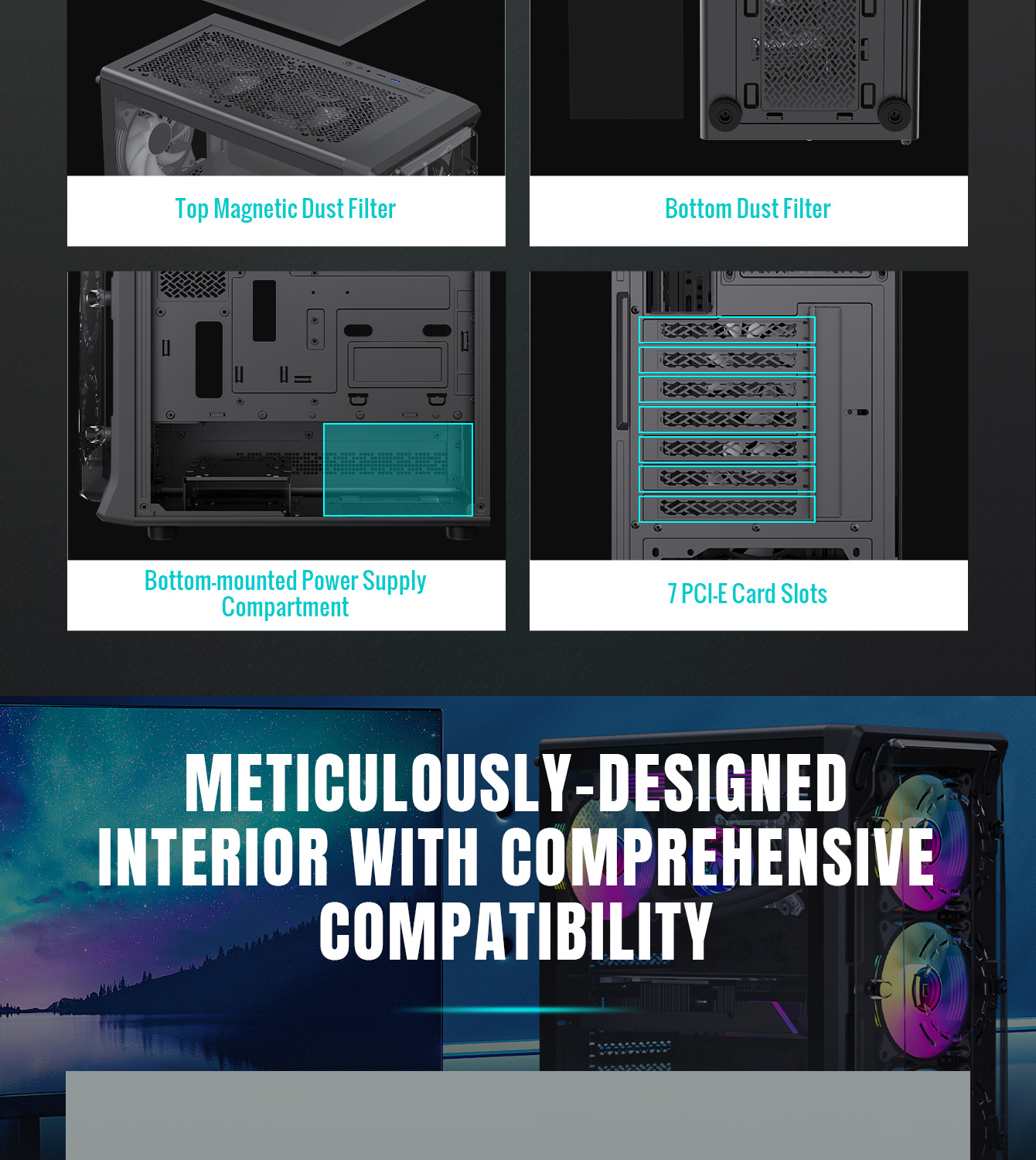 • Excellent Cooling: Supports up to 3x 120mm front fans, 2x 120mm/140mm top fans, and water cooling options (120mm, 240mm, 360mm radiators).
