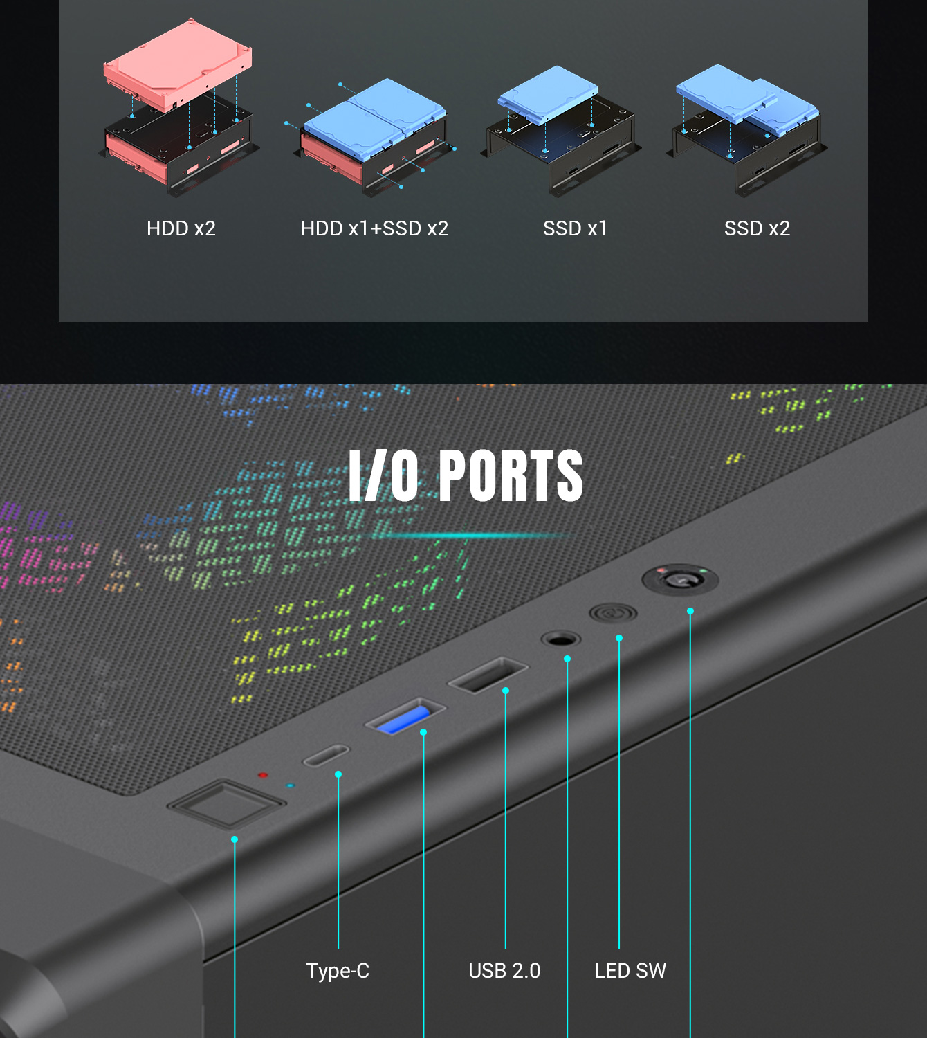• Flexible Storage: Supports multiple HDD and SSD combinations for versatile storage options.