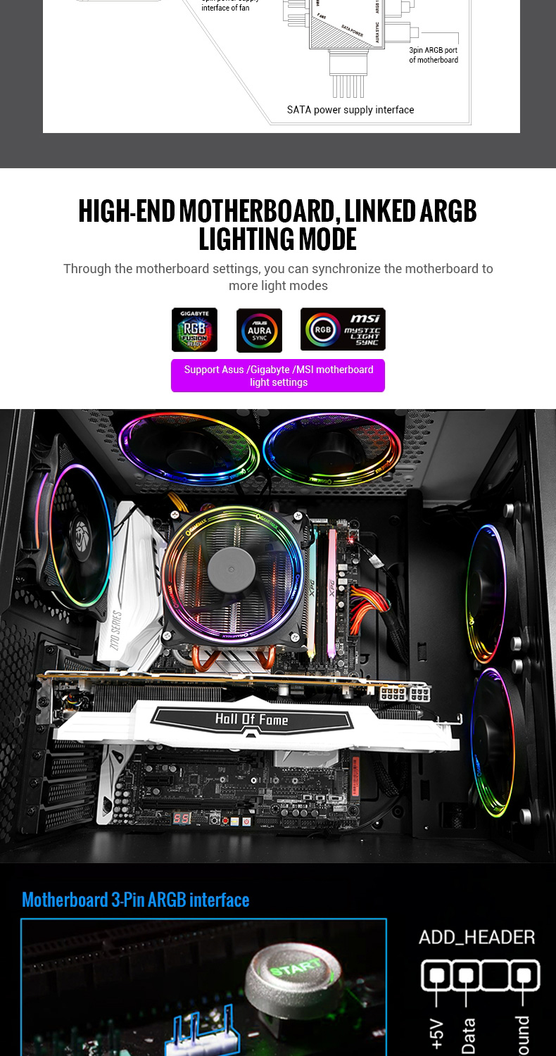 • The Black Hole can support up to 5 fans and comes with a spectrum RGB hub with a 3pin ARGB header to connect directly to your motherboard, allowing you to control your fans and LED strip via mobo provided software.