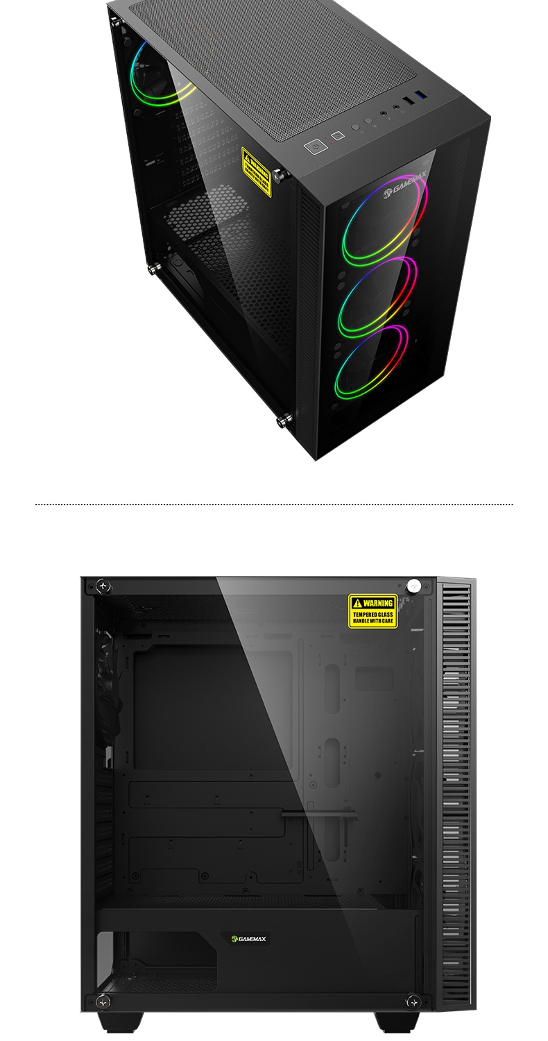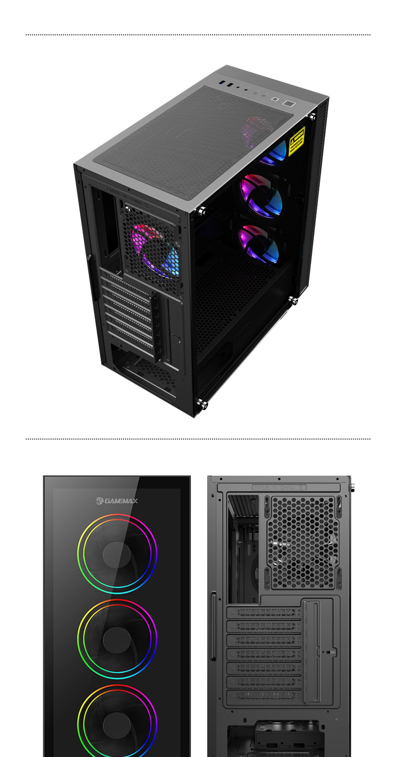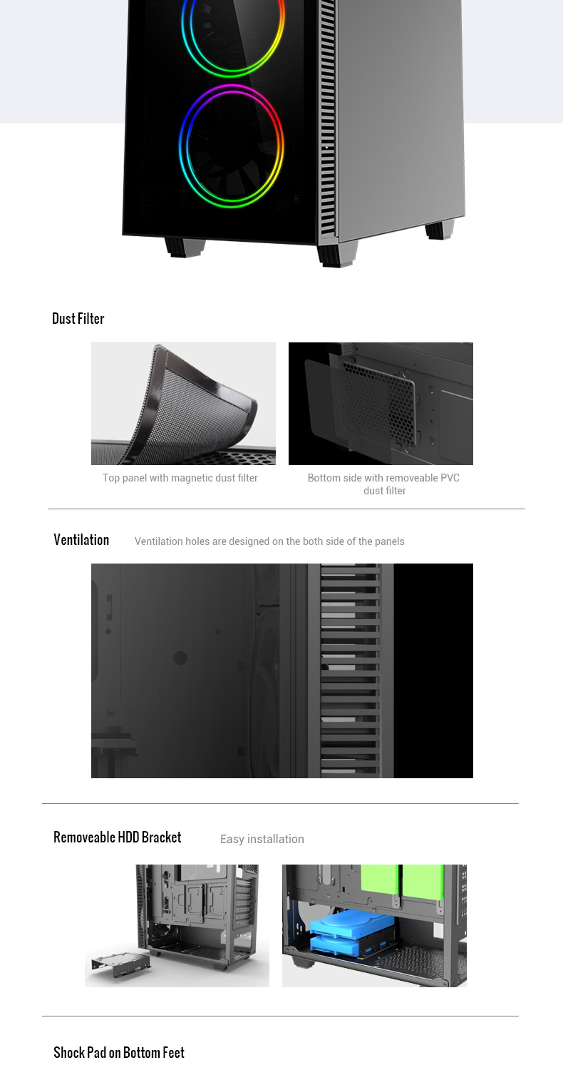 • The front panel is pre-installed 4x120mm Dual ring fan with ARGB light mode controlled via build-in HUB, It gives big air flow and excellent effect and the spectrum LED strip inlayed to give this case the perfect balance between style and RGB