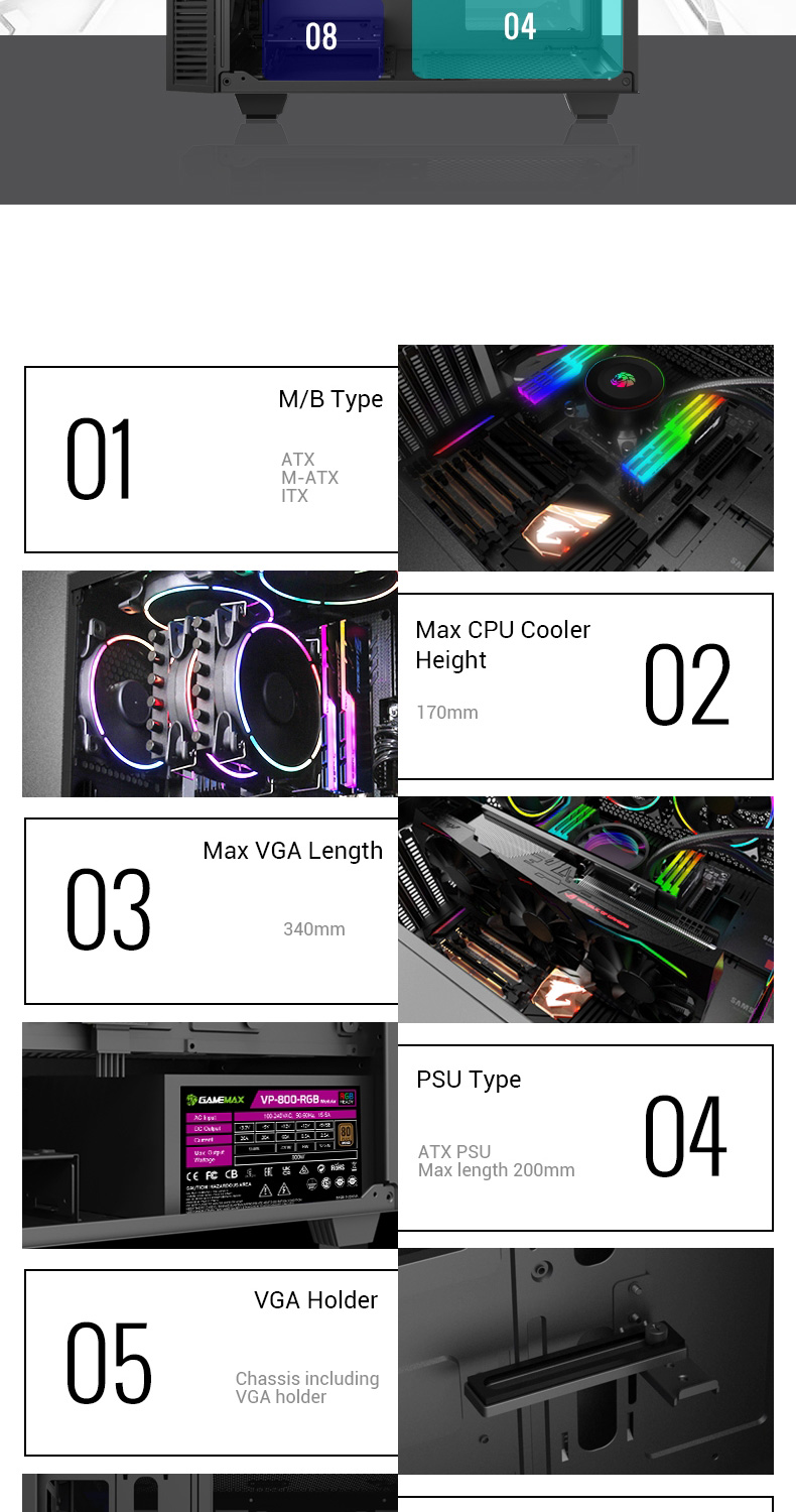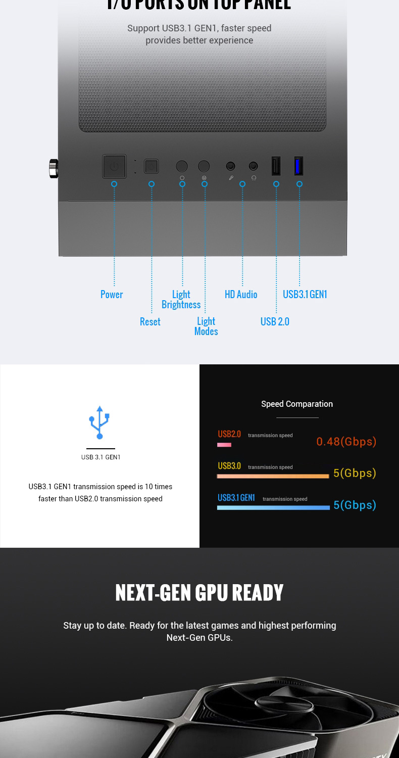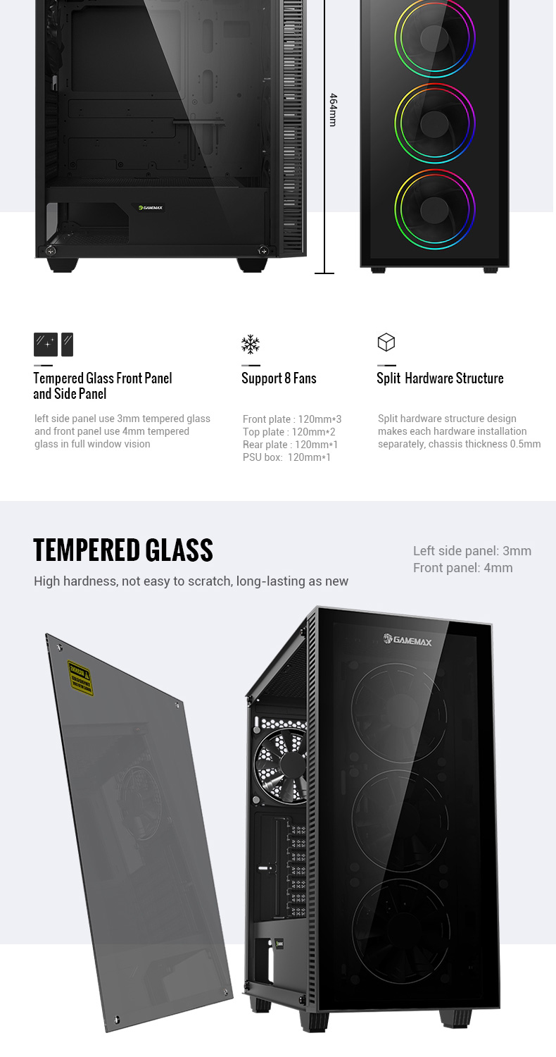 • The front panel is pre-installed 4x120mm Dual ring fan with ARGB light mode controlled via build-in HUB, It gives big air flow and excellent effect and the spectrum LED strip inlayed to give this case the perfect balance between style and RGB