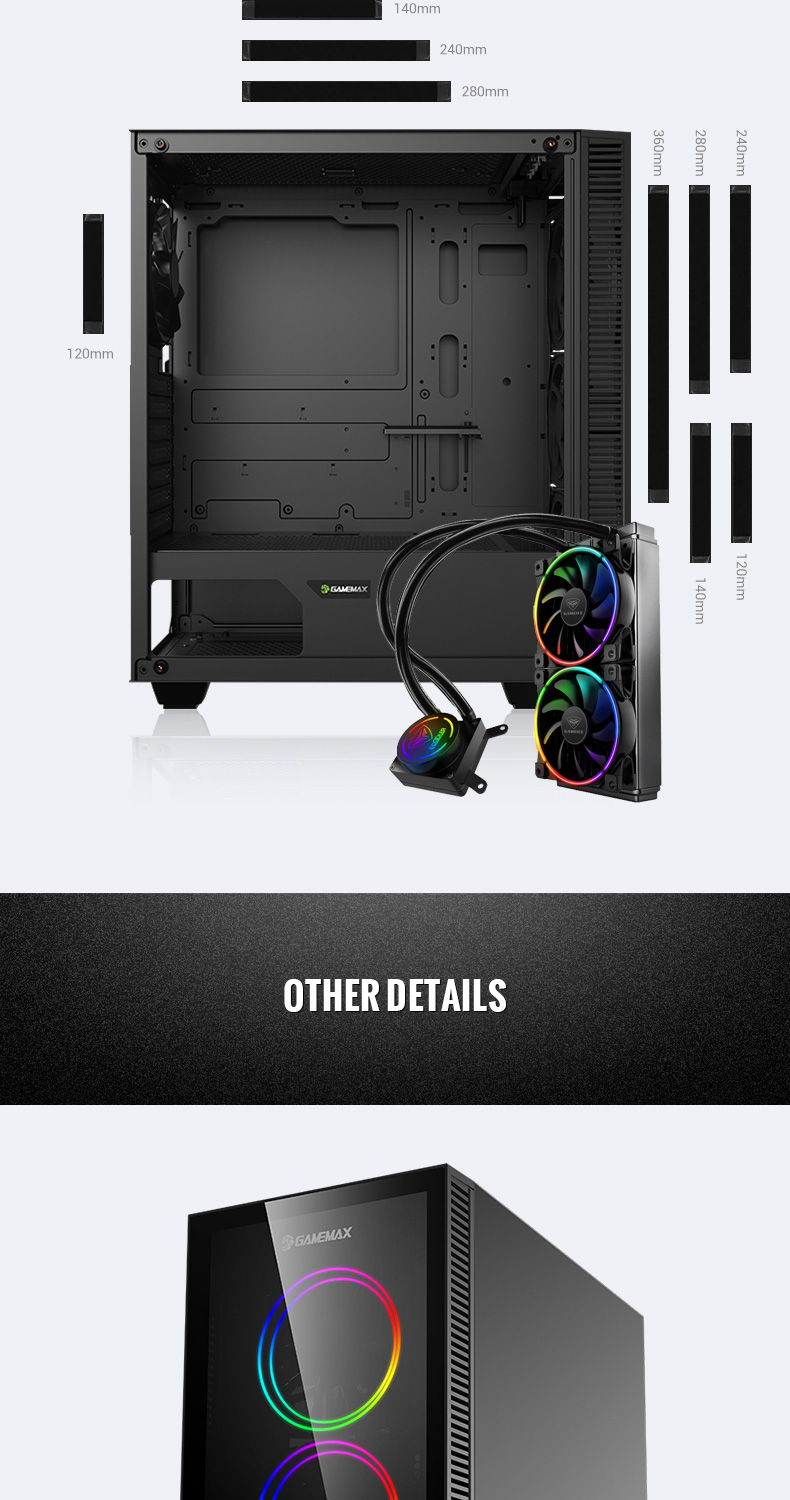 | Water Cooling Support (Radiator Size) | Front | 120mm, 140mm,240mm,280mm,360mm |