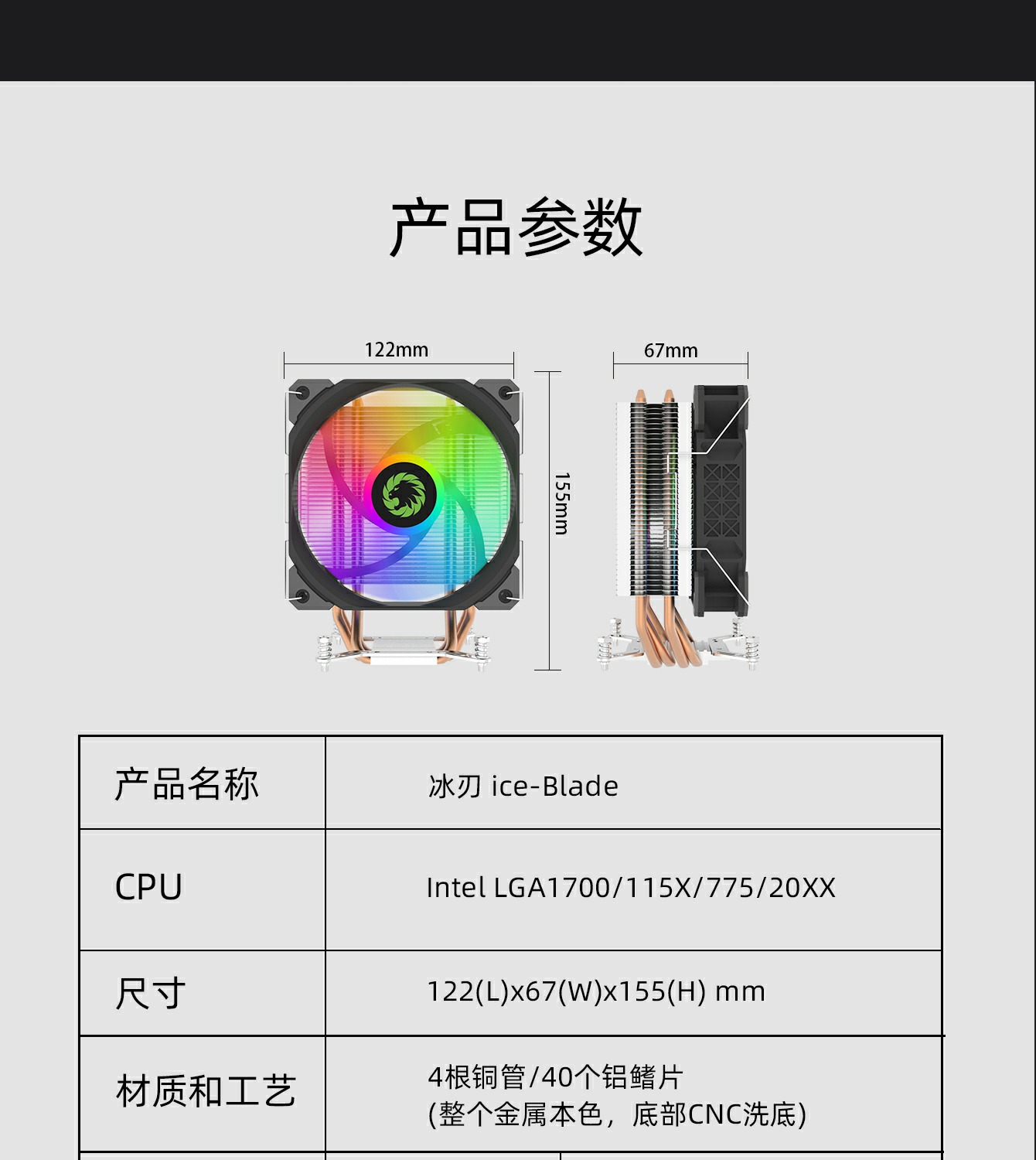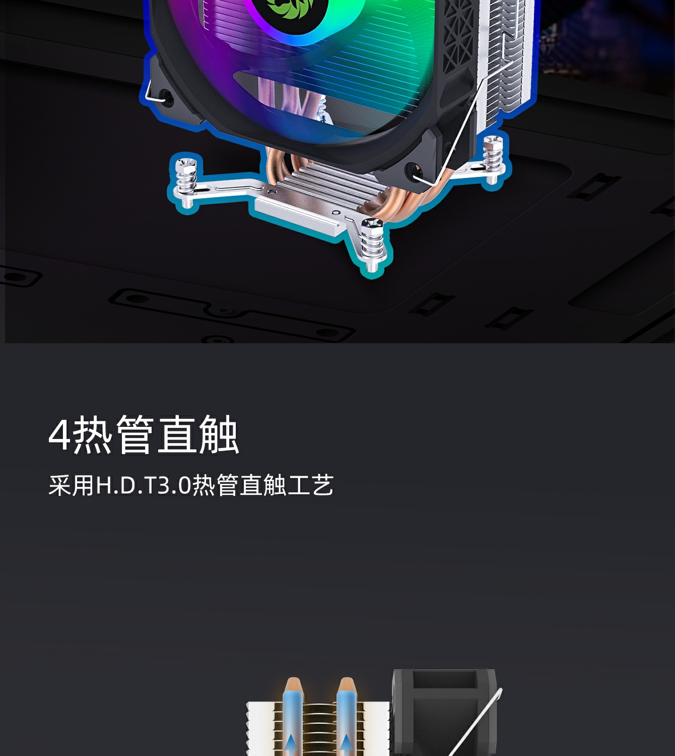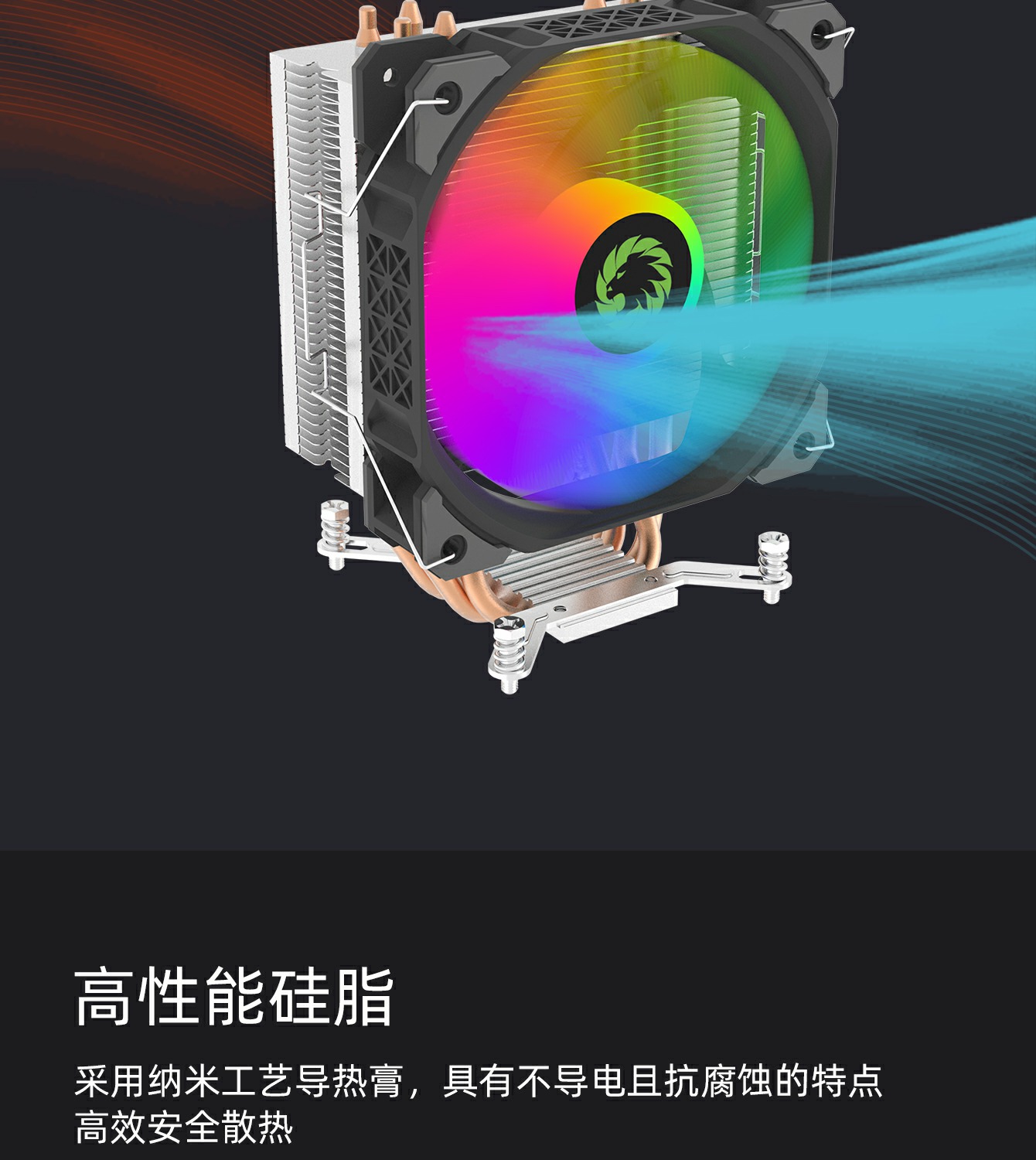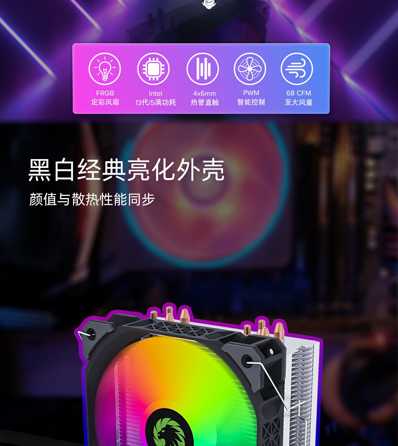 12寸4管单风扇PWM定彩散热器,Intel单平台,TDP190W,免拆风扇,快速安装,可压12代i7不带K