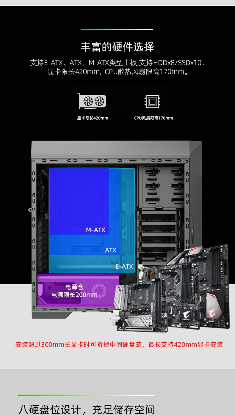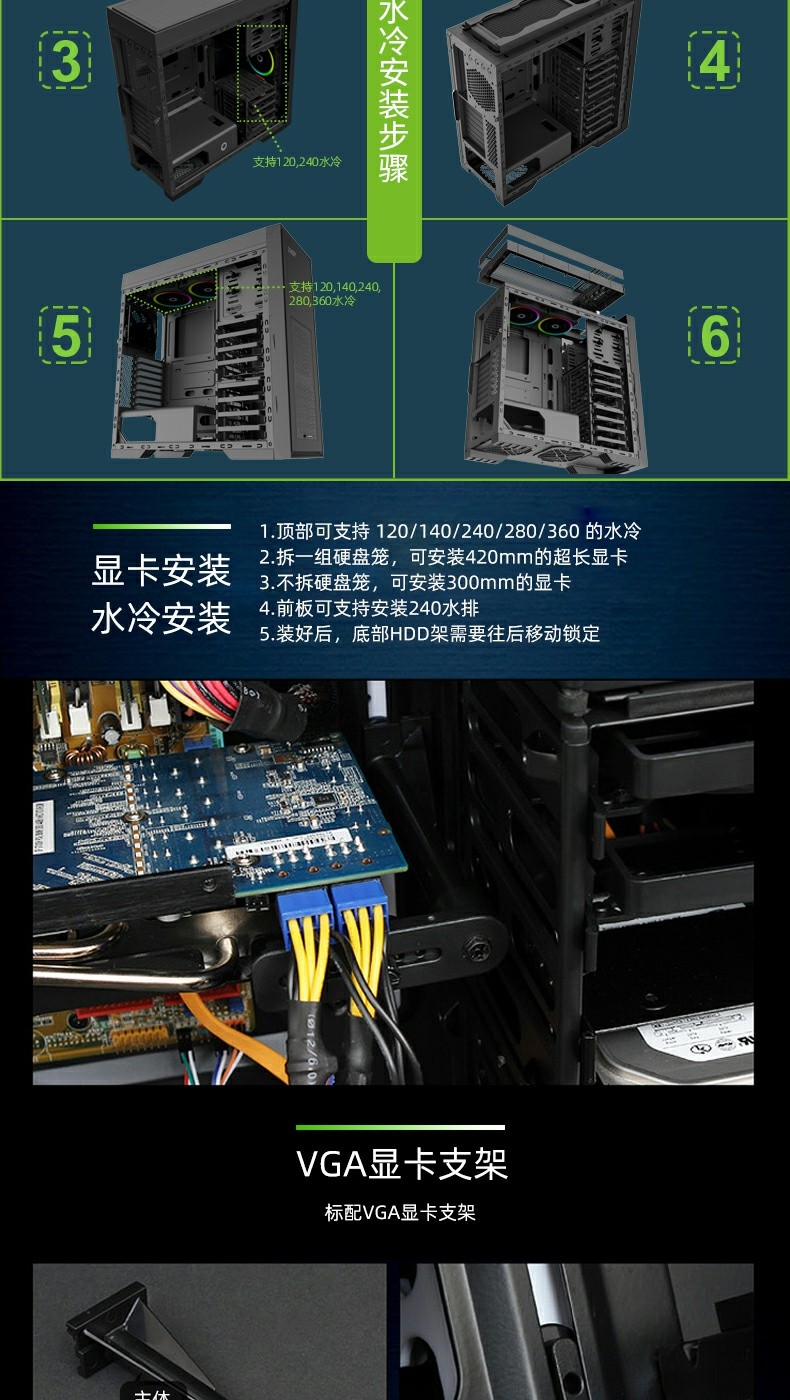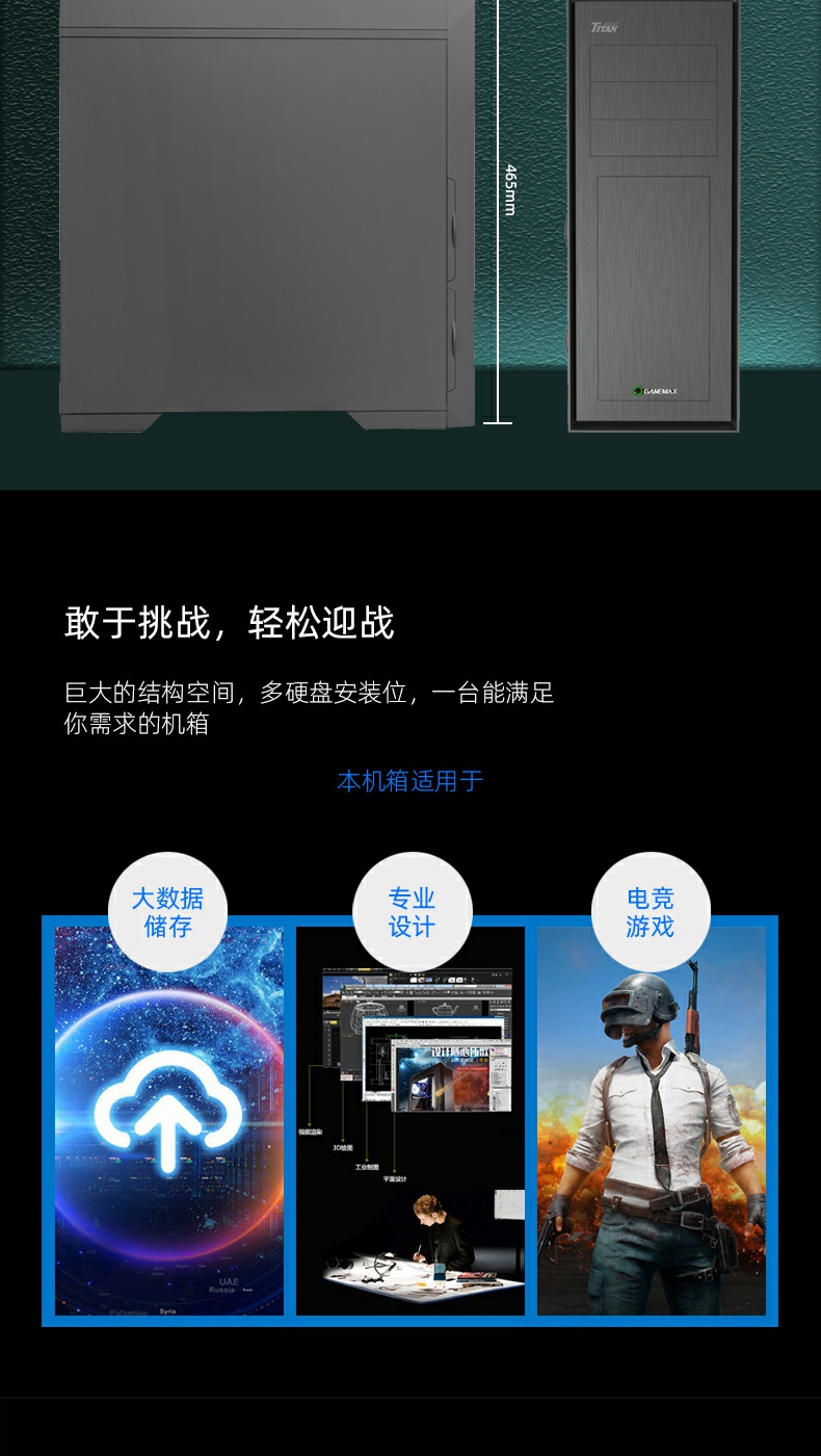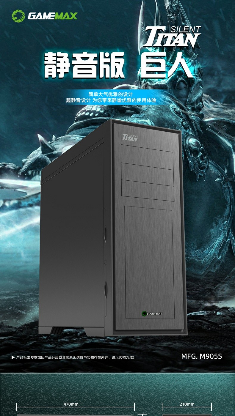• Gamemax巨人静音机箱支持长达 430mm 显示卡和 165mm 高度的 CPU 散热器。及360机置360水排装置,总之强大的扩展性,保障你随时升级的需求!