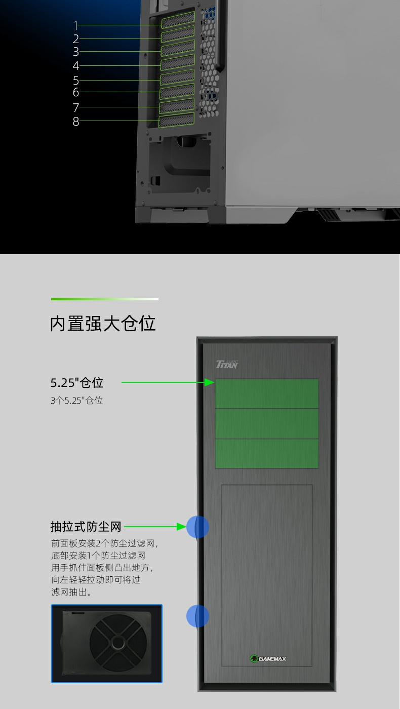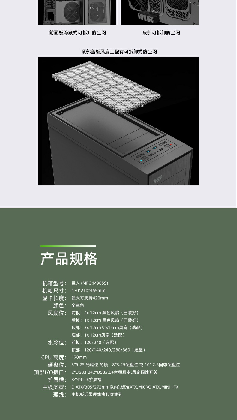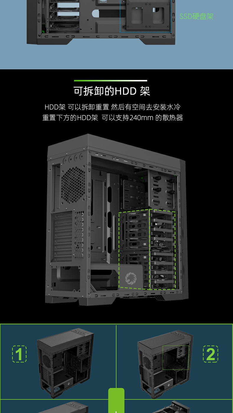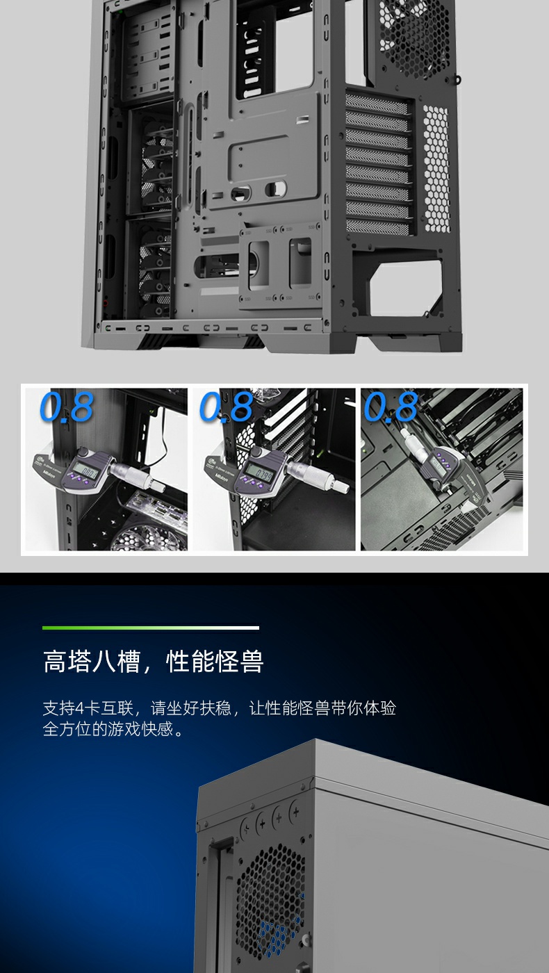 • Gamemax巨人静音机箱支持长达 430mm 显示卡和 165mm 高度的 CPU 散热器。及360机置360水排装置,总之强大的扩展性,保障你随时升级的需求!