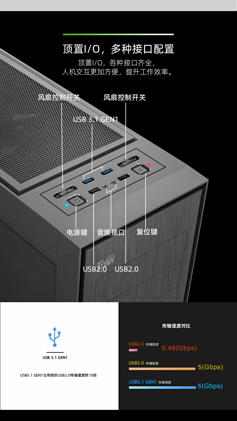 • 风扇速度可以自由控制,顶部带有高清HD-AUDIO音频口、2 x USB 2.0 和 2 x USB 3.0,方便用户访问。