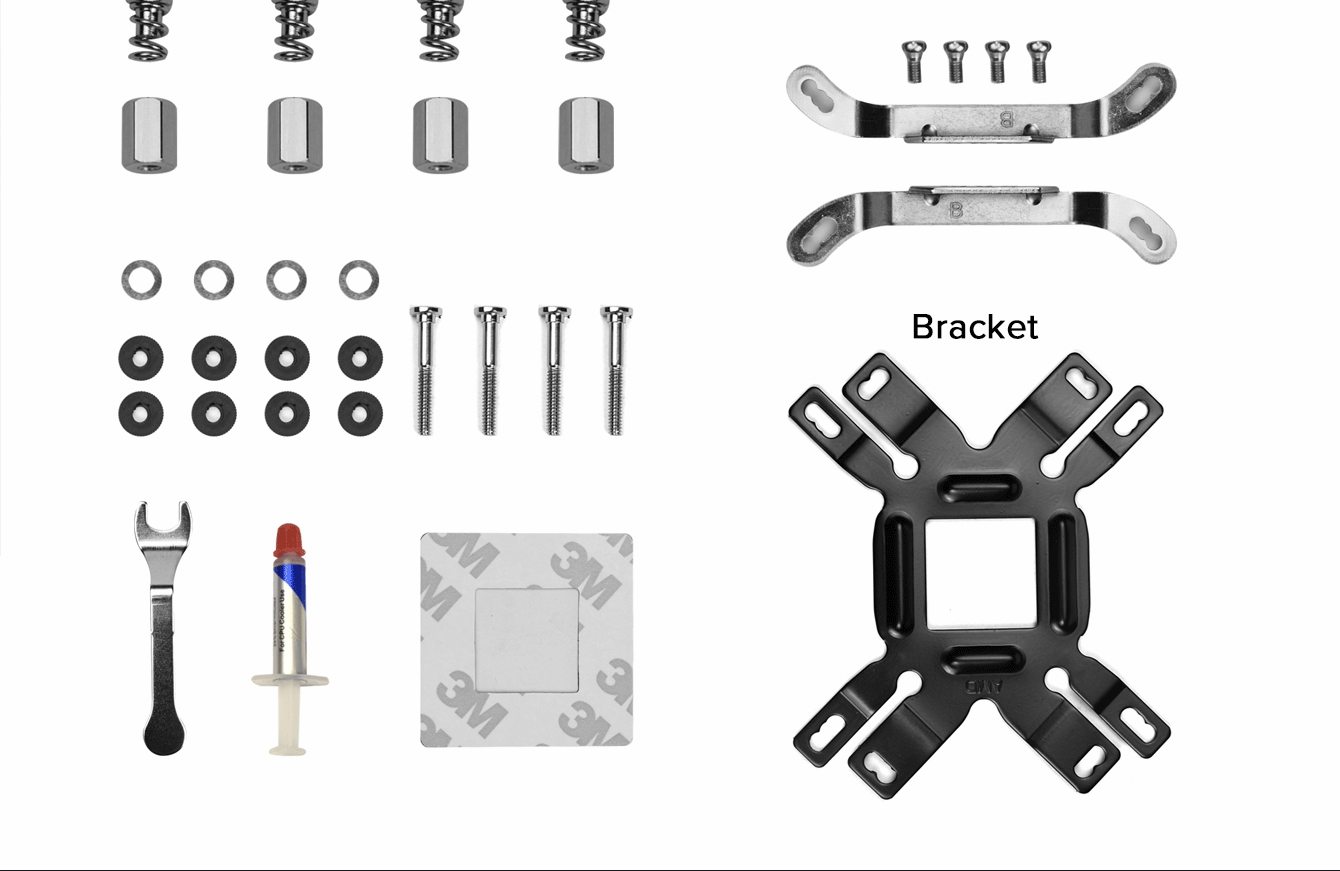 | 1 x CPU Cooler, 1 x Accessories Bag, 1 x Backplate, 2 x Intel Bracket, 2 x AMD Bracket, 1 x RGB Controller, 1 x 1-to-2 RGB Bifurcate Cable, 1 x 3 Pin 5V / D / GND ARGB Self-locking Connector, 1 x Thermal Paste, 1 x Quick Install Guide, 1 x Installation |