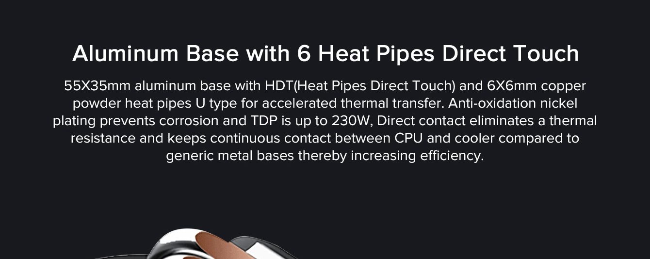 • 【6 Heat Pipes Direct Touch and Super Heat Dissipation·230W TDP】6 pcs 6mm nickel plating copper powder heat pipes U type for fast thermal conduction, 55x35mm aluminum base