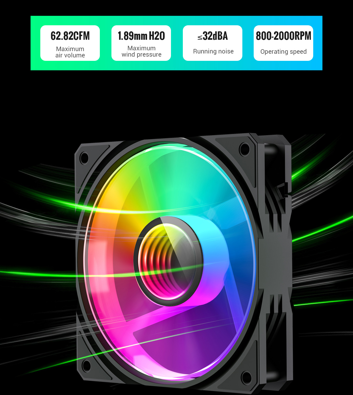 | Air Pressure | 1.89 mmH2O | Noise | ≤32dBA | Fan Life | 40000H |