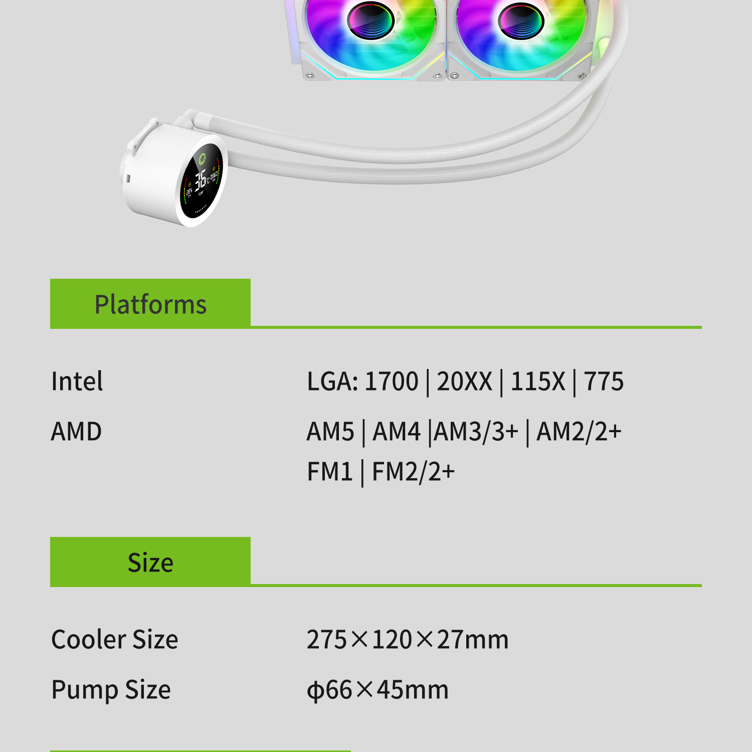 | Pump | Block Compatibility | Intel LGA1851/1700/20XX/115X/775 AM5 AM4.AM2.AM2+. AM3. AM3+,FM1. FM2. FM2+ |