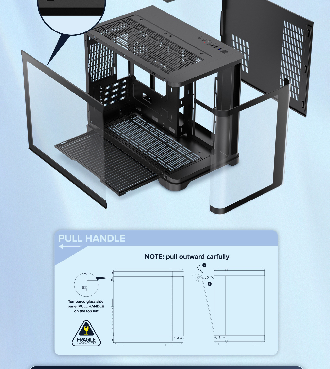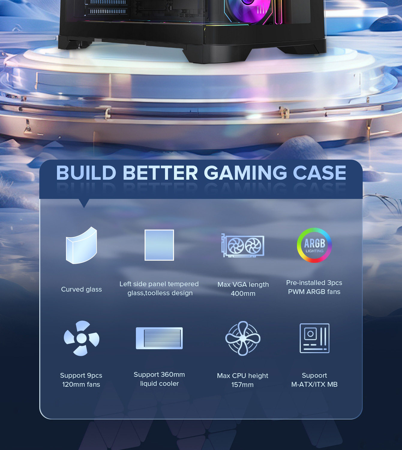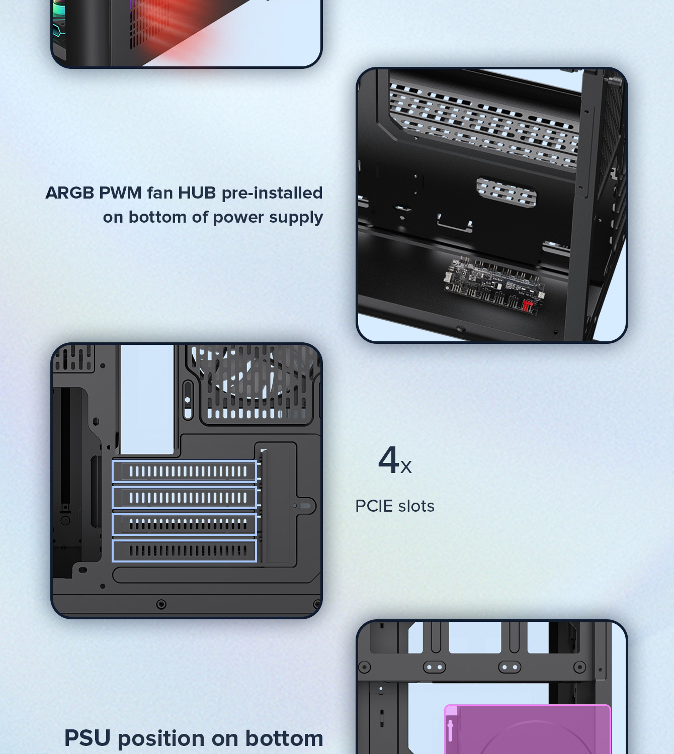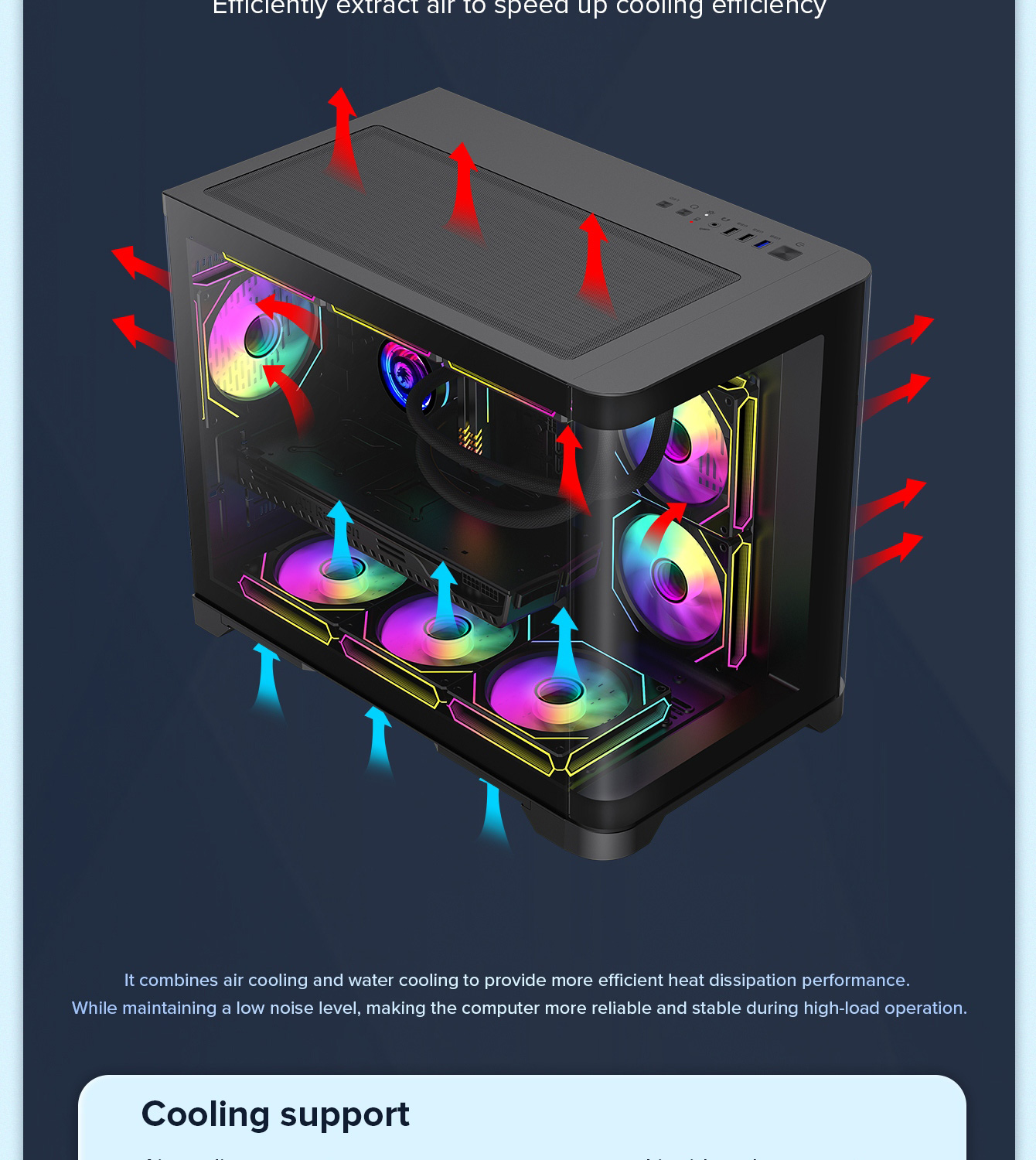 • Computer Case Focus on Cooling- 3 x pre-installed 120mm ARGB Fans- 2 beneath the floor, and one at the back of the case