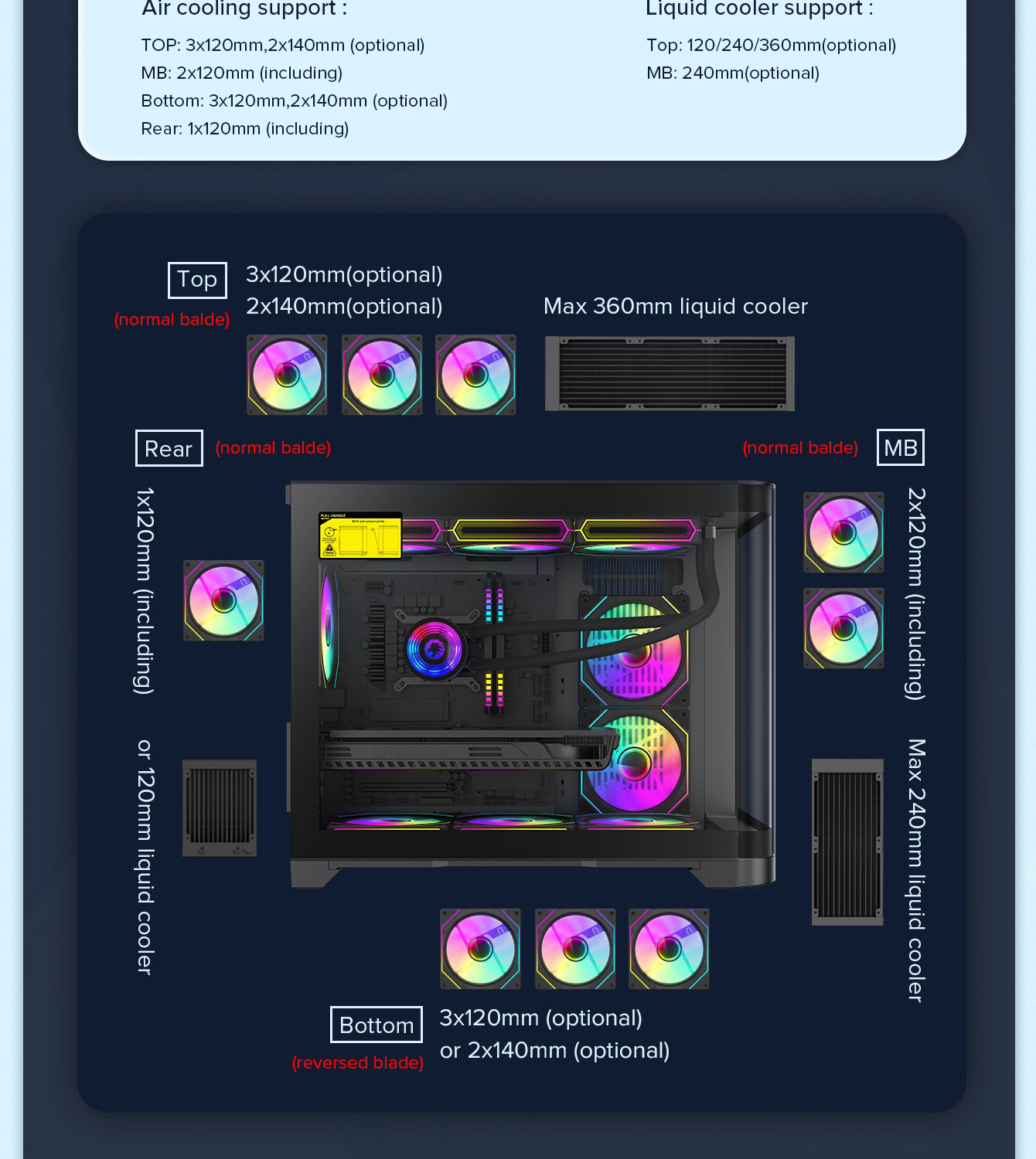 | bottom | 120mm*3 or 140mm*2(FAN Optional) | |