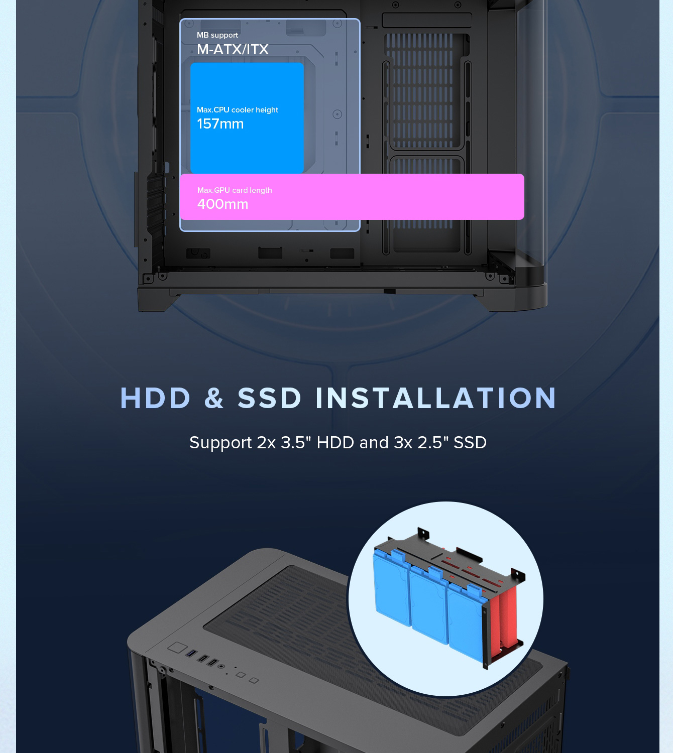 • This Mid-tower Case is compatible with the largest NVIDIA 4000 series cards thanks to its ample room for graphics cards up to 400mm in length, and 157mm in height (for air cooling mode)