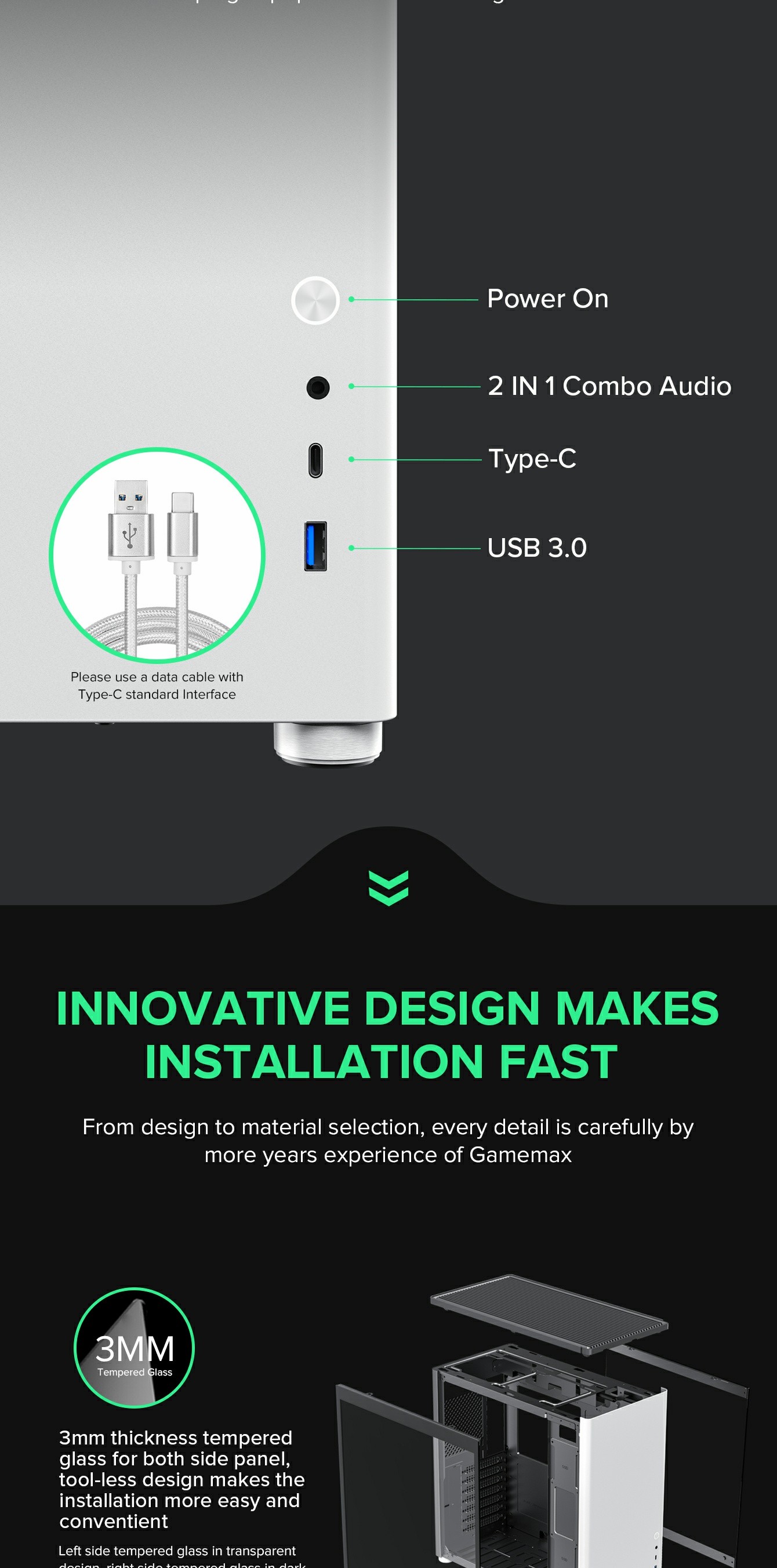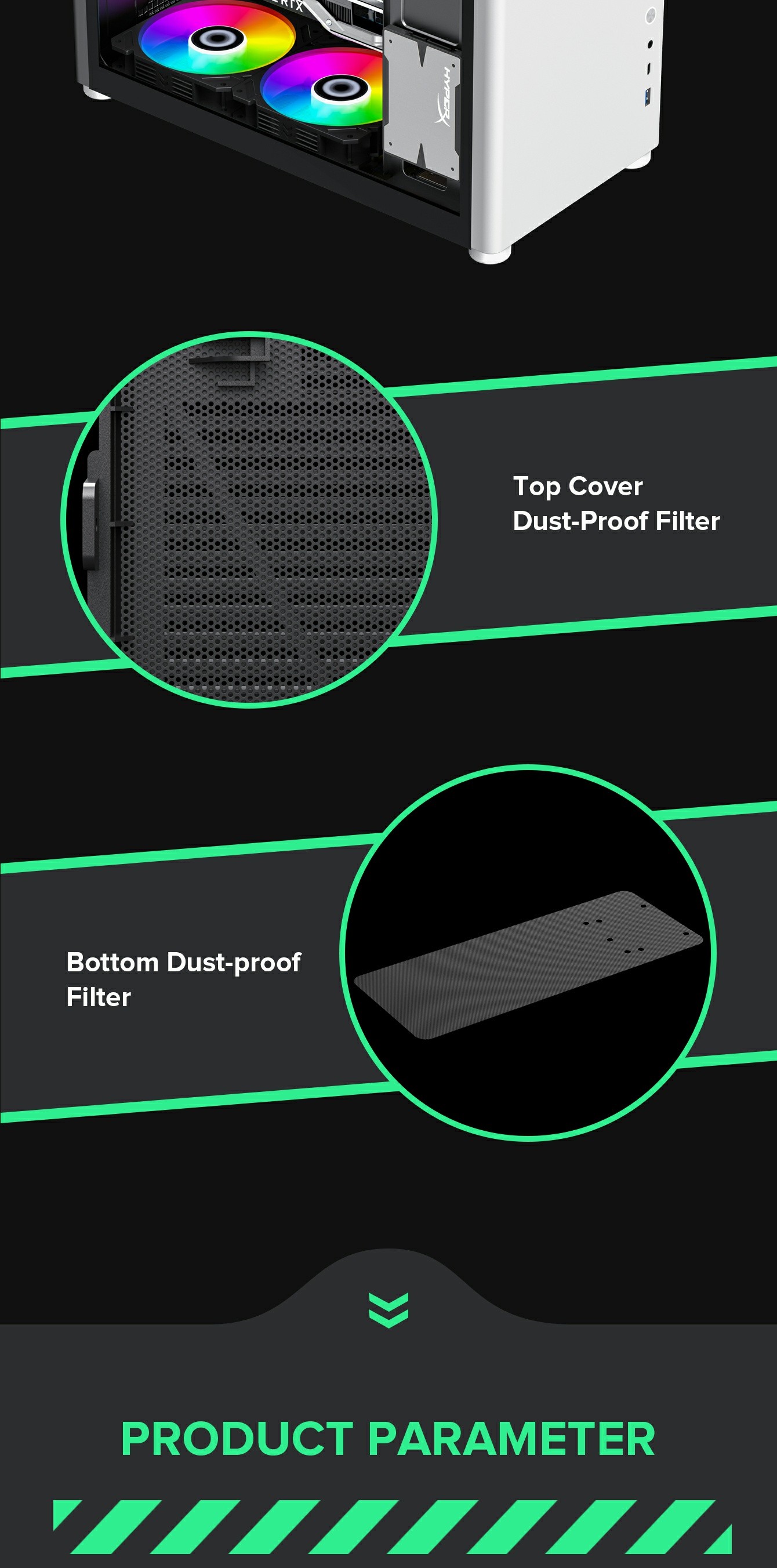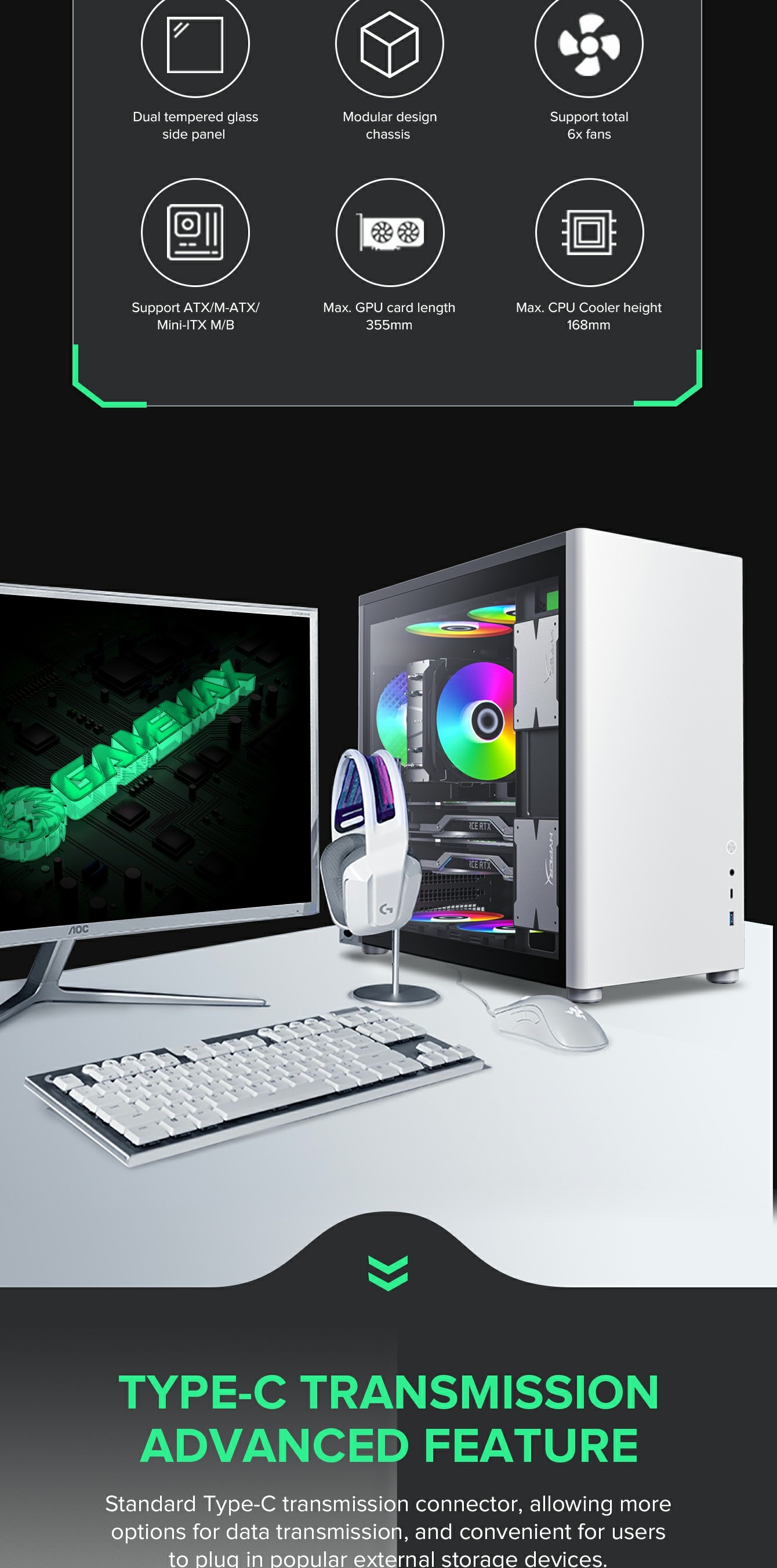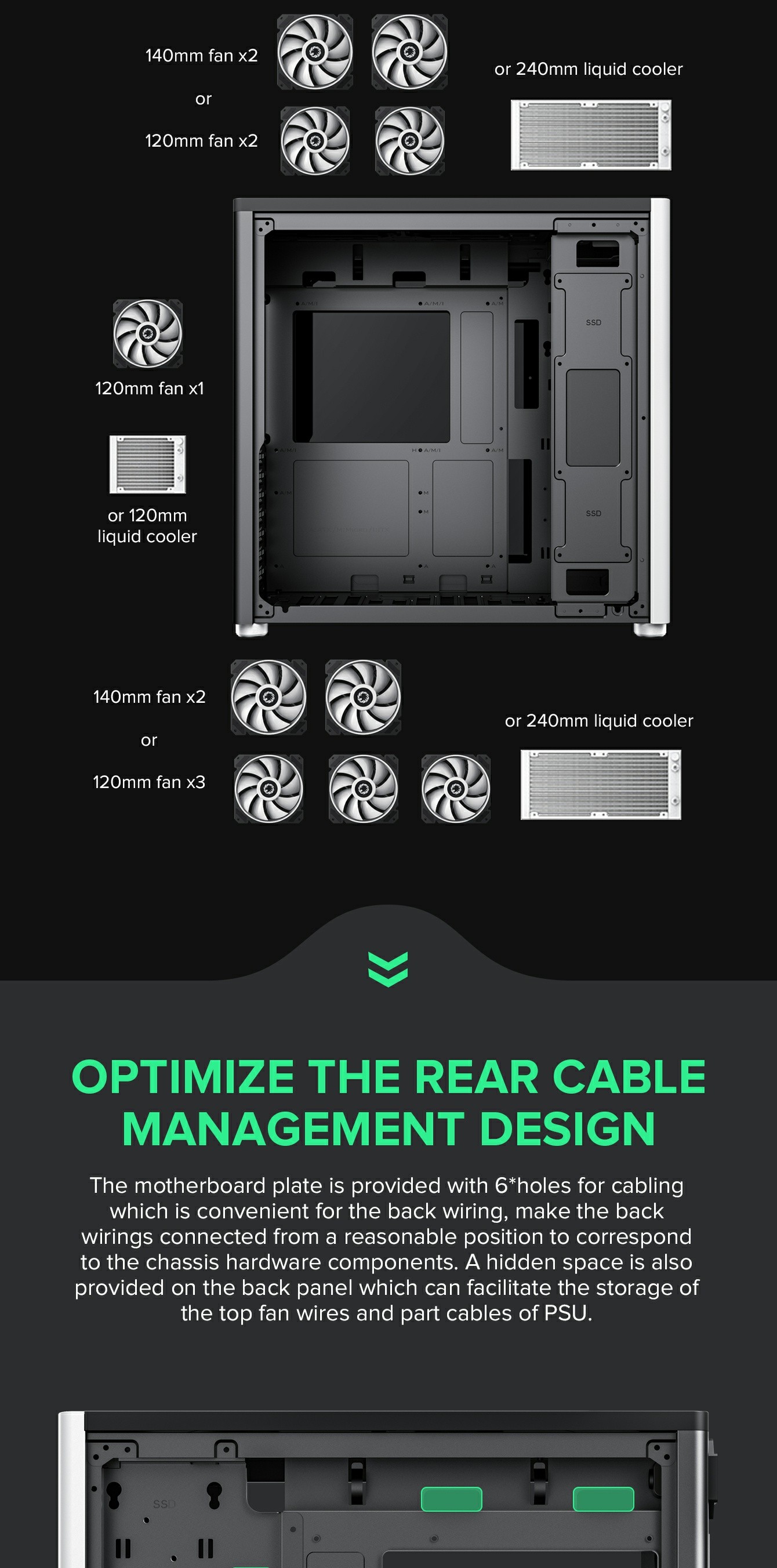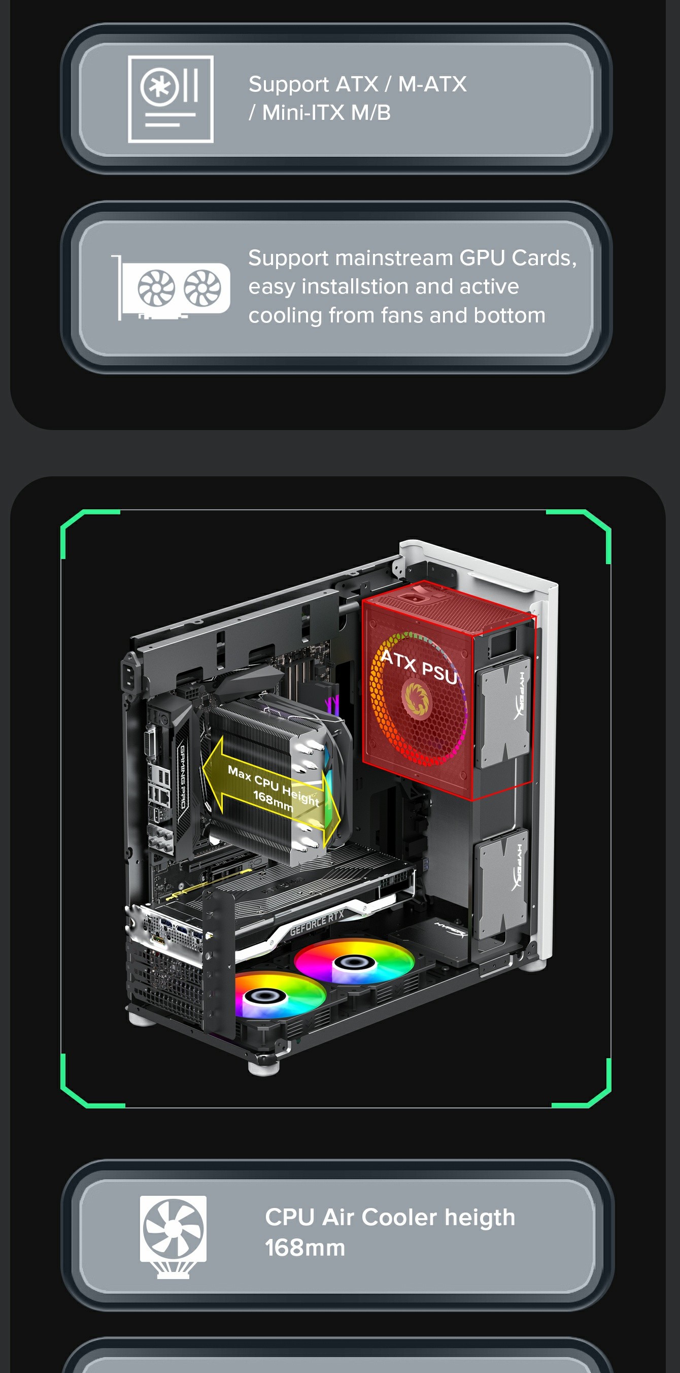 • The interchangeable design of the glass side panels and hollow side panels provides additional heat dissipation airflow channels and Support 240 water cooling and up to 168mm air-cooling CPU cooler