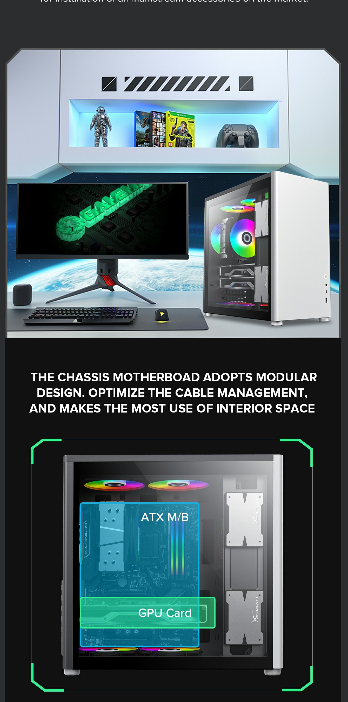 • Support high-end popular graphics cards 305~355mm, unlimited games.