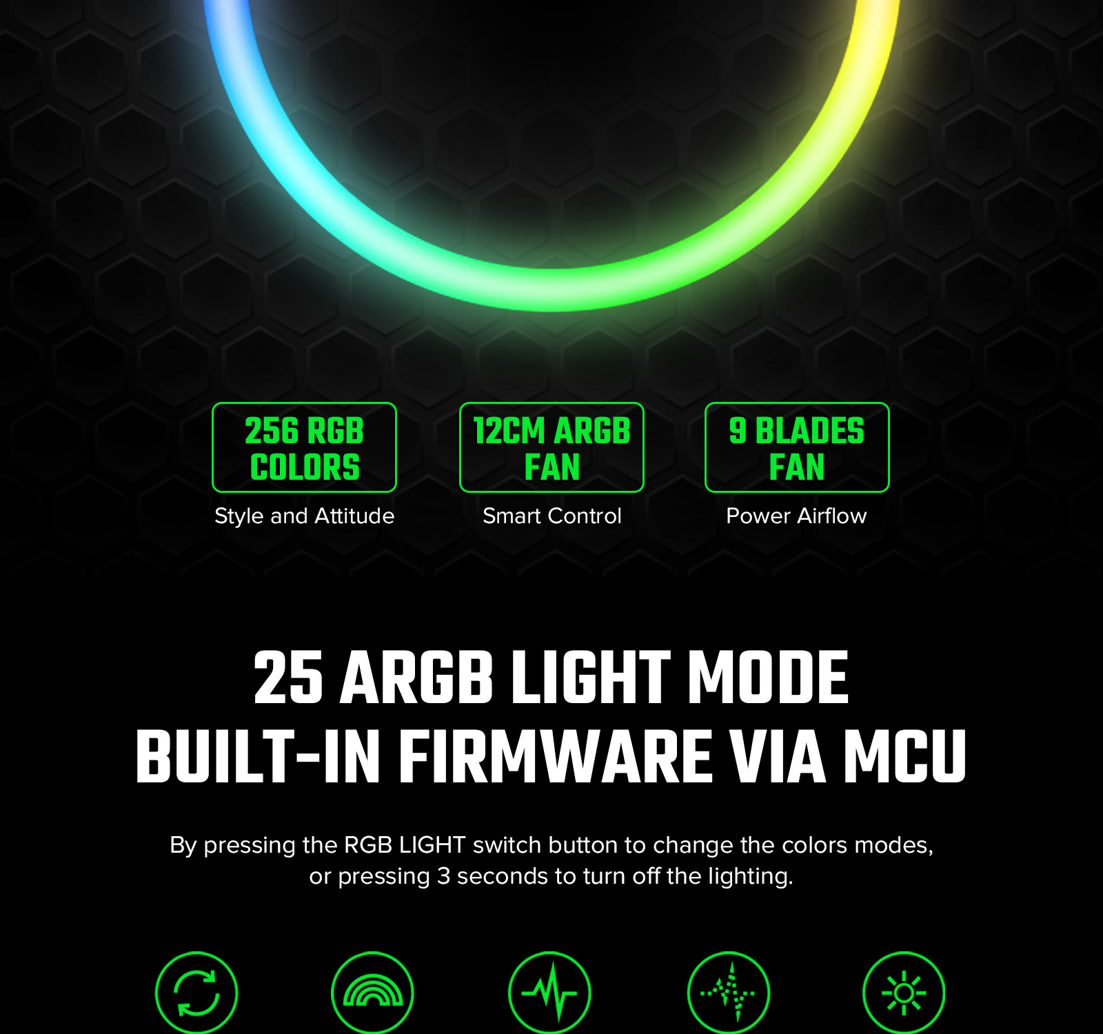 • ARGB Lighting with 25 Modes: Features a built-in 120mm ARGB fan with customizable lighting modes, adding a vibrant, personalized touch to your build.