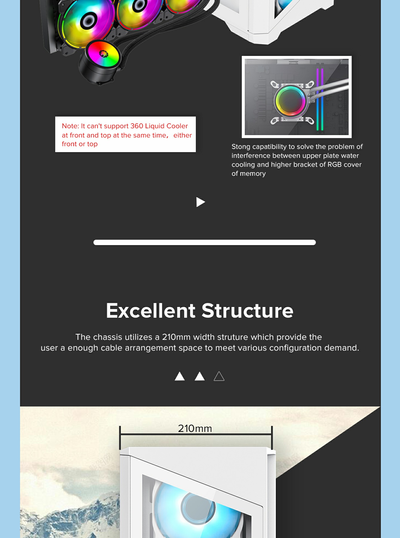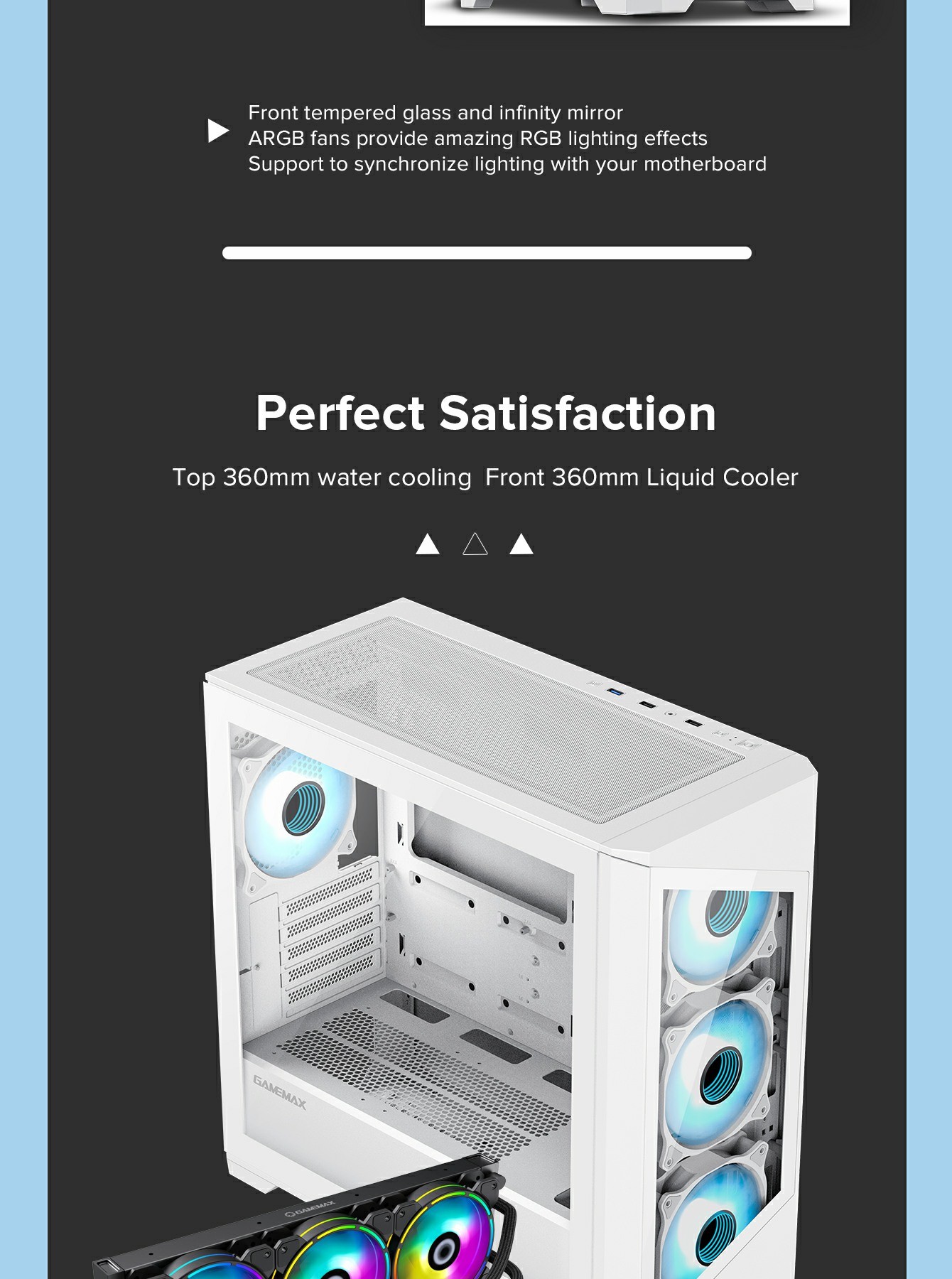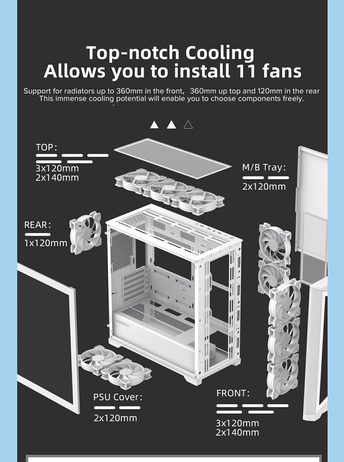 • 360mm Radiator Support: Compatible with up to 360mm radiators on the top for better CPU liquid cooling.
