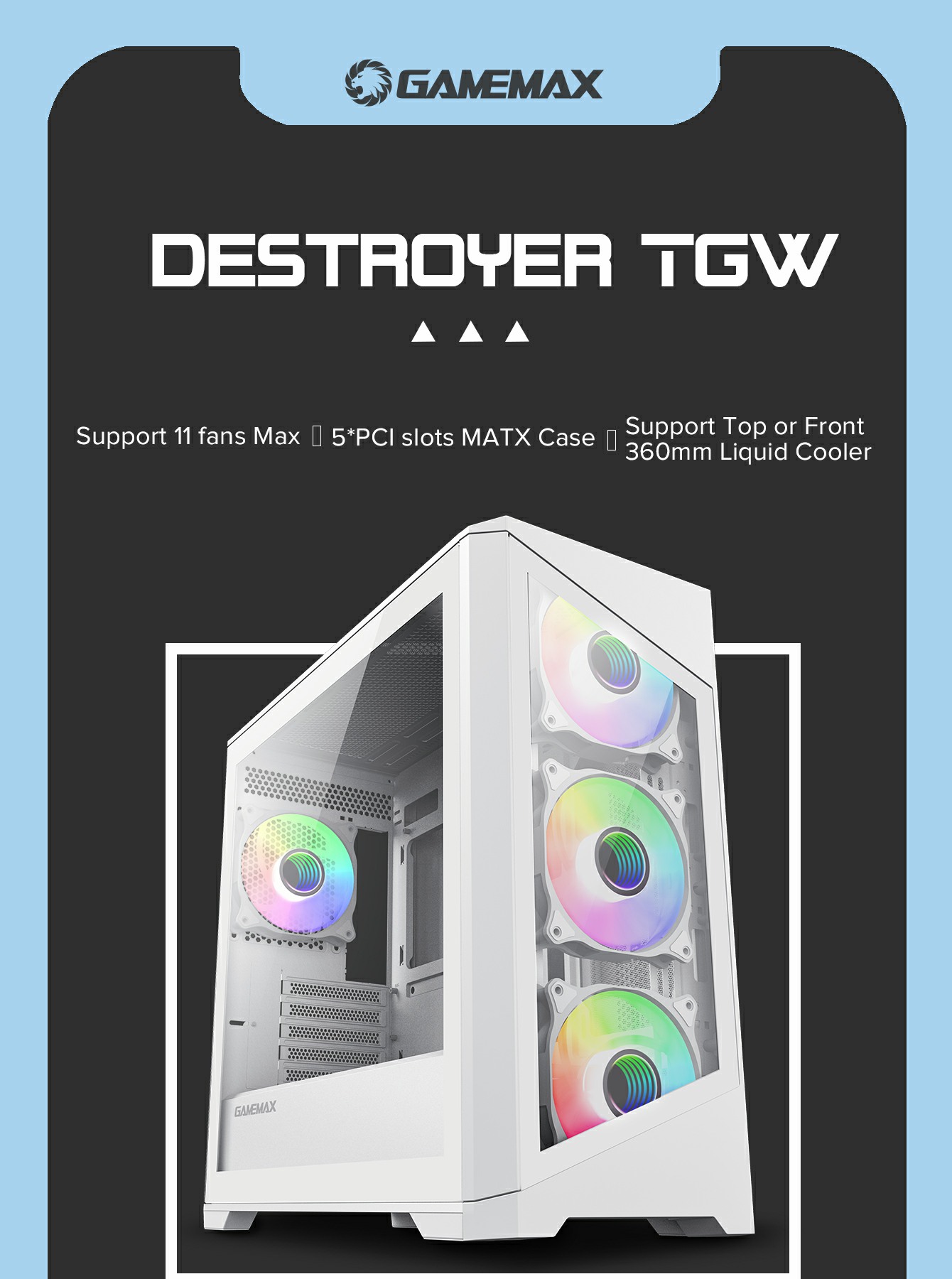 GameMax Destroyer TG White Micro-ATX Gaming Case with 4 ARGB Fans, Tempered Glass Panels, 360mm Radiator Support on Top, and Extreme Cooling Performance