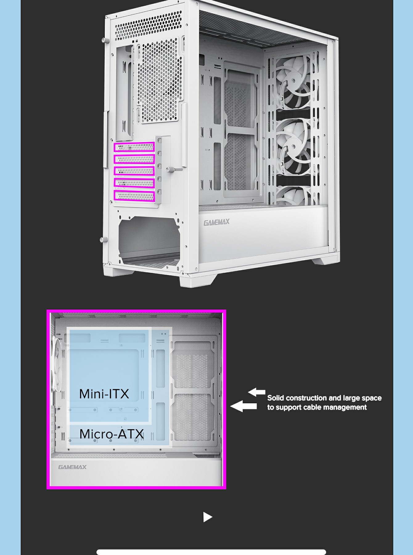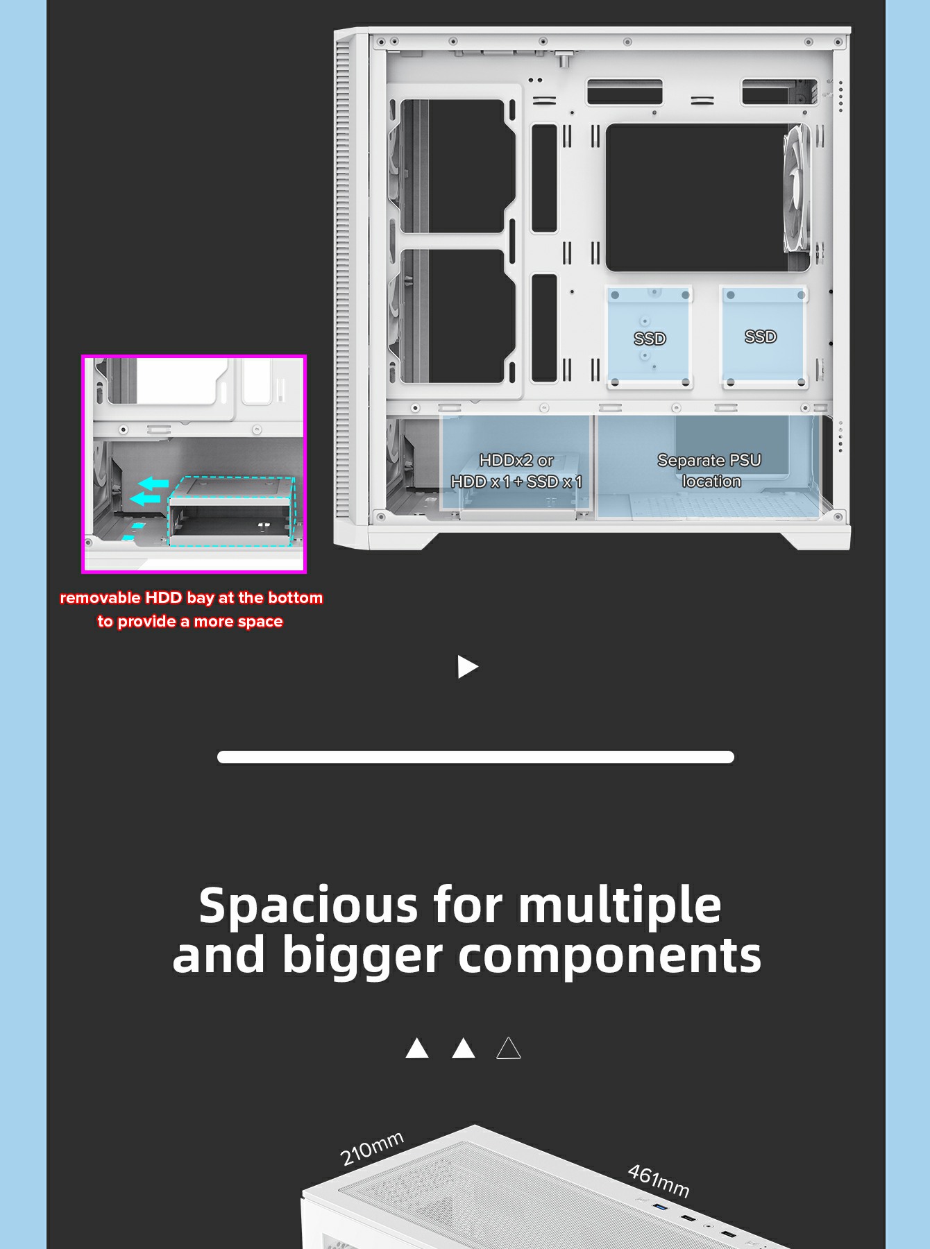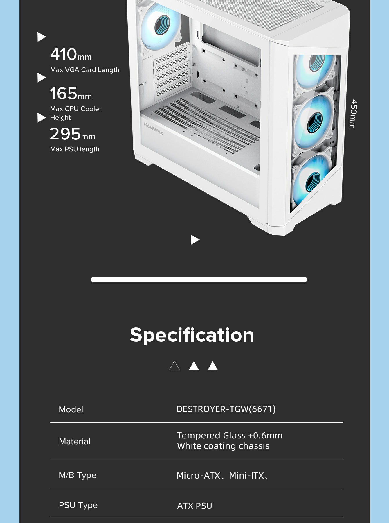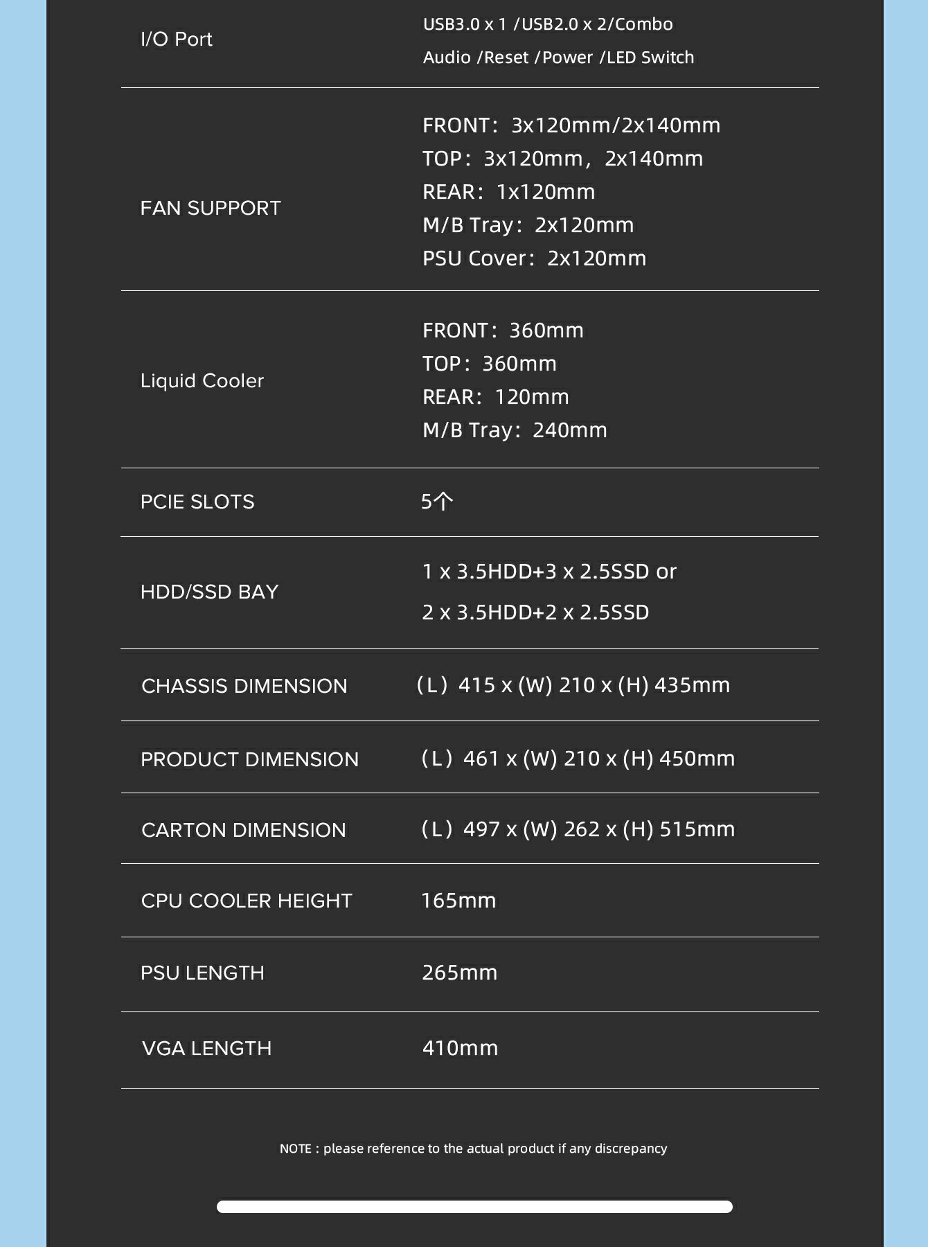 | SPS Length | up to 265mm(front cover w/o Water Cooling) | |