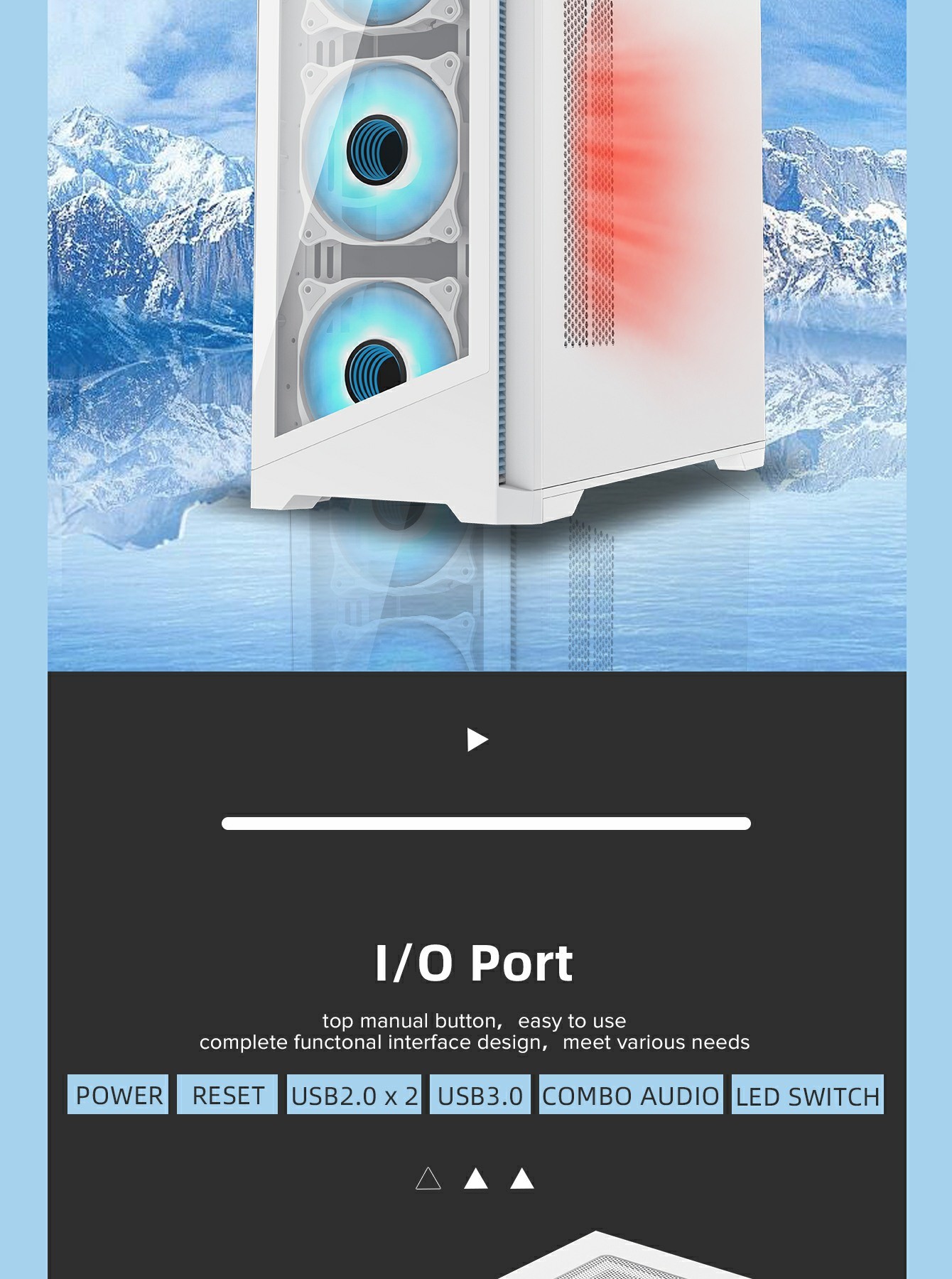 • ARGB Lighting Control: 16 customizable lighting modes, including RGB, breathing, and single color, controlled via the top panel.