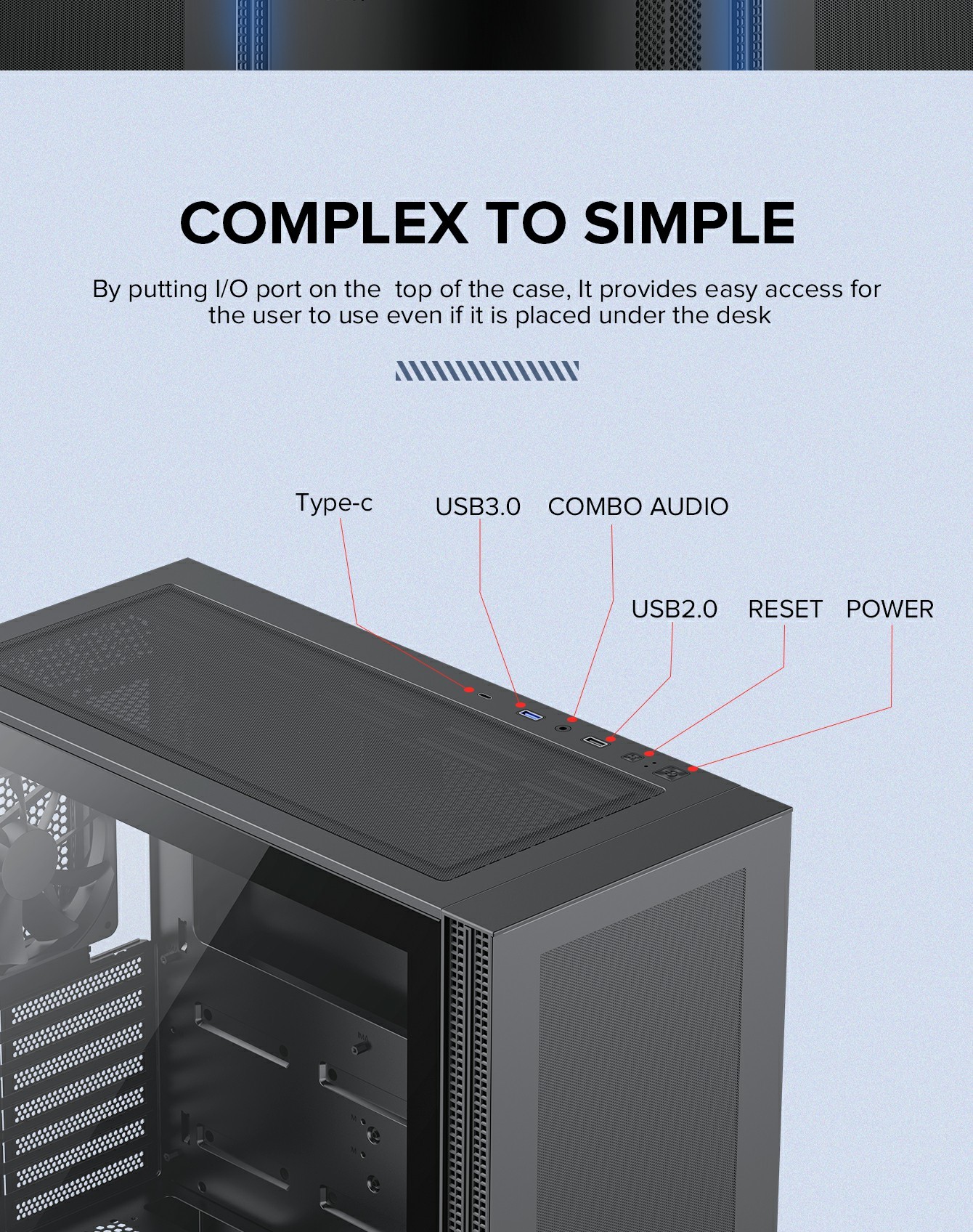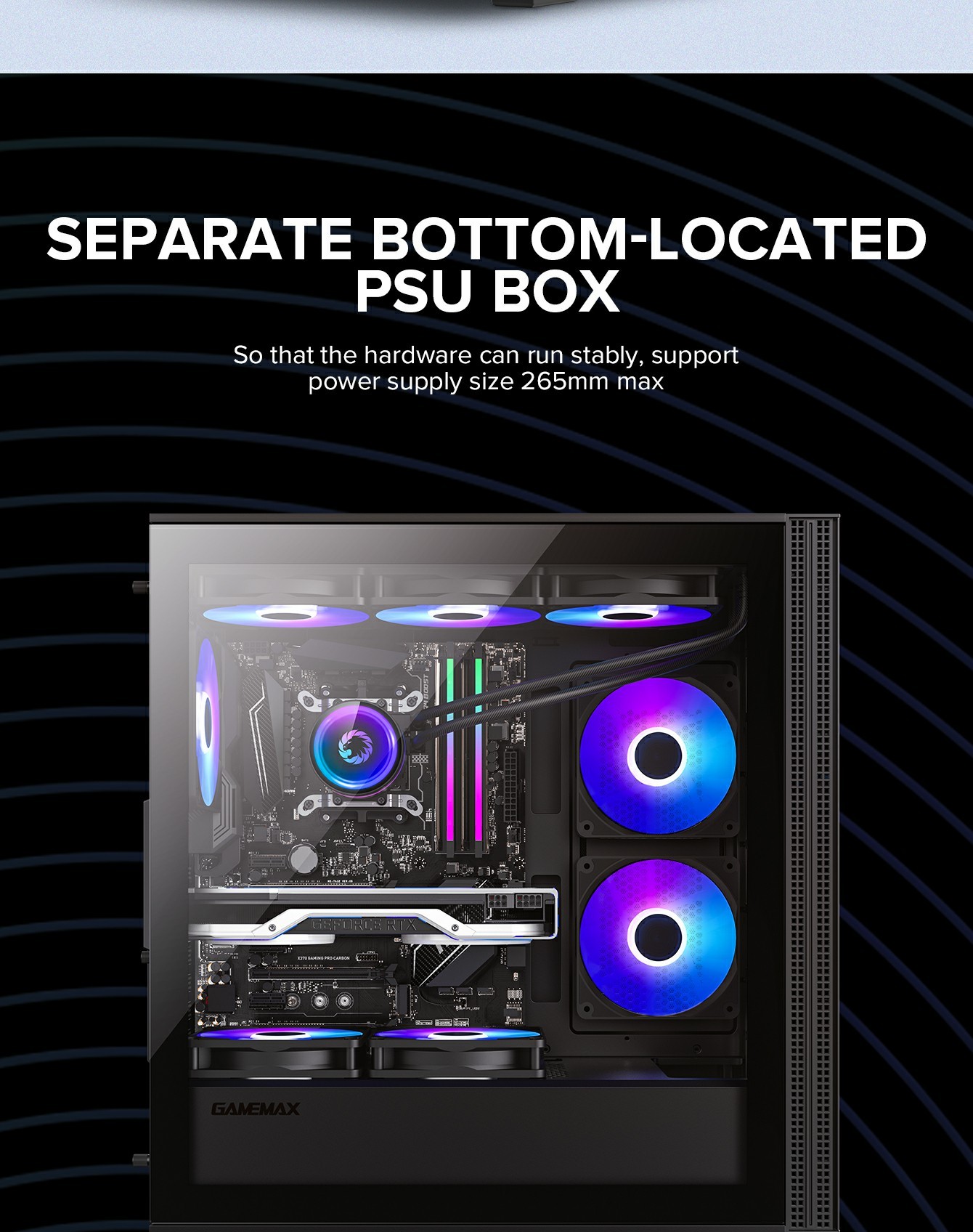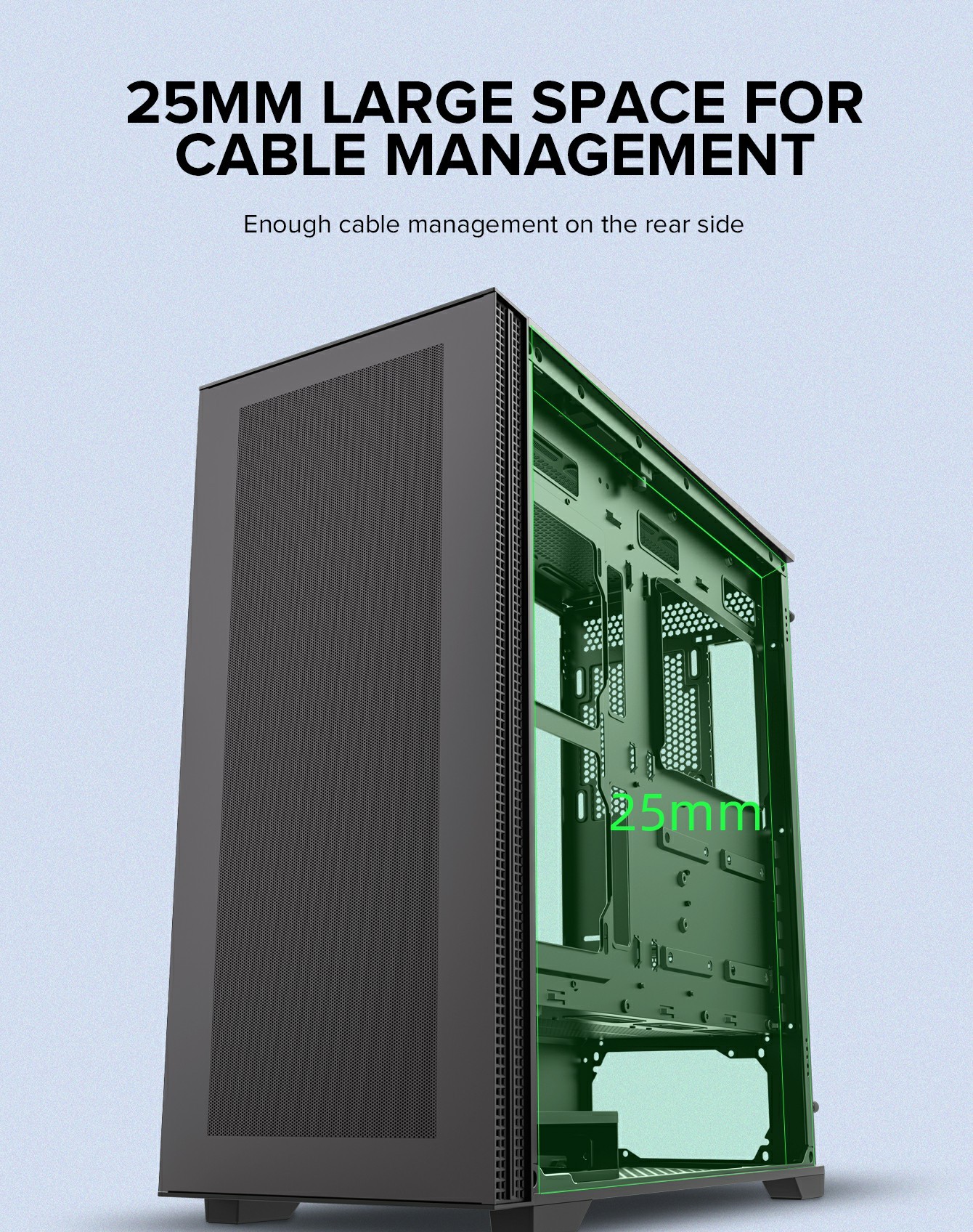 • Full-Length PSU Shroud - Allows for a 265mm PSU, hiding cables for a cleaner build.
