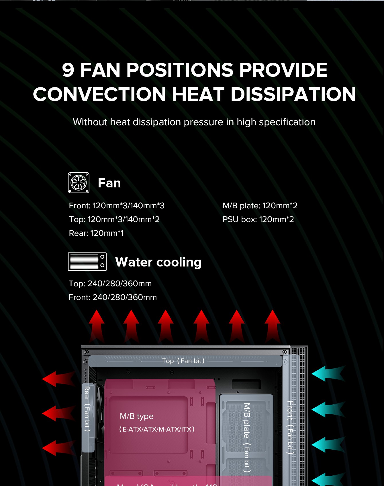 | Cooling Fan Support | Front | 3x120mm,3x140mm(Fan optional) |