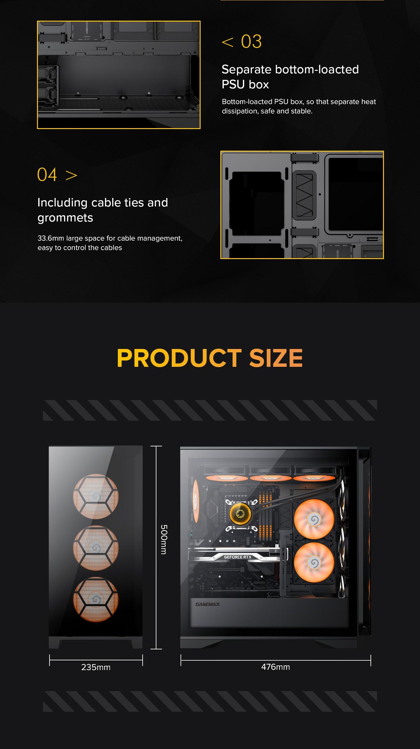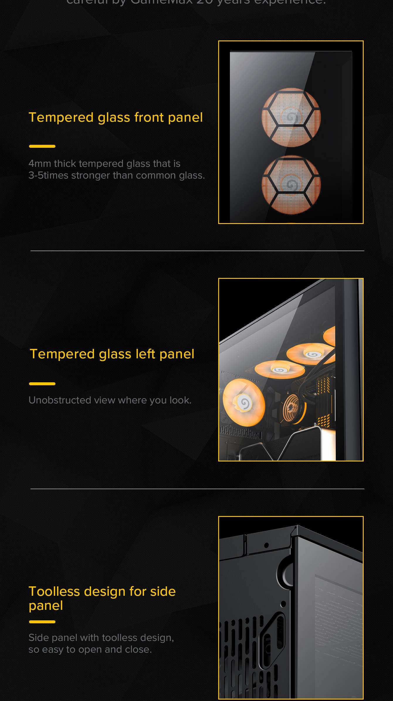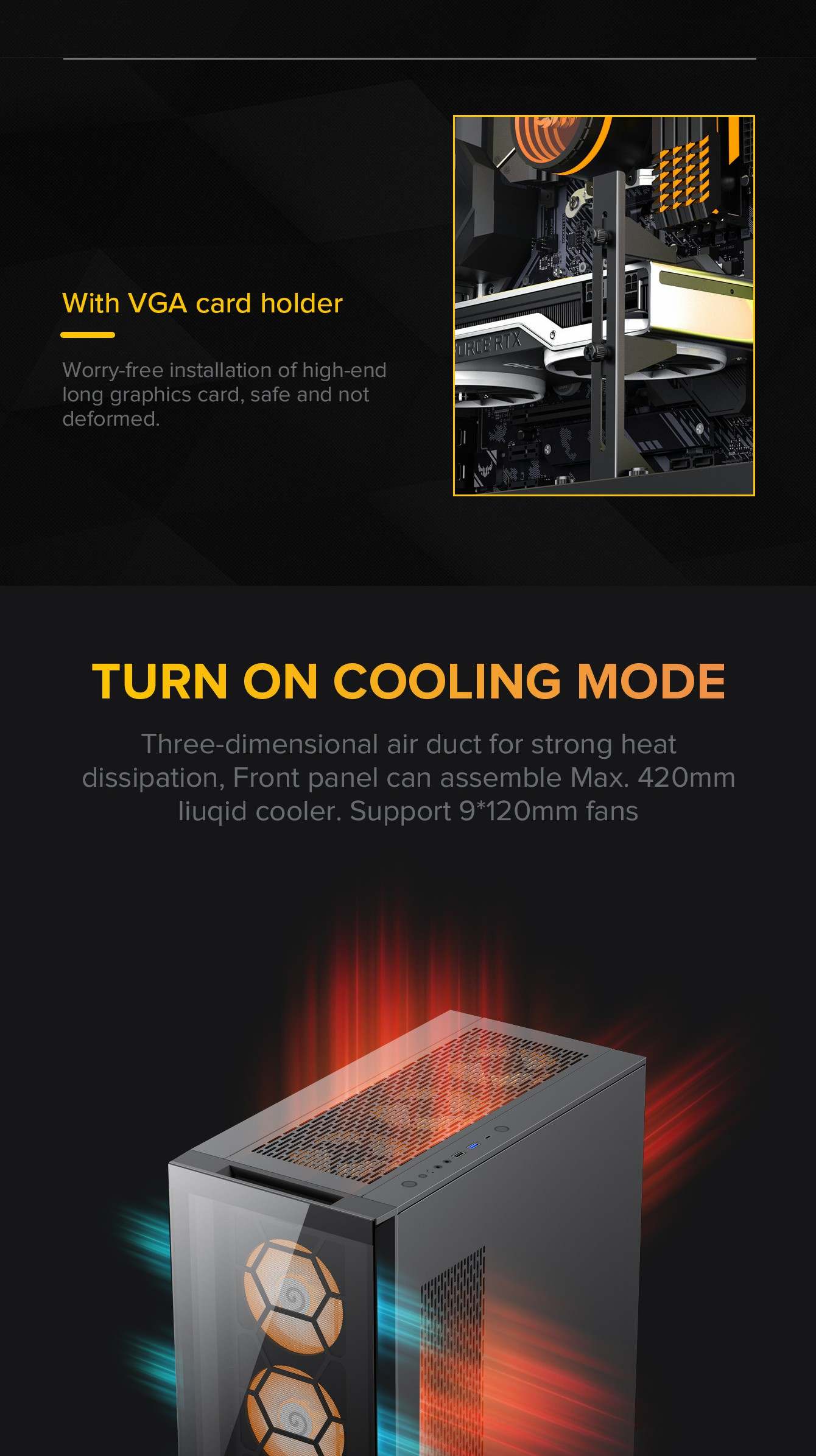 • Flip-open Side Panel: Easily open the case without the need to remove screws to clean the radiator or graphics card, improving cooling by 76% compared to other cases without a side panel.