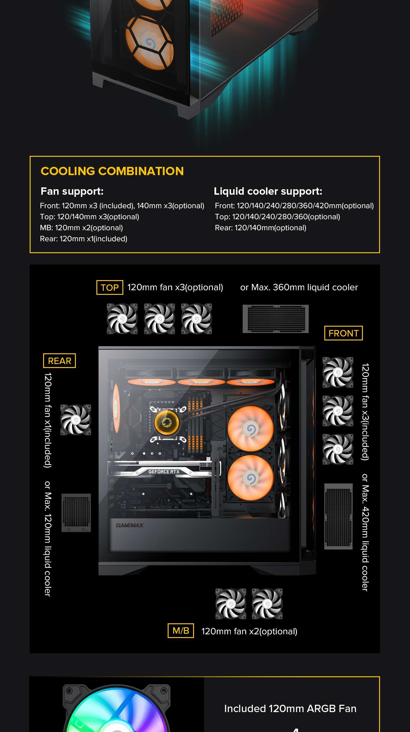 | Water Cooling Support (Radiator Size) | Front | 120mm, 140mm,240mm,280mm,360mm,420mm |