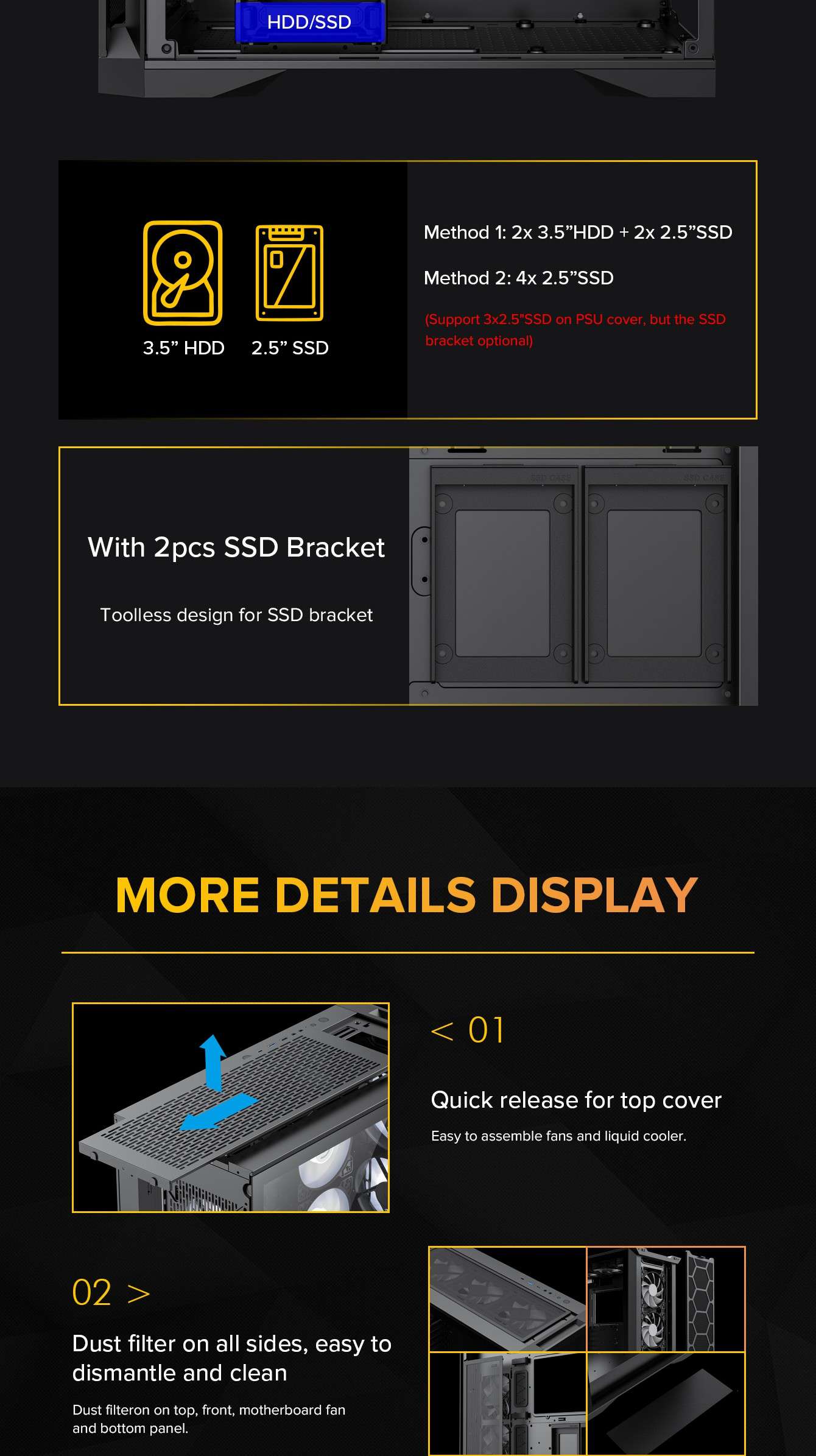 | 2*3.5HDD+2*2.5SSD+3*2.5SSD(Optional) or 0*3.5HDD+4*2.5SSD+3*2.5SSD (Optional) | ||