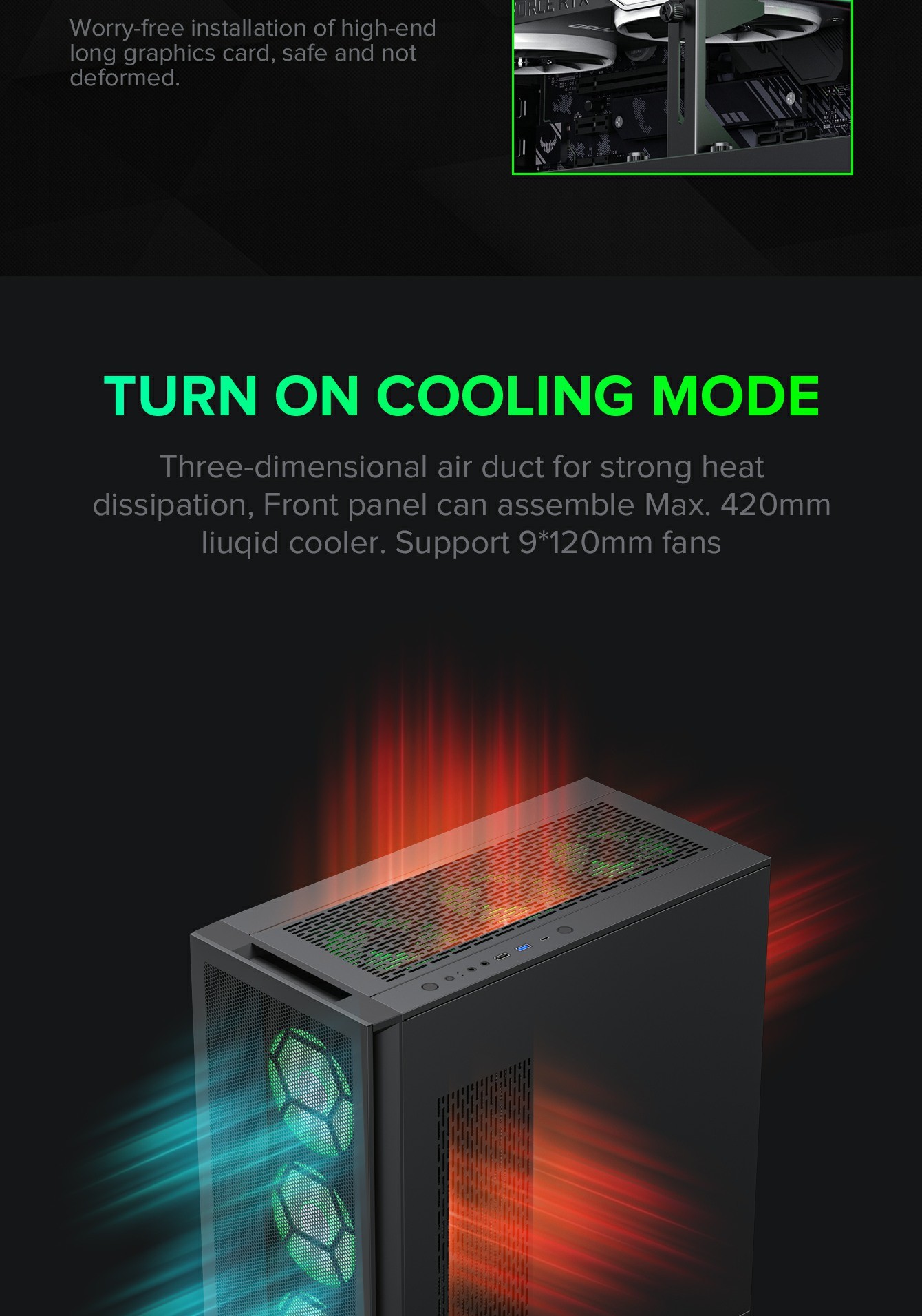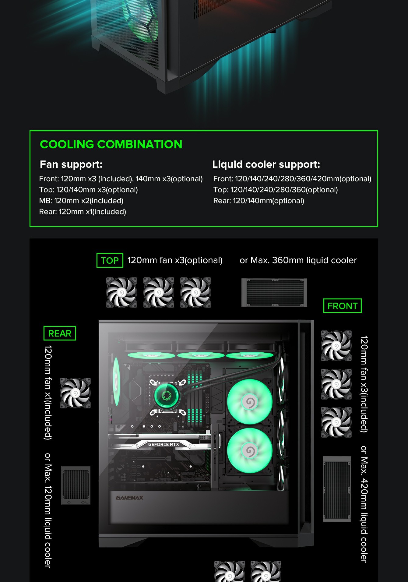 | Water Cooling Support (Radiator Size) | Front | 120mm, 140mm,240mm,280mm,360mm,420mm |