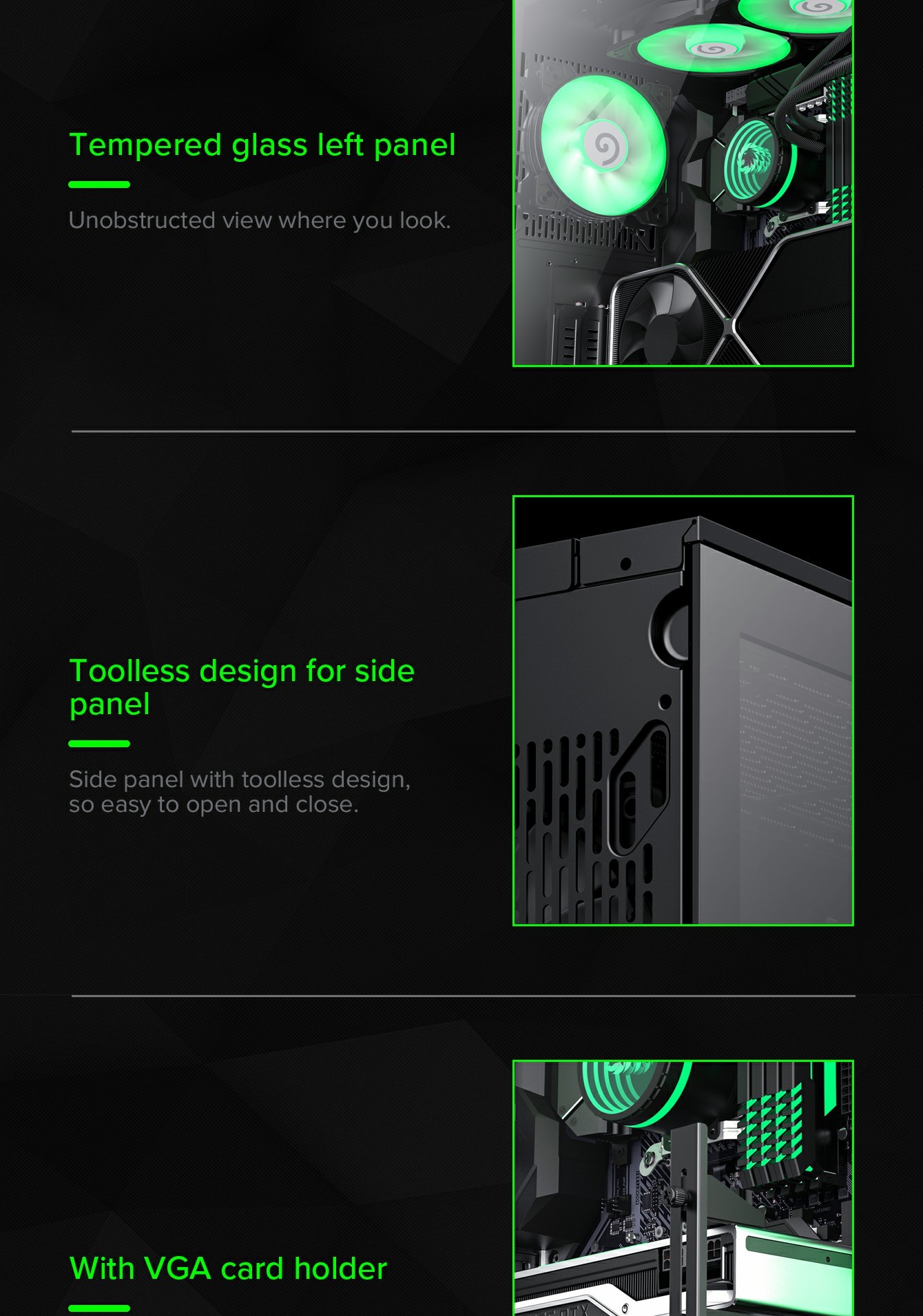 • Tempered Glass Side Panel: Improves cooling by 76%, makes cleaning easier, and facilitates component installation.