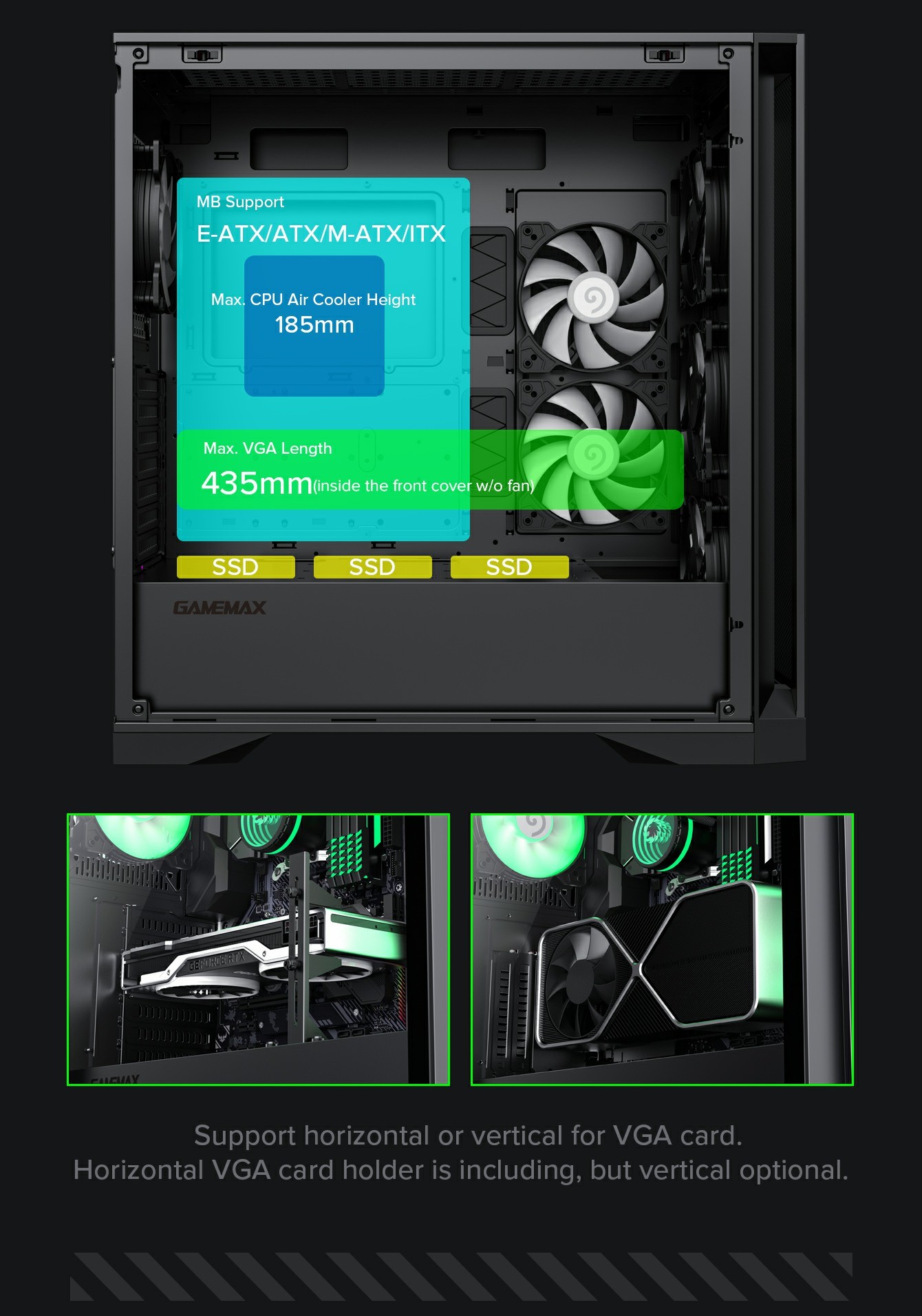 | VGA Card Length | Up to 435mm(front cover w/o fan) (Vertical graphics card support) | |
