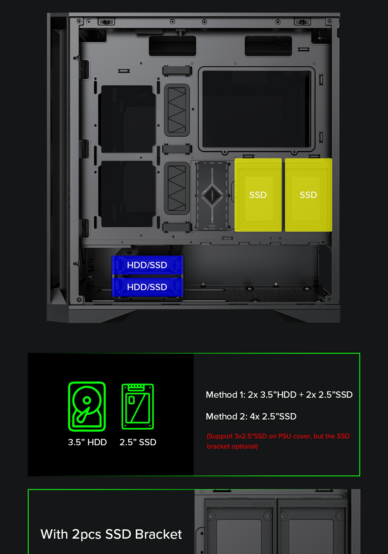 • Spacious Interior: Supports radiators up to 420 mm and up to 4 SSDs or 2 SSDs + 2 HDDs.