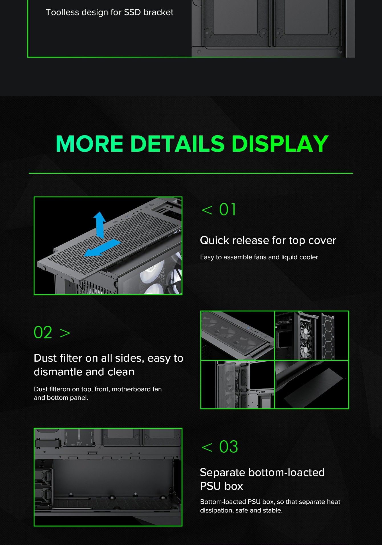 | Dust Cover | Bottom, front cover, right side panel and top cover with dust filter | |
