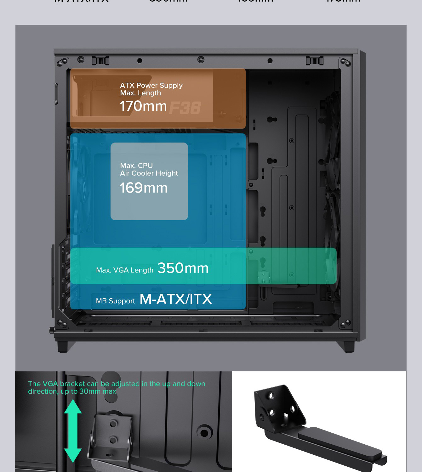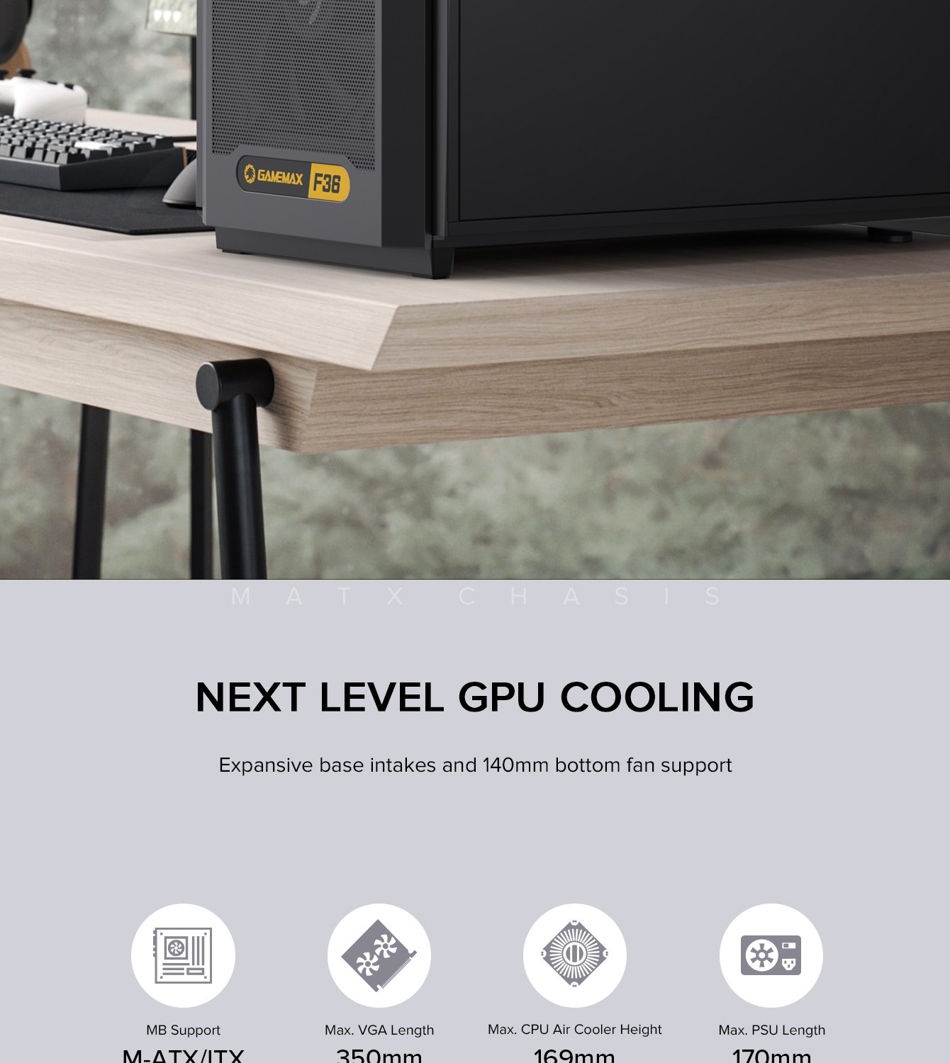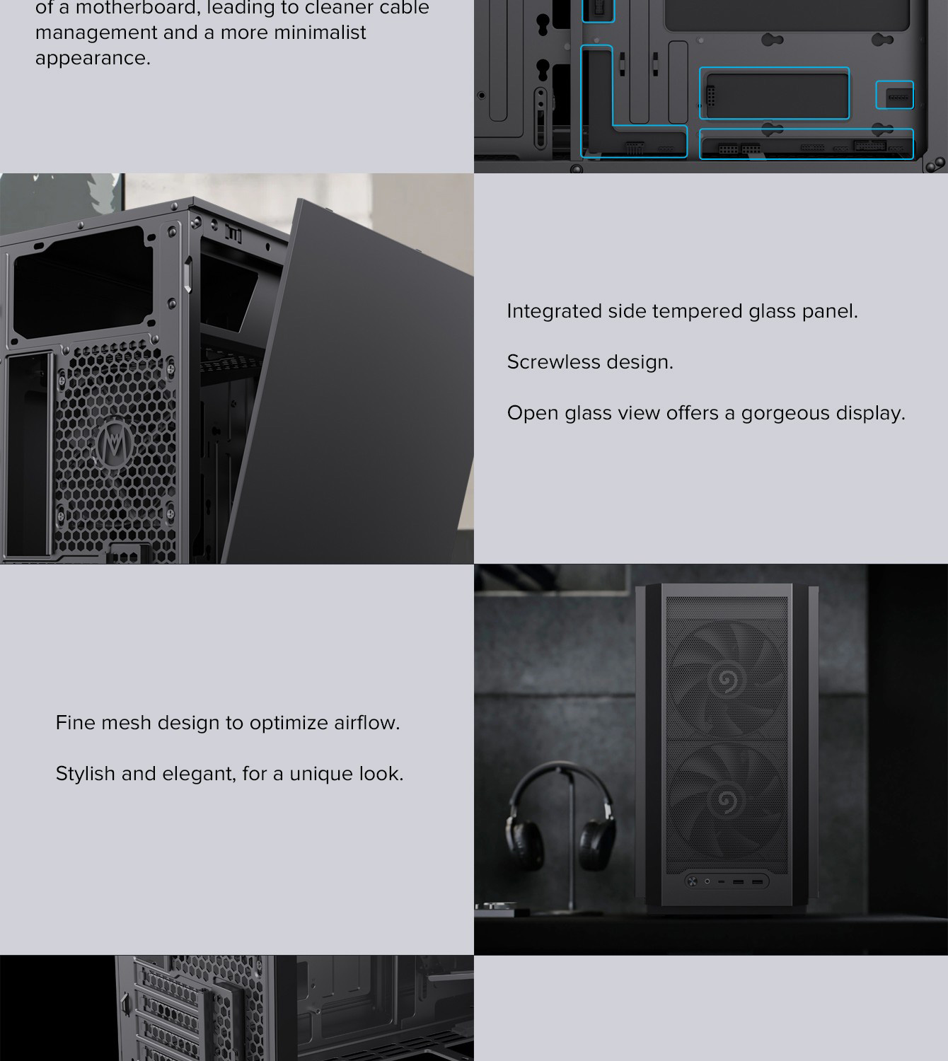 • Compatible con placas base MATX y configuraciones de placa base, con soporte para tarjetas gráficas de 4.5 ranuras.