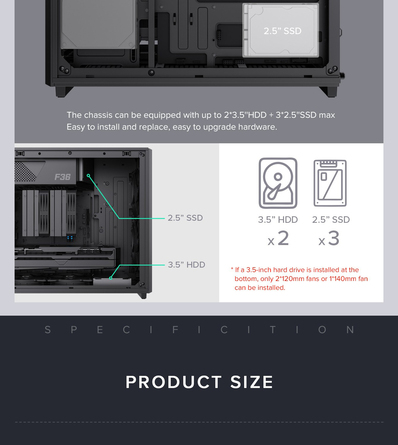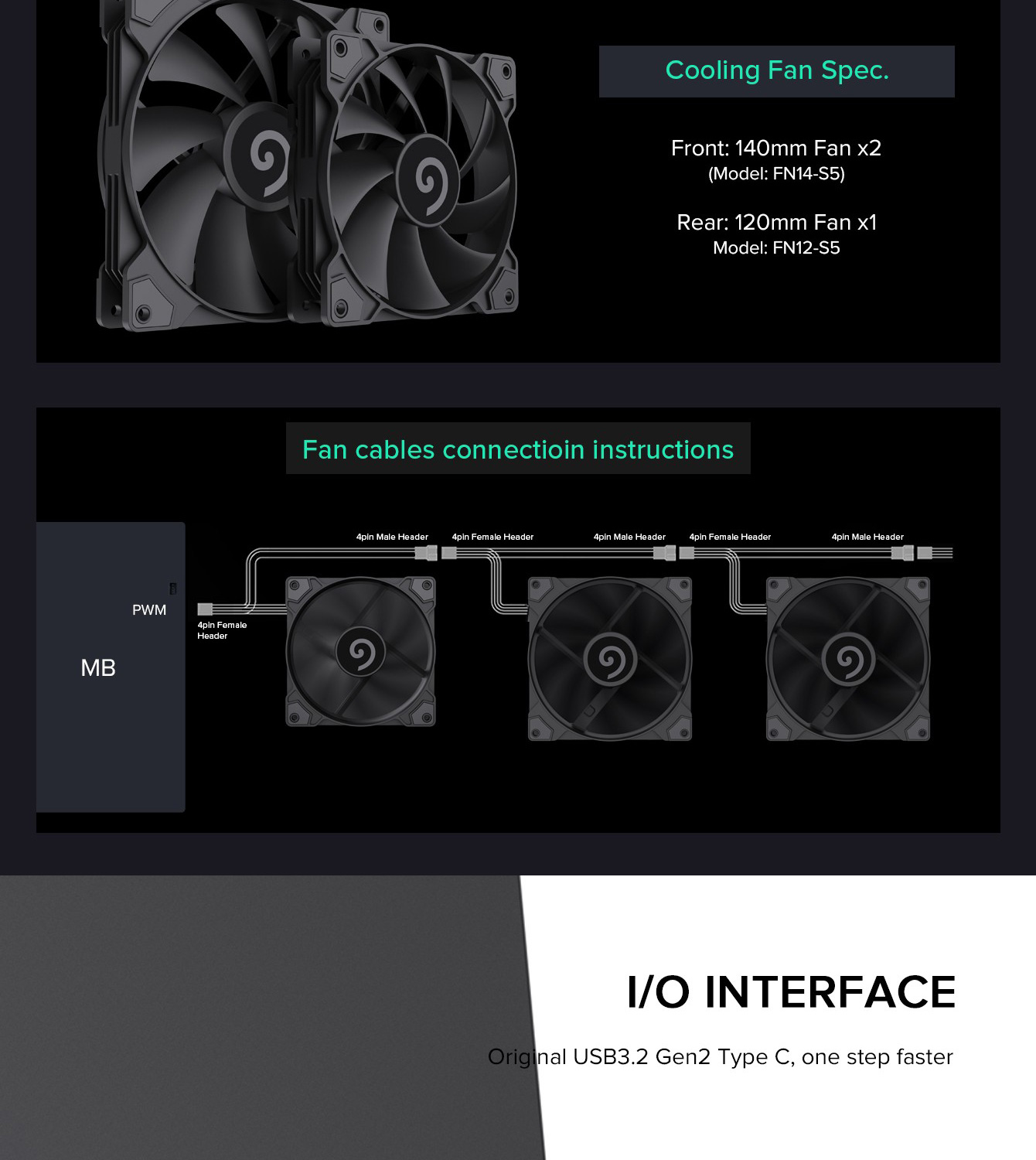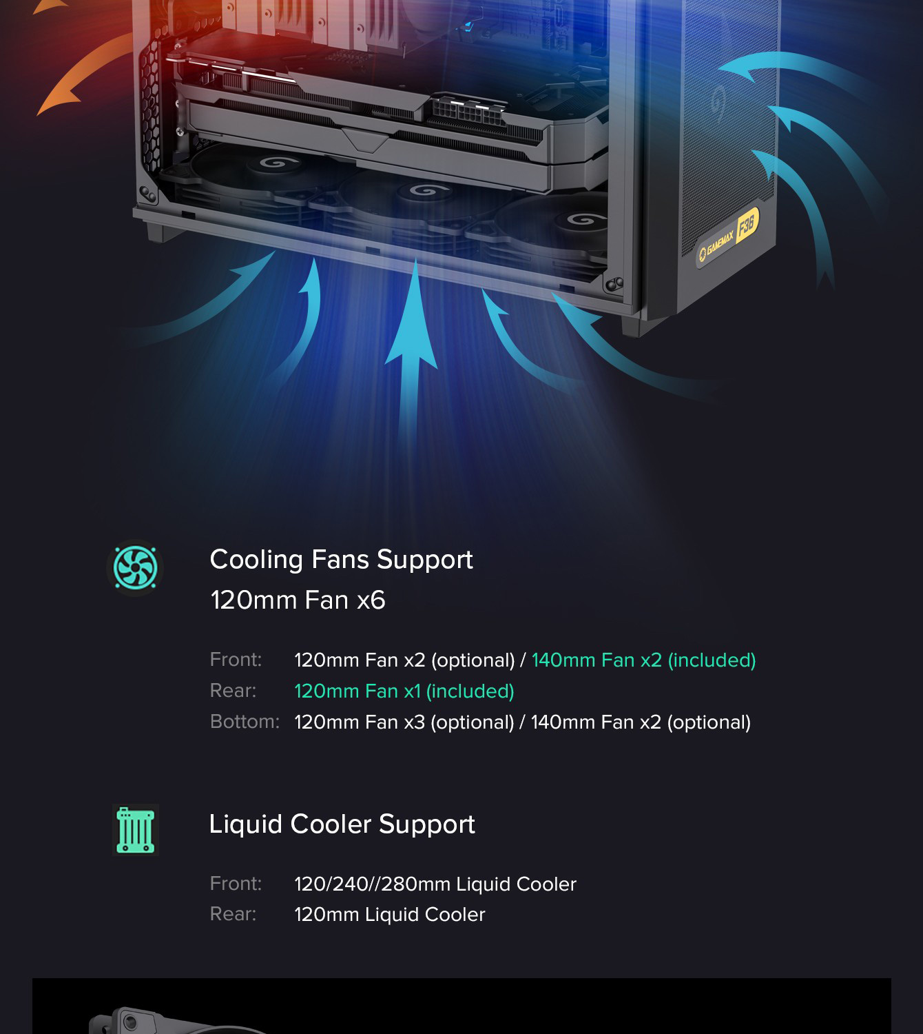 | Cooling Fan Support | Front | 2x 120mm (included) / 2x 140mm (optional) |