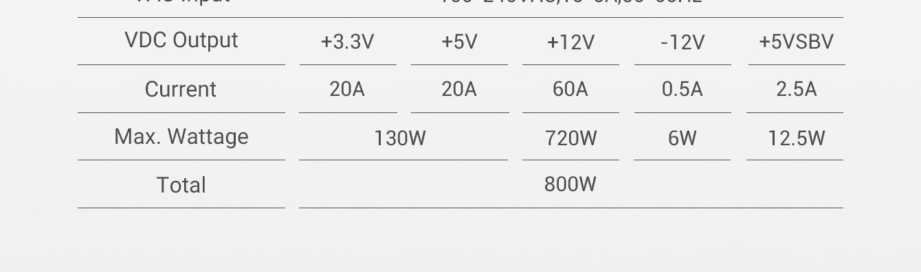 | DC Output Max | +3.3V | +5V | +12V | -12V | +5VSB |