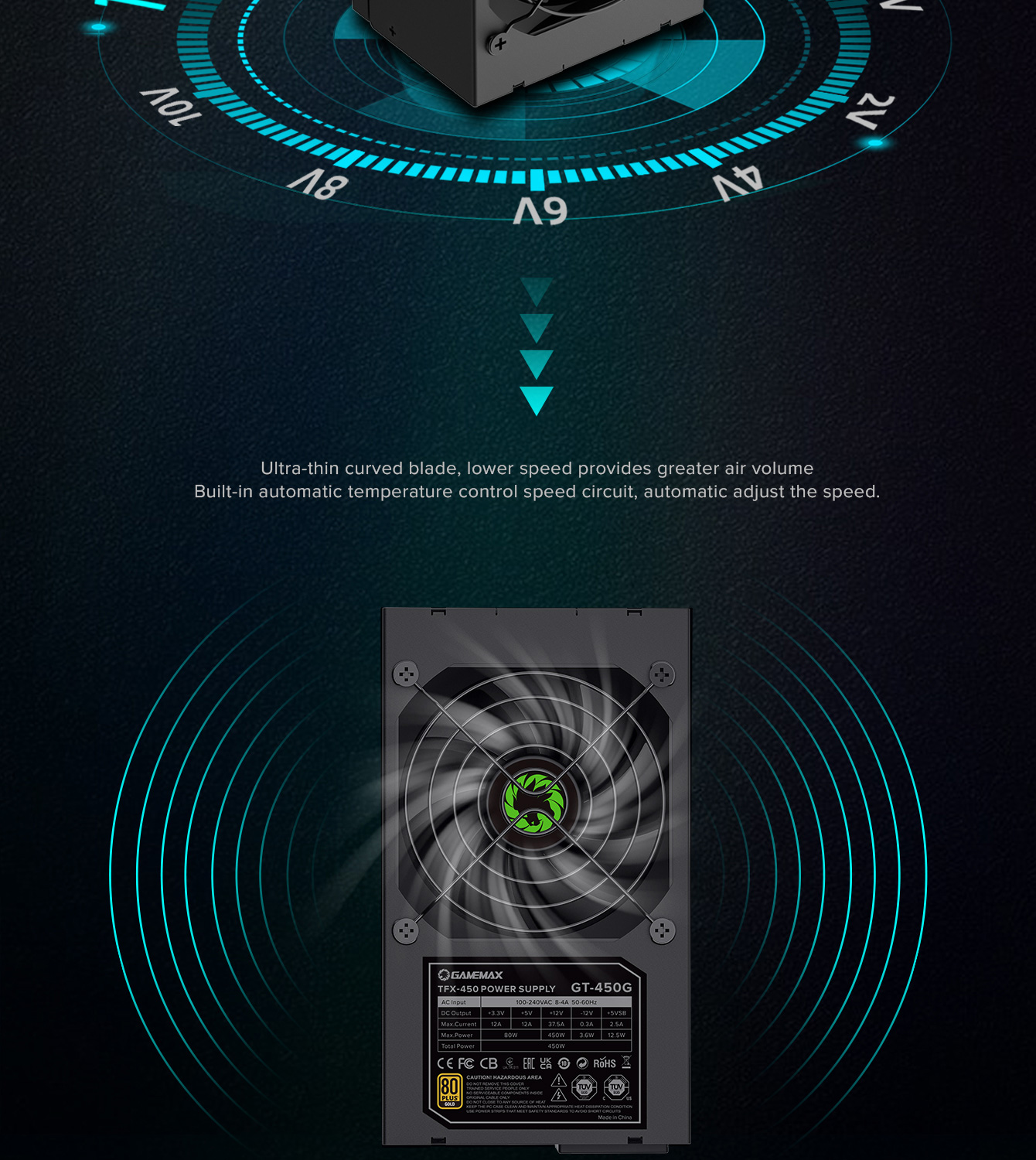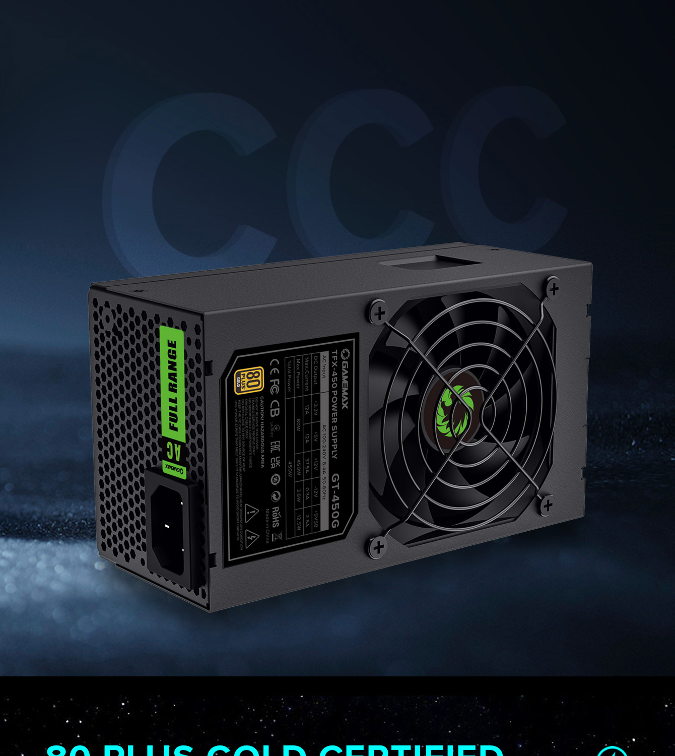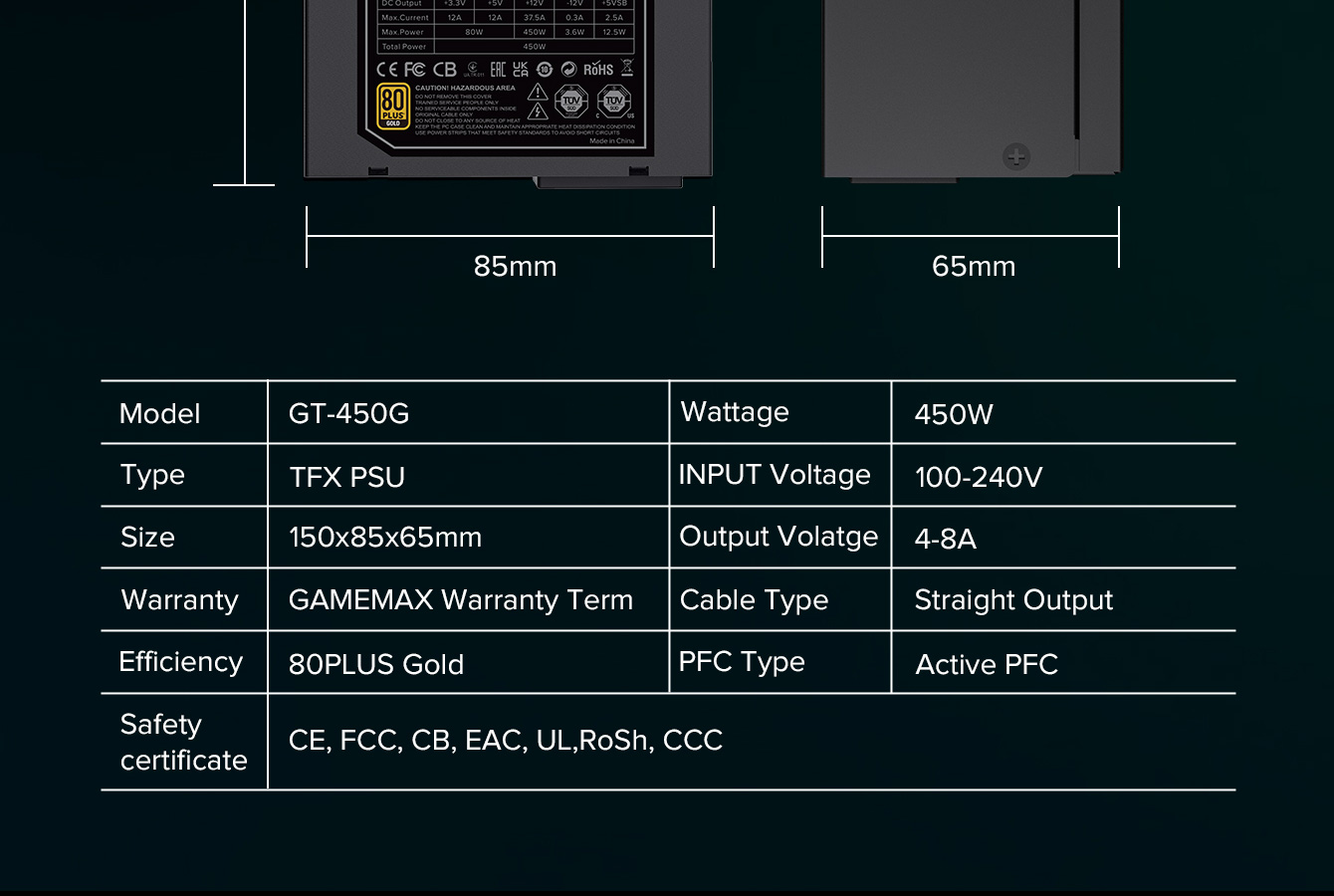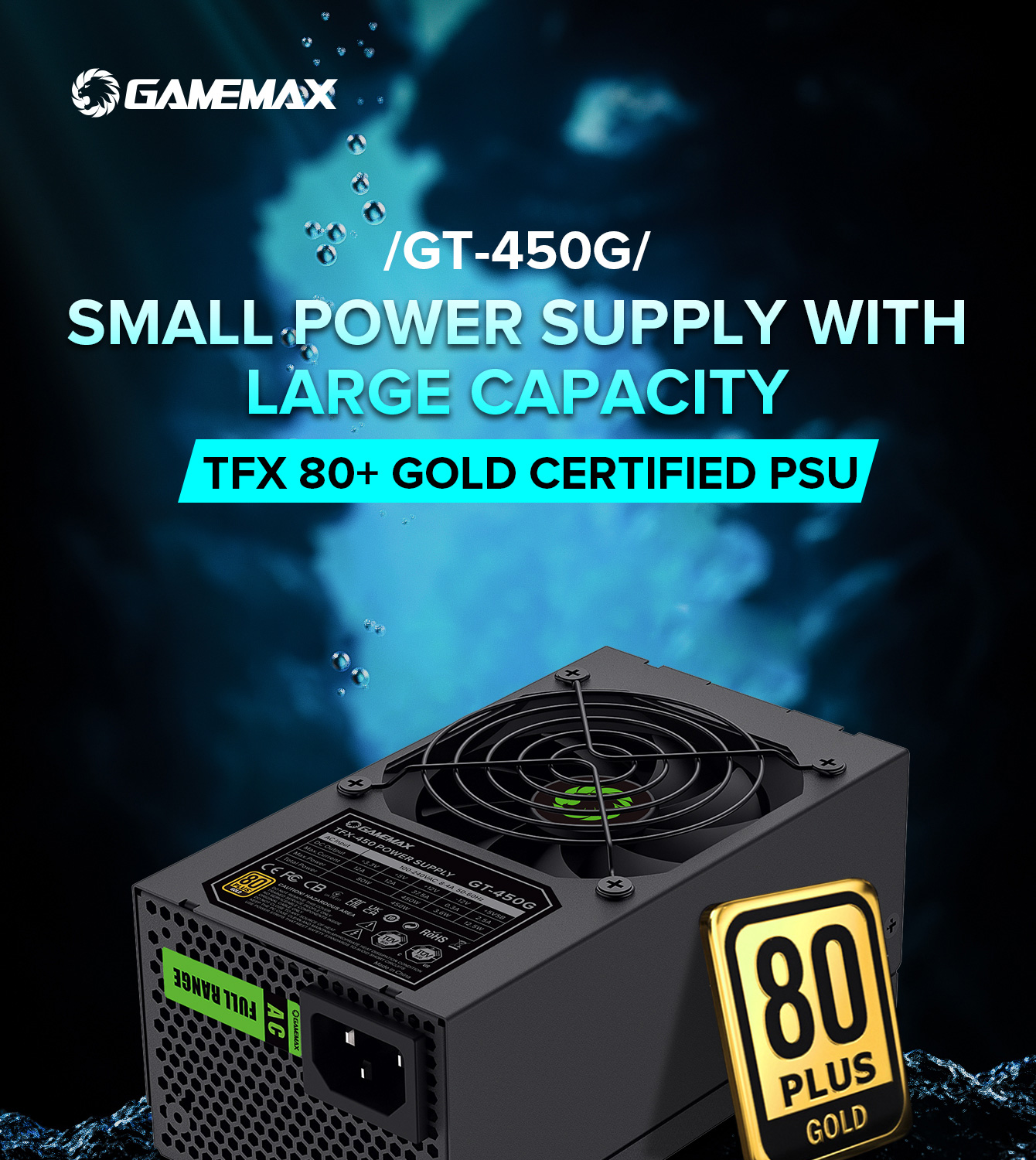 GameMax TFX 450 Gold, is certified for 80 PLUS Gold, this active PFC unit runs at a max of 90% efficiency, Silent running 80mm fan with 18 dBA minimum, and Single PCI-E 6+2pin connectors support,