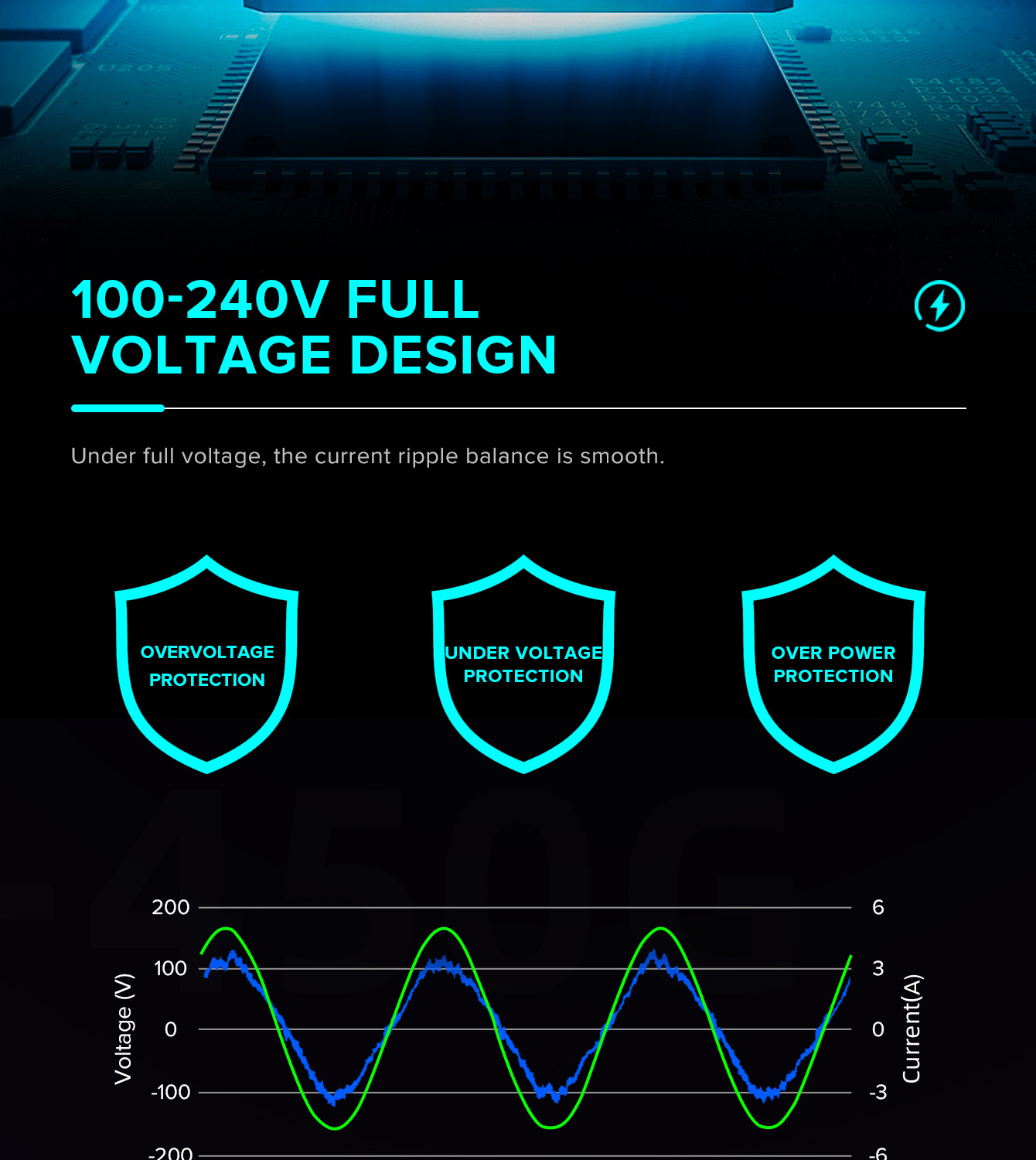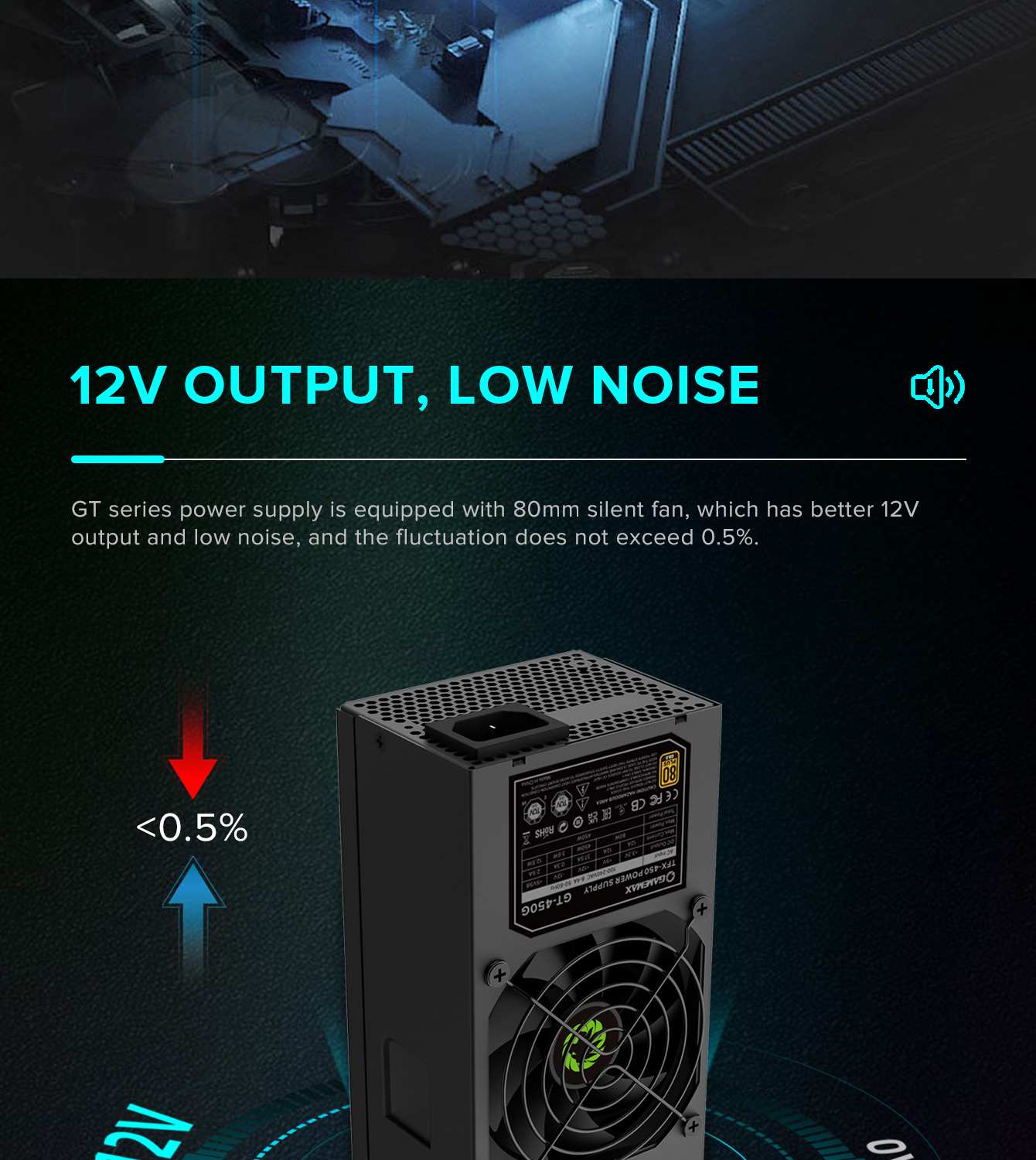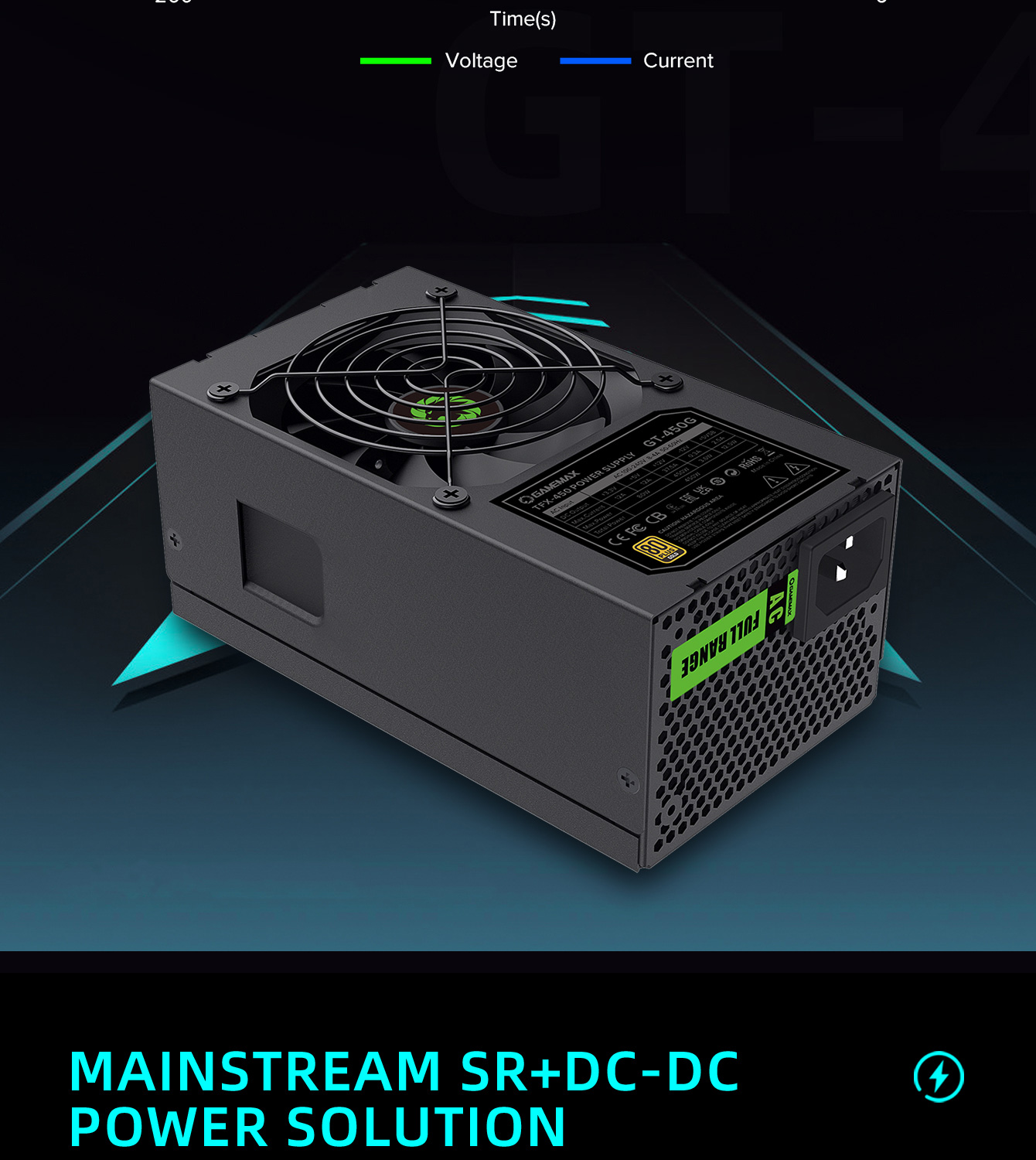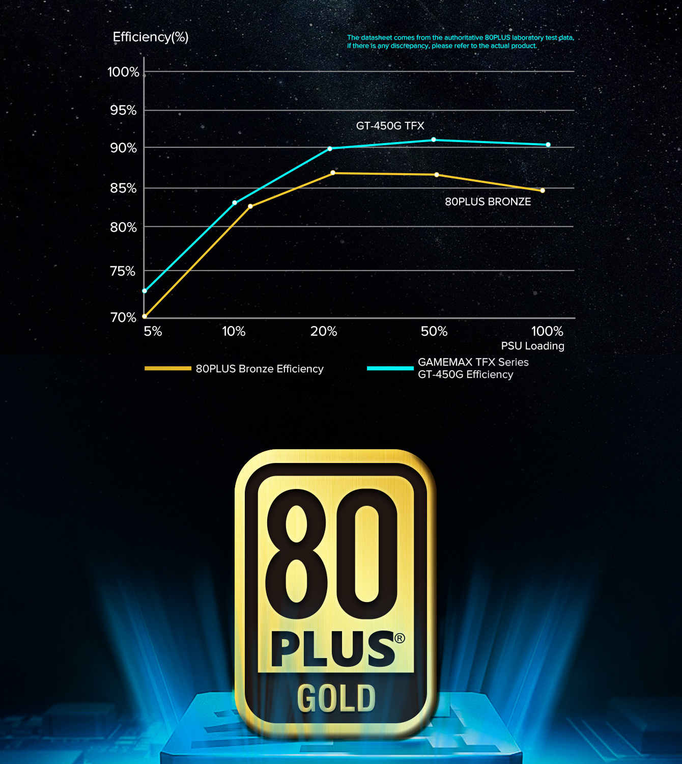 GameMax TFX 450 Gold, is certified for 80 PLUS Gold, this active PFC unit runs at a max of 90% efficiency,