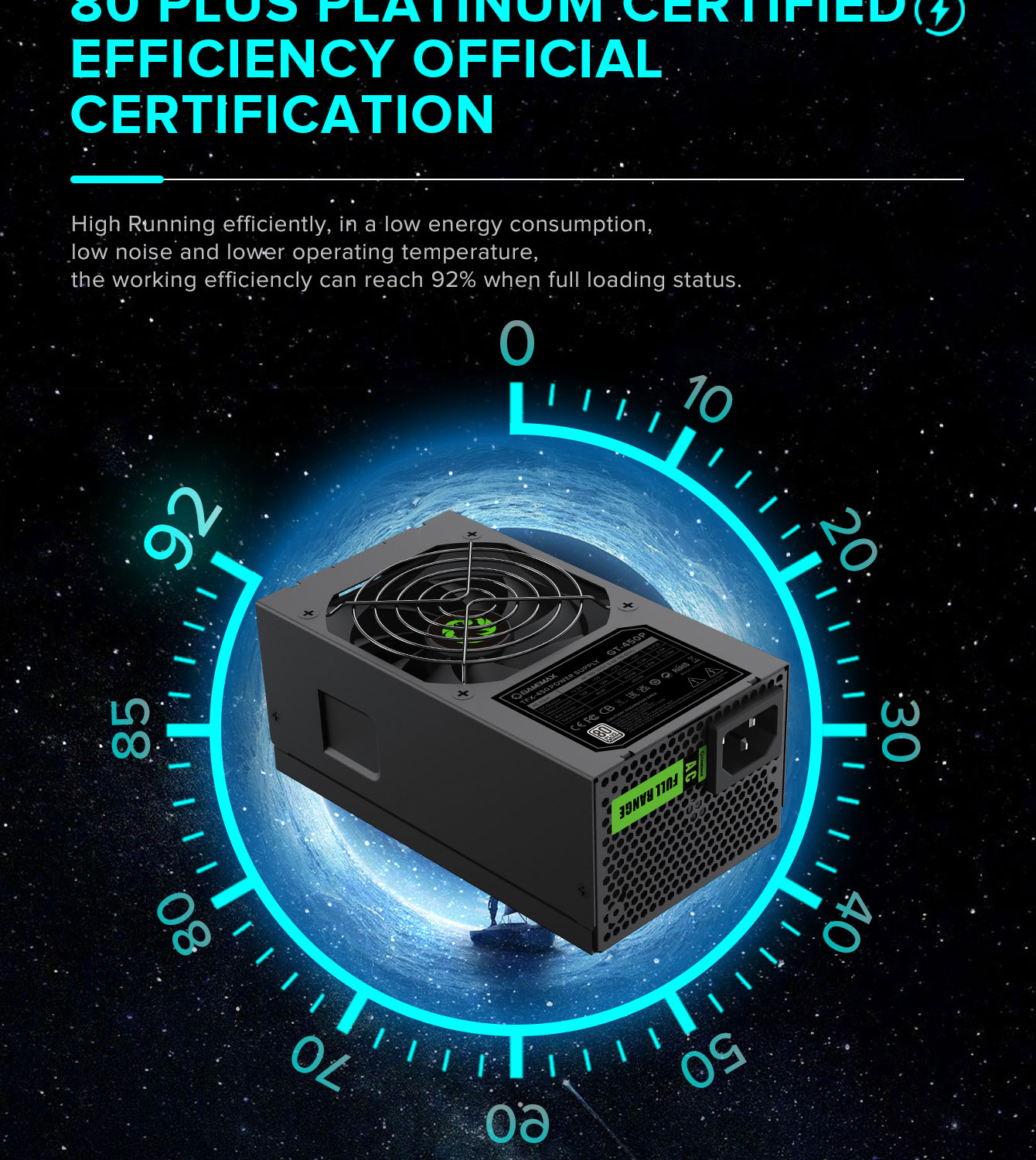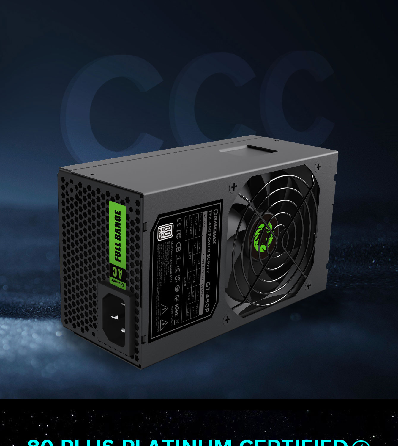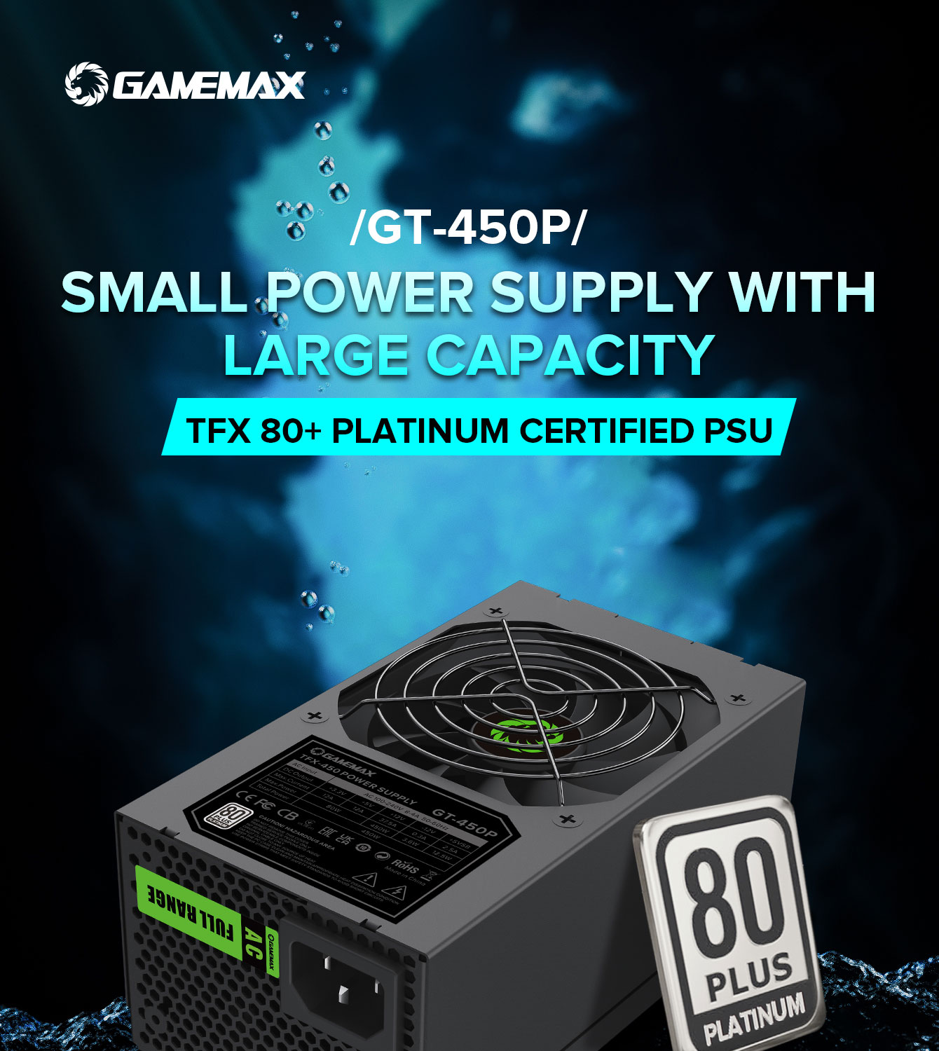 GameMax TFX 450w 80 Plus Platinum PSUs, this active PFC unit runs at a max of 92% efficiency, Silent running 80mm fan with 18 dBA minimum, and Single PCI-E 6+2pin connectors support,