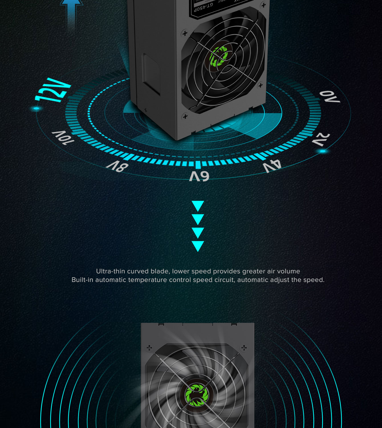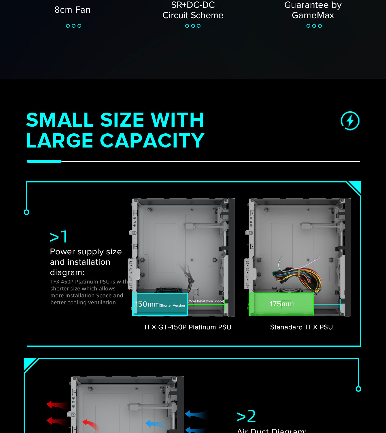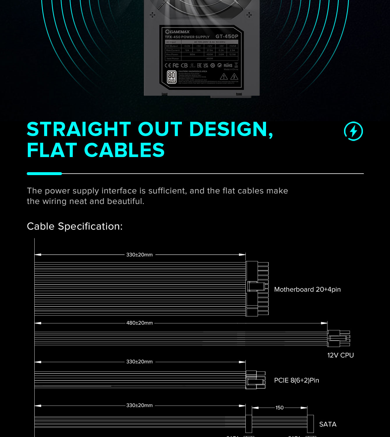 GameMax TFX 450w 80 Plus Platinum PSUs, this active PFC unit runs at a max of 92% efficiency, Silent running 80mm fan with 18 dBA minimum, and Single PCI-E 6+2pin connectors support,