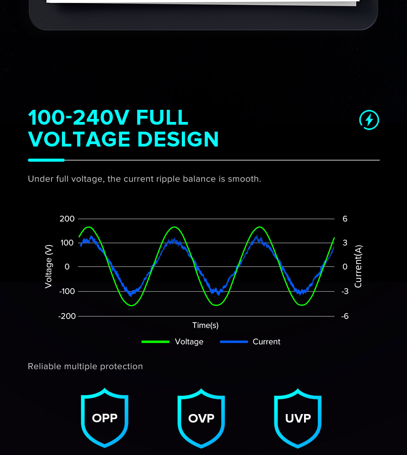 · Multiple protection including OVP, UVP, OCP, OPP, OTP, OLP and SCP