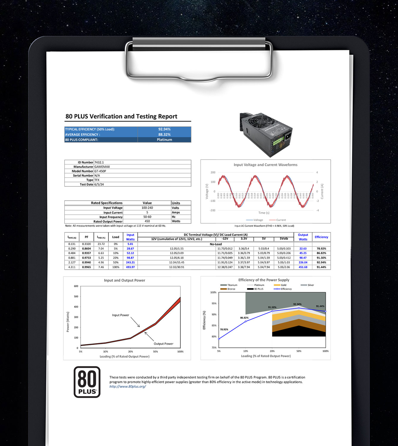 GameMax TFX 450 Platinum standard, this active PFC unit runs at a max of 92% efficiency,