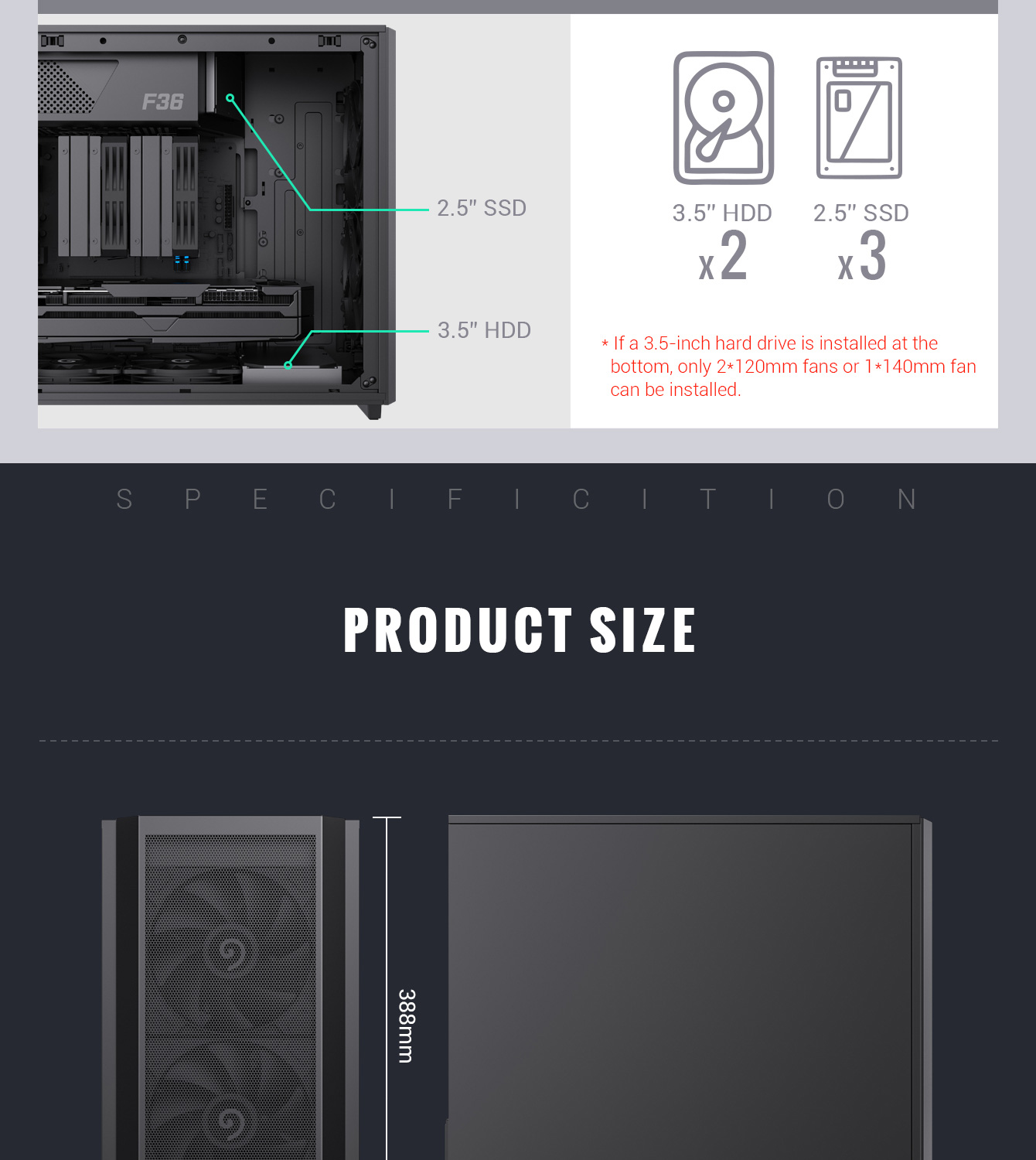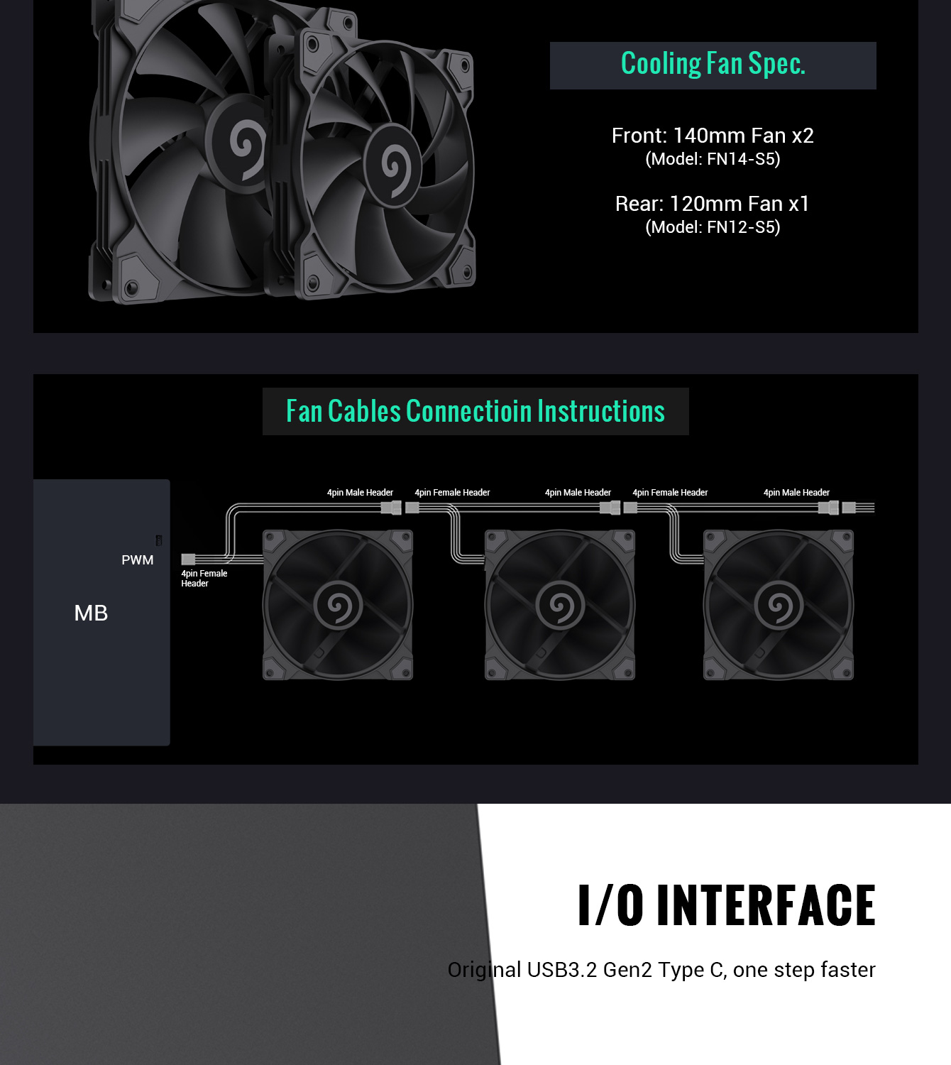 | Cooling Fan Support | Front | 2x120mm (Fan optional),2x140mm (GMX-WFBK-PWM included) |