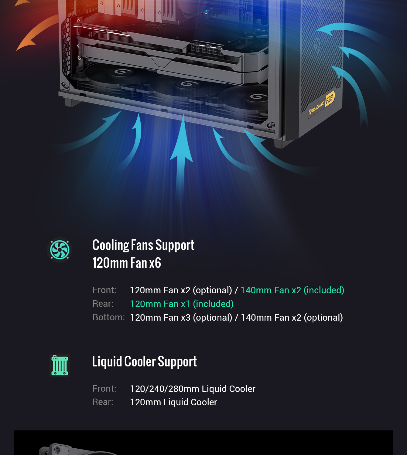 | Bottom | 3x120 or 2x140mm (Fan optional) | |