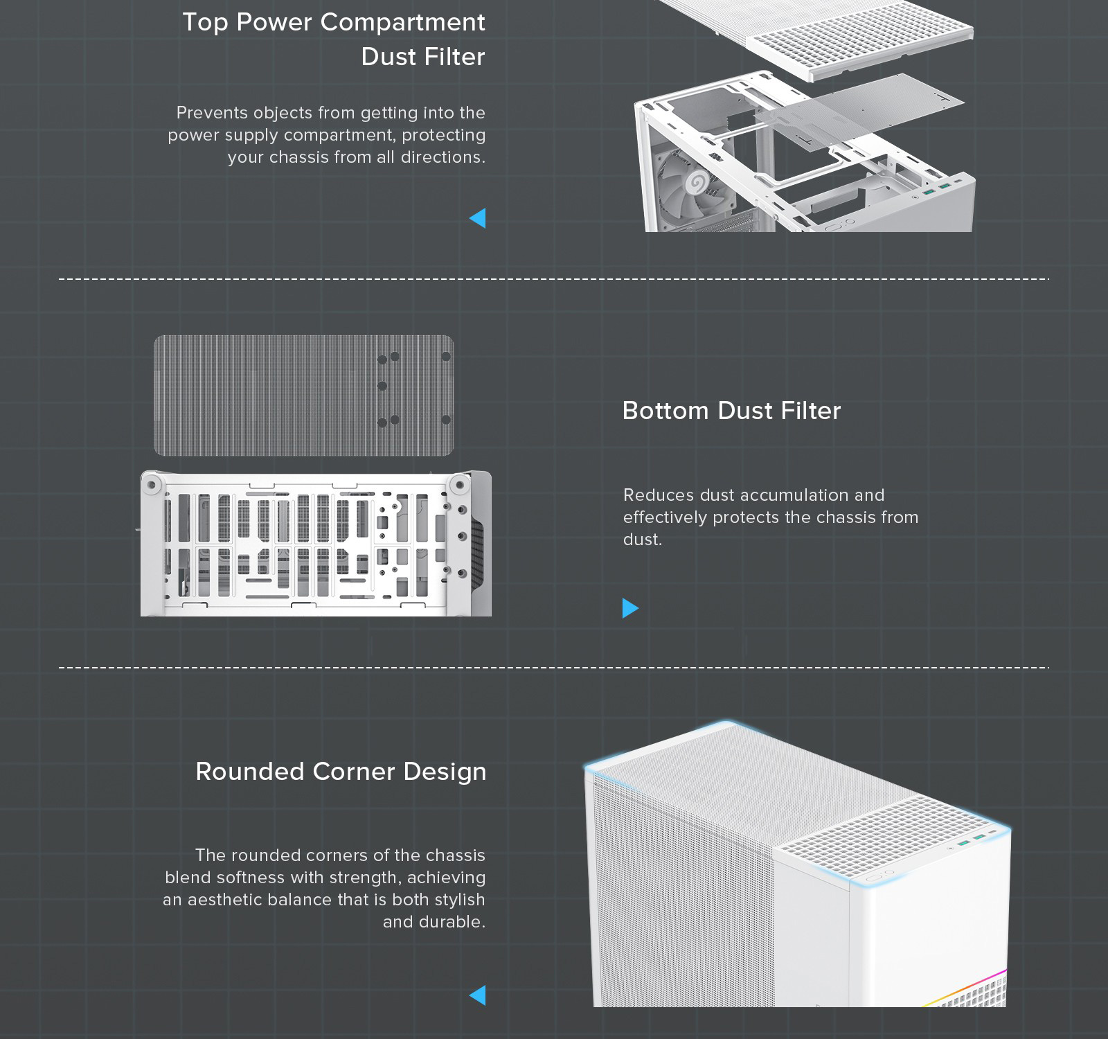 • Dust Prevention: Equipped with dust covers on the bottom, top, and front panels