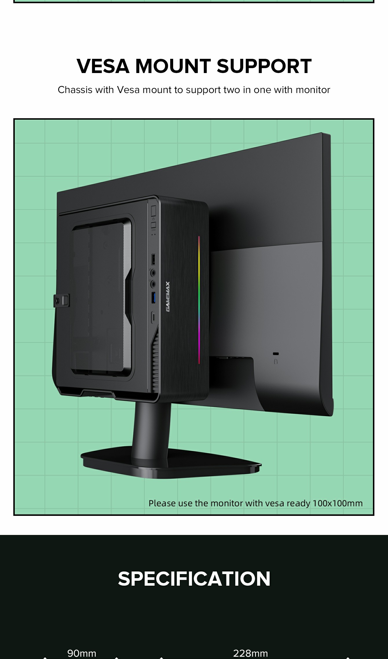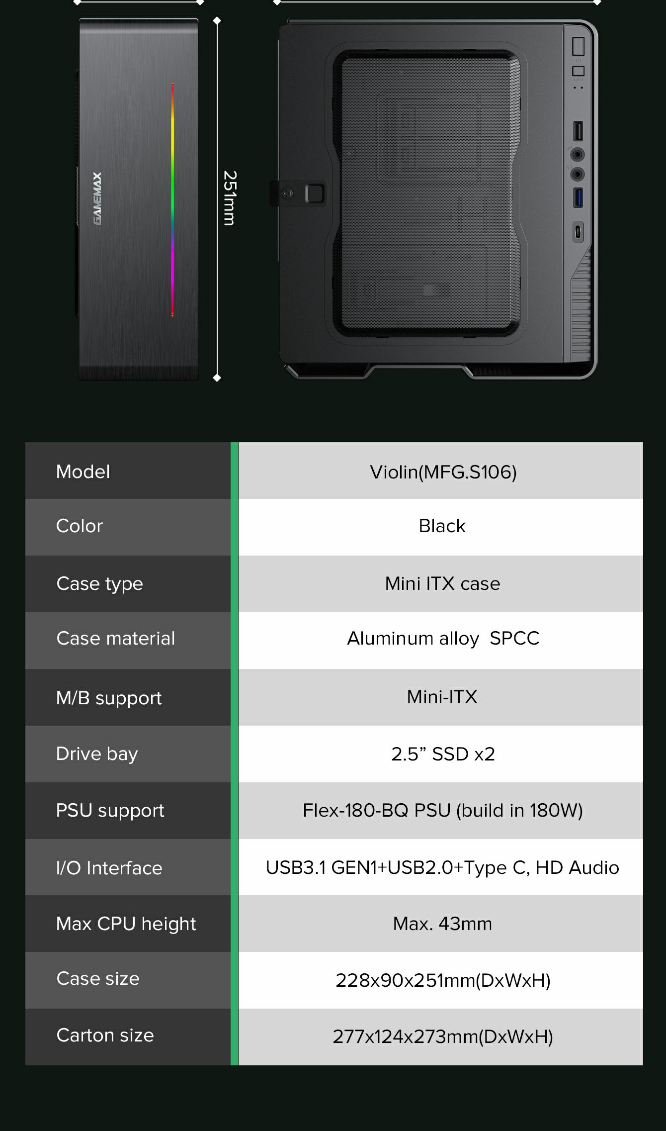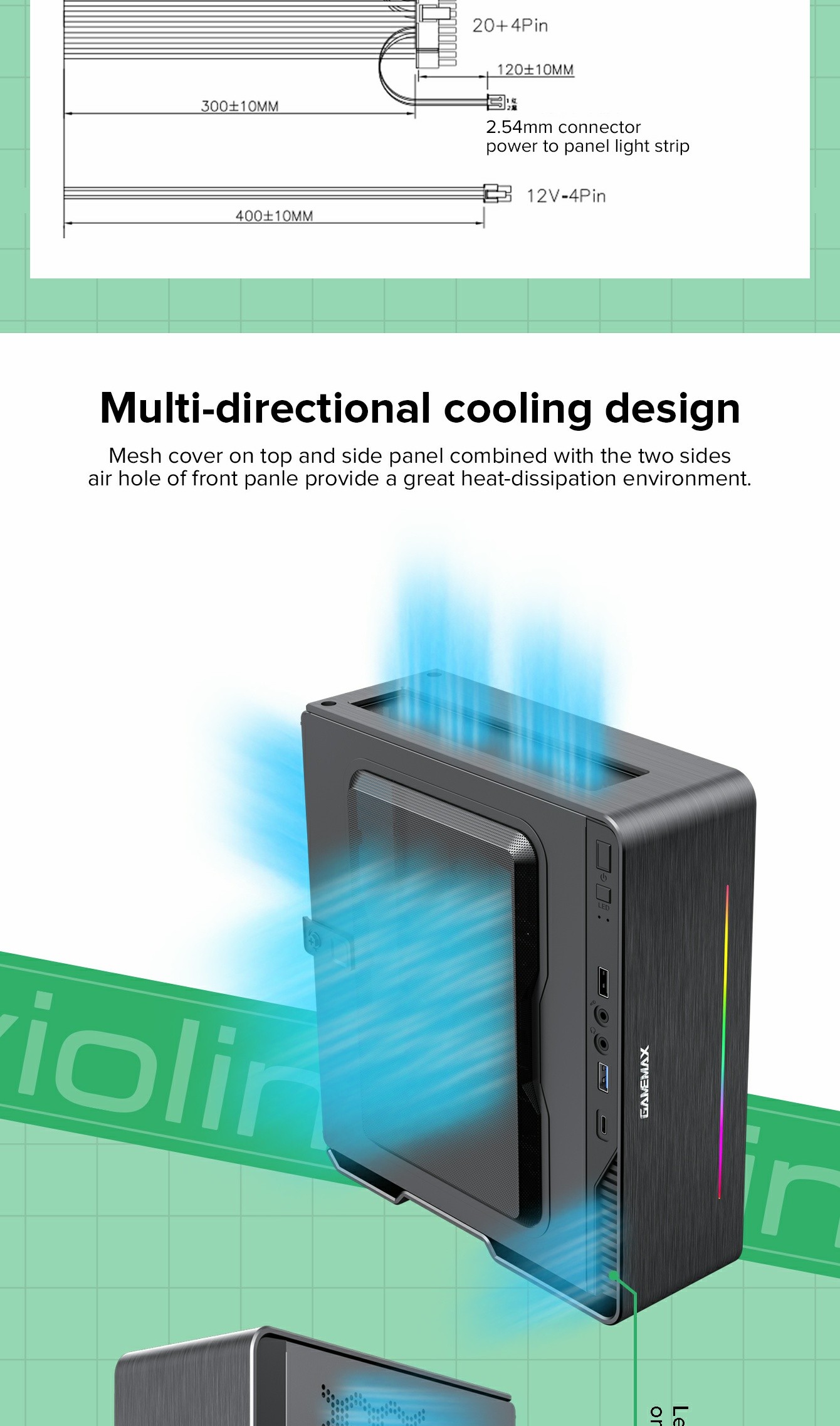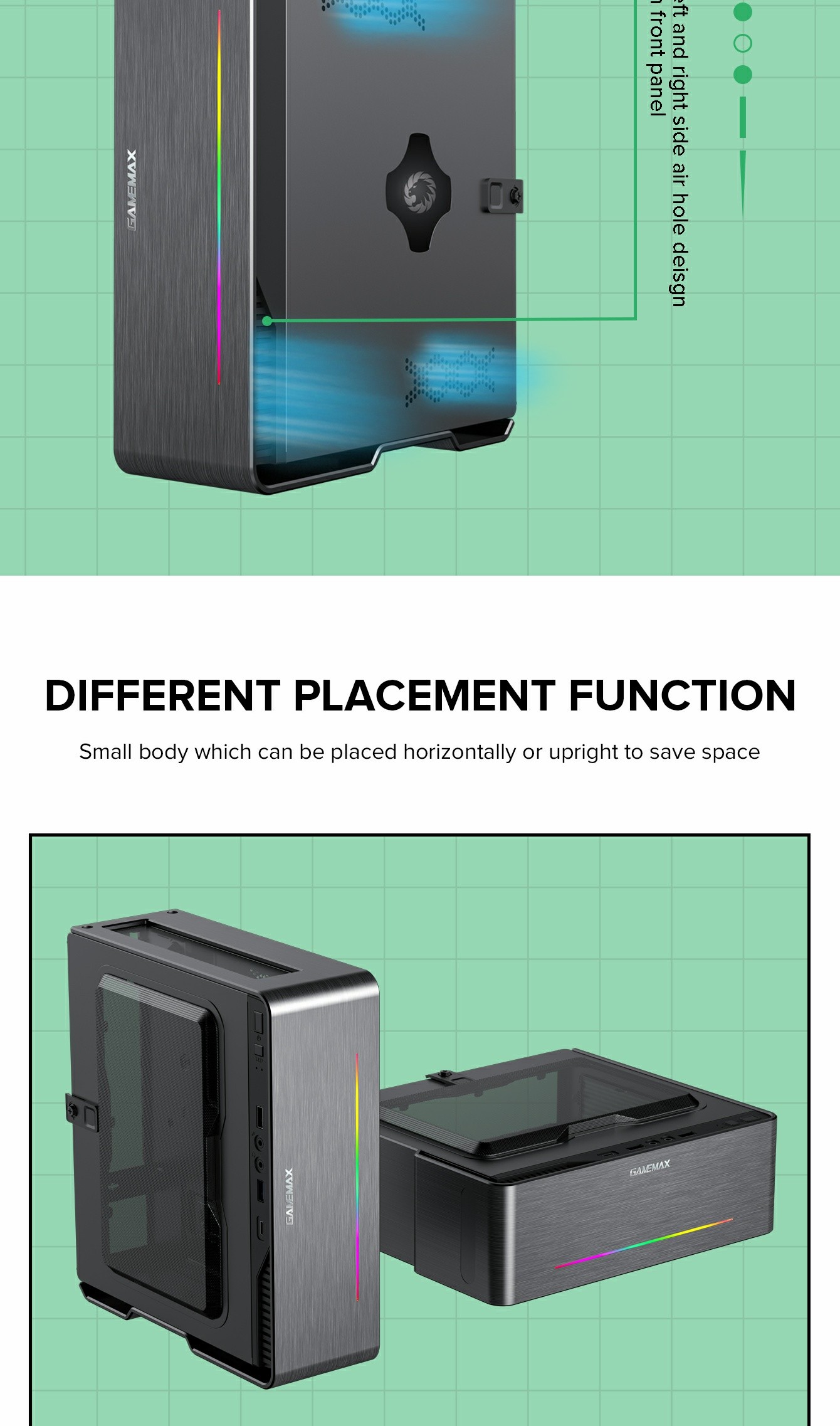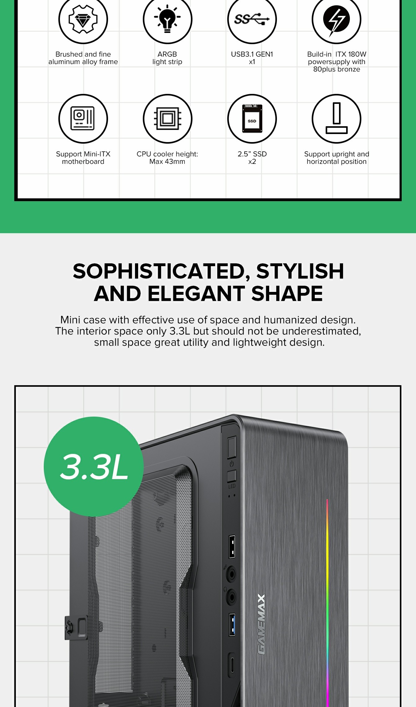 Small, Smart, Sleek, and ARGB strip on the front! Perforated mesh panels, with a powerful 180W 80+ APFC PSU features lower noise and maximum efficiency.