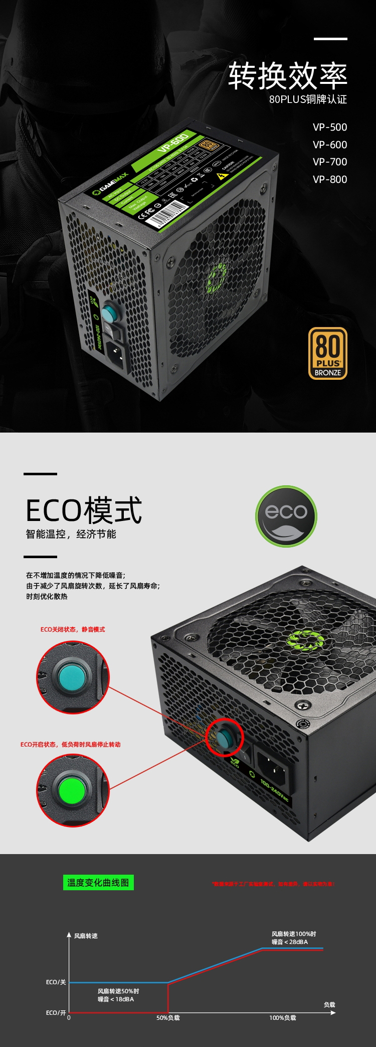 ECO 开关具有”0“分贝噪音管理,当电脑处于待机状态时,风扇可停止转动,可提加产品使用时间。当输出功率增加,风扇又会自动变速转动
